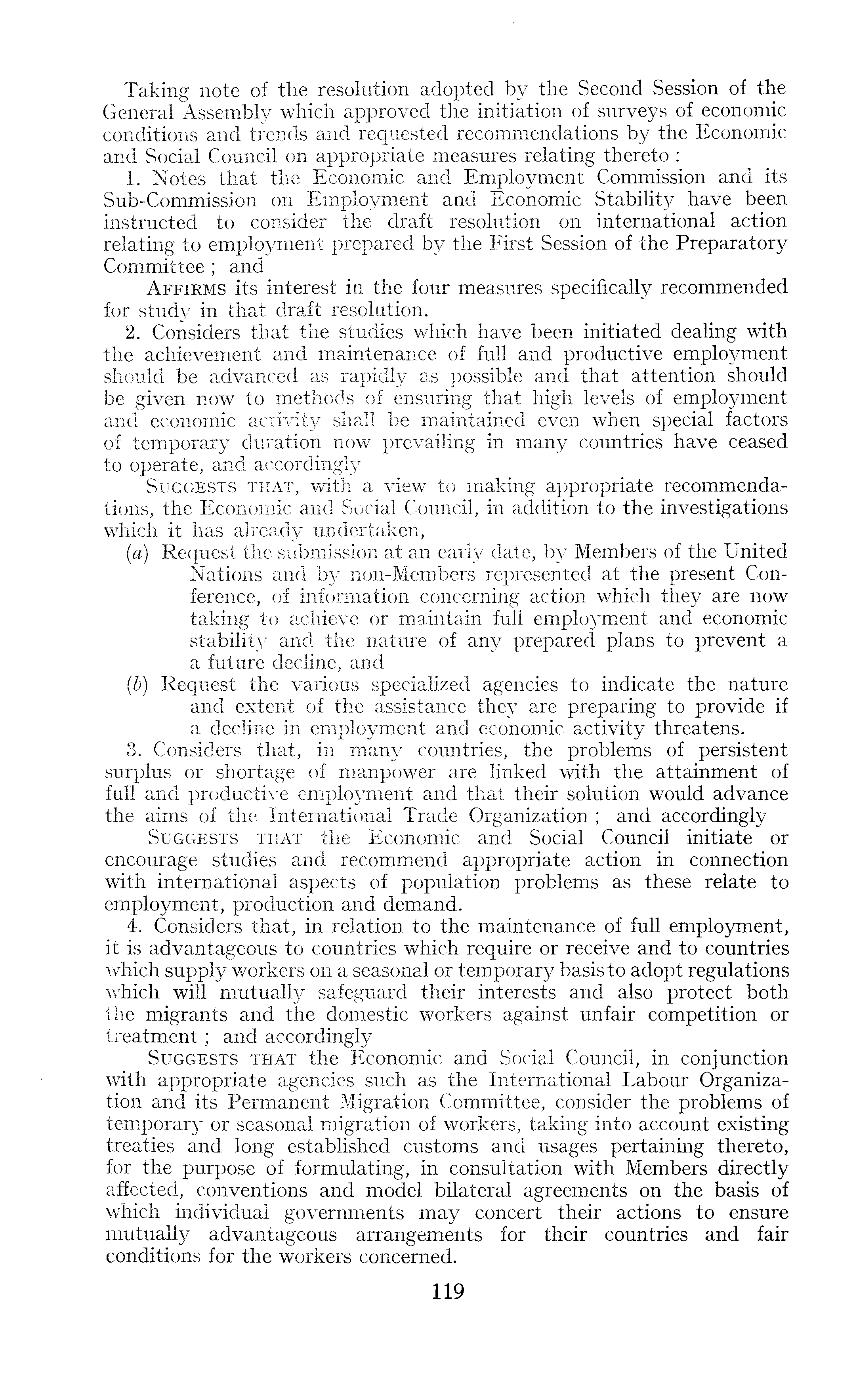 Taking note of the resolution adopted by the Second Session of the General Assembly which approved the initiation of surveys of economic conditions and trends and requested recommendations by the Economic and Social Council on appropriate measures relating thereto : 1. Notes that the Economic and Employment Commission and its Sub-Commission on Employment and Economic Stability have been instructed to consider the draft resolution on international action relating to employment prepared by the First Session of the Preparatory Committee ; and Affirms its interest in the four measures specifically recommended for study in that draft resolution. 2. Considers that the studies which have been initiated dealing with the achievement and maintenance of full and productive employment should be advanced as rapidly as possible and that attention should be given now to methods of ensuring that high levels of employment and economic activity shall be maintained even when special factors of temporary duration now prevailing in many countries have ceased to operate, and accordingly Suggests that, with a view to making appropriate recommendations, the Economic and Social Council, in addition to the investigations which it has already undertaken, (a) Request the submission at an early date, by Members of the United Nations and by non-Members represented at the present Conference, of information concerning action which they are now taking to achieve or maintain full employment and economic stability and the nature of any prepared plans to prevent a a future decline, and (b) Request the various specialized agencies to indicate the nature and extent of the assistance they are preparing to provide if a decline in employment and economic activity threatens. 3. Considers that, in many countries, the problems of persistent surplus or shortage of manpower are linked with the attainment of full and productive employment and that their solution would advance the aims of the International Trade Organization ; and accordingly Suggests that the Economic and Social Council initiate or encourage studies and recommend appropriate action in connection with international aspects of population problems as these relate to employment, production and demand. 4. Considers that, in relation to the maintenance of full employment, it is advantageous to countries which require or receive and to countries which supply workers on a seasonal or temporary basis to adopt regulations which will mutually safeguard their interests and also protect both the migrants and the domestic workers against unfair competition or treatment; and accordingly Suggests that the Economic and Social Council, in conjunction with appropriate agencies such as the International Labour Organization and its Permanent Migration Committee, consider the problems of temporary or seasonal migration of workers, taking into account existing treaties and long established customs and usages pertaining thereto, for the purpose of formulating, in consultation with Members directly affected, conventions and model bilateral agreements on the basis of which individual governments may concert their actions to ensure mutually advantageous arrangements for their countries and fair conditions for the workers concerned.