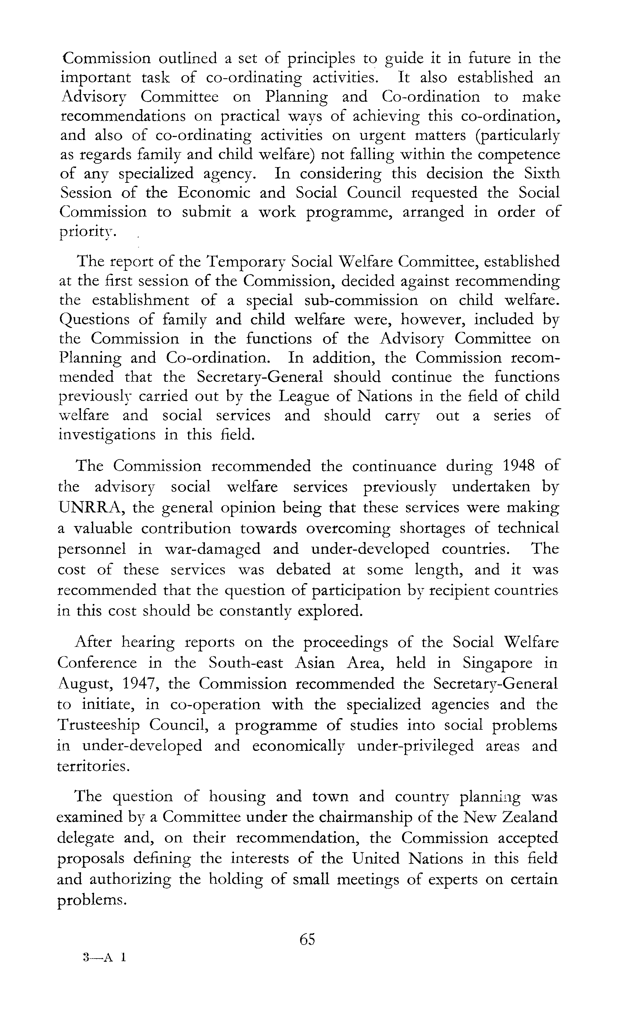 Commission outlined a set of principles to guide it in future in the important task of co-ordinating activities. It also established an Advisory Committee on Planning and Co-ordination to make recommendations on practical ways of achieving this co-ordination, and also of co-ordinating activities on urgent matters (particularly as regards family and child welfare) not falling within the competence of any specialized agency. In considering this decision the Sixth Session of the Economic and Social Council requested the Social Commission to submit a work programme, arranged in order of priority. The report of the Temporary Social Welfare Committee, established at the first session of the Commission, decided against recommending the establishment of a special sub-commission on child welfare. Questions of family and child welfare were, however, included by the Commission in the functions of the Advisory Committee on Planning and Co-ordination. In addition, the Commission recommended that the Secretary-General should continue the functions previously carried out by the League of Nations in the field of child welfare and social services and should carry out a series of investigations in this field. The Commission recommended the continuance during 1948 of the advisory social welfare services previously undertaken by UNRRA, the general opinion being that these services were making a valuable contribution towards overcoming shortages of technical personnel in war-damaged and under-developed countries. The cost of these services was debated at some length, and it was recommended that the question of participation by recipient countries in this cost should be constantly explored. After hearing reports on the proceedings of the Social Welfare Conference in the South-east Asian Area, held in Singapore in August, 1947, the Commission recommended the Secretary-General to initiate, in co-operation with the specialized agencies and the Trusteeship Council, a programme of studies into social problems in under-developed and economically under-privileged areas and territories. The question of housing and town and country planning was examined by a Committee under the chairmanship of the New Zealand delegate and, on their recommendation, the Commission accepted proposals defining the interests of the United Nations in this field and authorizing the holding of small meetings of experts on certain problems.
