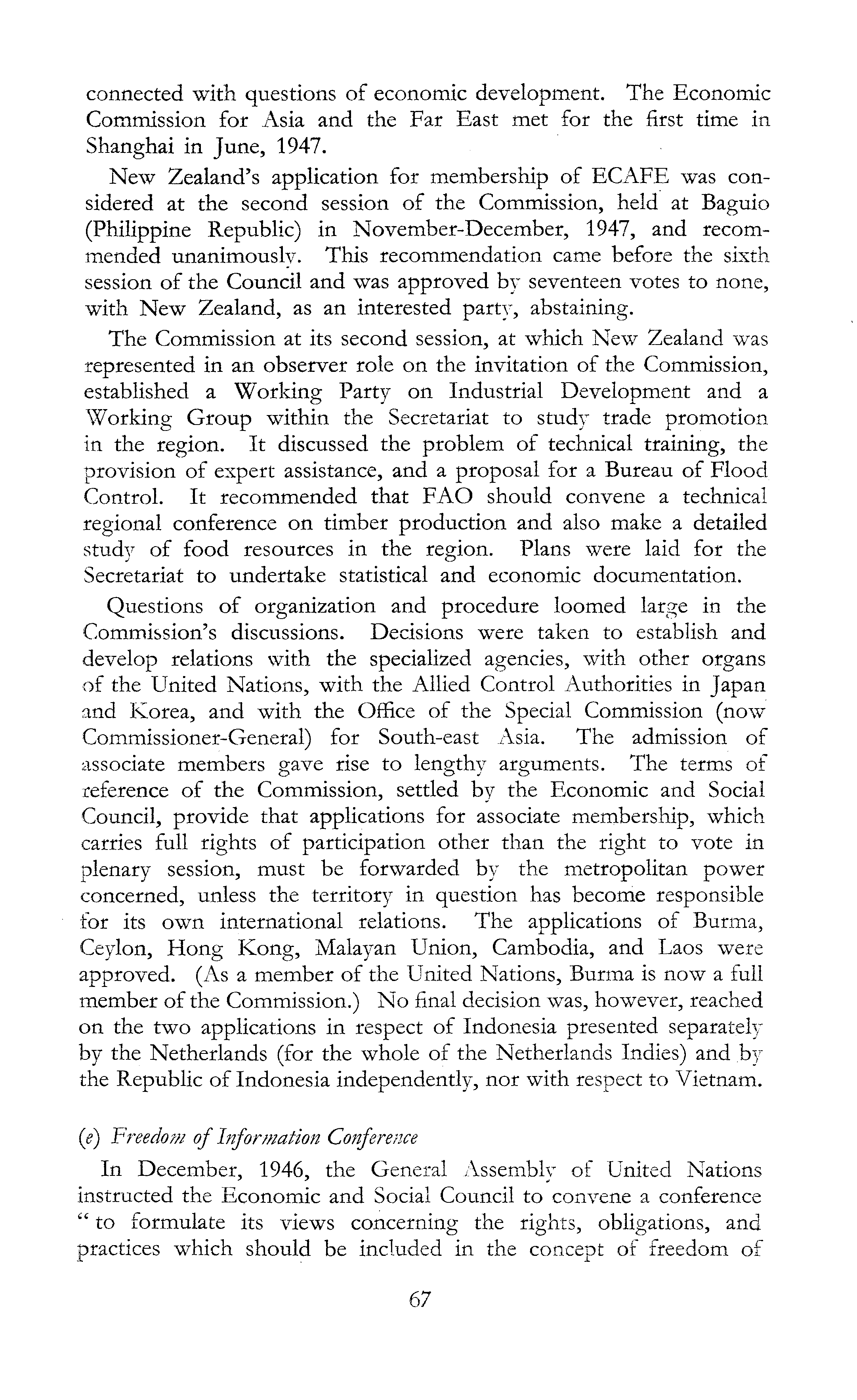 connected with questions of economic development. The Economic Commission for Asia and the Far East met for the first time in Shanghai in June, 1947. New Zealand's application for membership of ECAFE was considered at the second session of the Commission, held at Baguio (Philippine Republic) in November-December, 1947, and recommended unanimously. This recommendation came before the sixth session of the Council and was approved by seventeen votes to none, with New Zealand, as an interested party, abstaining. The Commission at its second session, at which New Zealand was represented in an observer role on the invitation of the Commission, established a Working Party on Industrial Development and a Working Group within the Secretariat to study trade promotion in the region. It discussed the problem of technical training, the provision of expert assistance, and a proposal for a Bureau of Flood Control. It recommended that FAO should convene a technical regional conference on timber production and also make a detailed study of food resources in the region. Plans were laid for the Secretariat to undertake statistical and economic documentation. Questions of organization and procedure loomed large in the Commission's discussions. Decisions were taken to establish and develop relations with the specialized agencies, with other organs of the United Nations, with the Allied Control Authorities in Japan and Korea, and with the Office of the Special Commission (now Commissioner-General) for South-east Asia. The admission of associate members gave rise to lengthy arguments. The terms of reference of the Commission, settled by the Economic and Social Council, provide that applications for associate membership, which carries full rights of participation other than the right to vote in plenary session, must be forwarded by the metropolitan power concerned, unless the territory in question has become responsible for its own international relations. The applications of Burma, Ceylon, Hong Kong, Malayan Union, Cambodia, and Laos were approved. (As a member of the United Nations, Burma is now a full member of the Commission.) No final decision was, however, reached on the two applications in respect of Indonesia presented separately by the Netherlands (for the whole of the Netherlands Indies) and by the Republic of Indonesia independently, nor with respect to Vietnam. (e) Freedom of Information Conference In December, 1946, the General Assembly of United Nations instructed the Economic and Social Council to convene a conference "to formulate its views concerning the rights, obligations, and practices which should be included in the concept of freedom of