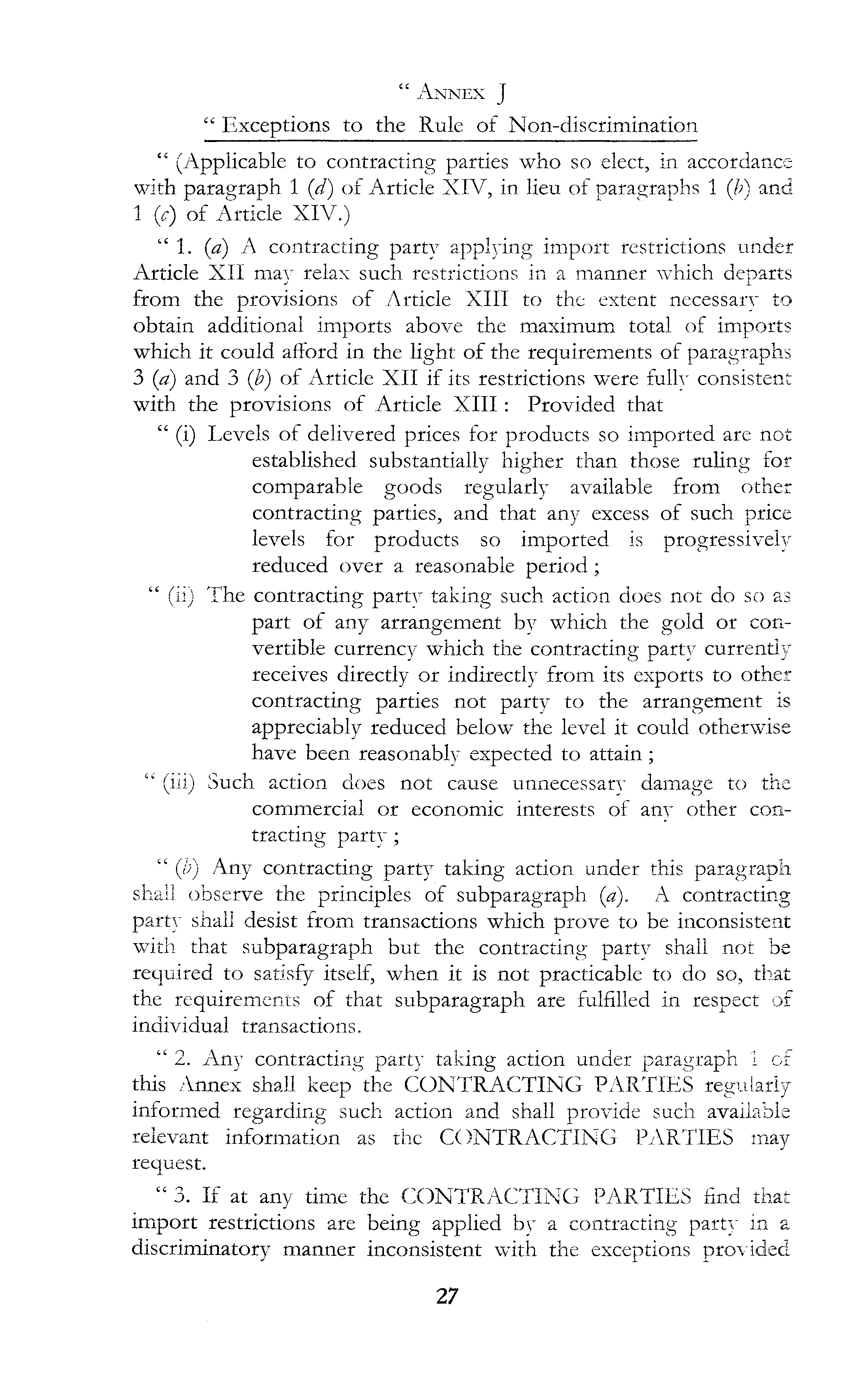 " Annex J " Exceptions to the Rule of Non-discrimination " (Applicable to contracting parties who so elect, in accordance with paragraph 1 (d) of Article XIV, in lieu of paragraphs 1 (b) and 1 (c) of Article XIV.) "1. (a) A contracting party applying import restrictions under Article XII may relax such restrictions in a manner which departs from the provisions of Article XIII to the extent necessary to obtain additional imports above the maximum total of imports which it could afford in the light of the requirements of paragraphs 3 (a) and 3 (b) of Article XII if its restrictions were fully consistent with the provisions of Article XIII: Provided that " (i) Levels of delivered prices for products so imported are not established substantially higher than those ruling for comparable goods regularly available from other contracting parties, and that any excess of such price levels for products so imported is progressively reduced over a reasonable period; " (ii) The contracting party taking such action does not do so as part of any arrangement by which the gold or convertible currency which the contracting party currently receives directly or indirectly from its exports to other contracting parties not party to the arrangement is appreciably reduced below the level it could otherwise have been reasonably expected to attain; " (iii) Such action does not cause unnecessary damage to the commercial or economic interests of any other contracting party; " (b) Any contracting party taking action under this paragraph shall observe the principles of subparagraph (a). A contracting party shall desist from transactions which prove to be inconsistent with that subparagraph but the contracting party shall not be required to satisfy itself, when it is not practicable to do so, that the requirements of that subparagraph are fulfilled in respect of individual transactions. "2. Any contracting party taking action under paragraph 1 of this Annex shall keep the CONTRACTING PARTIES regularly informed regarding such action and shall provide such available relevant information as the CONTRACTING PARTIES may request. " 3. If at any time the CONTRACTING PARTIES find that import restrictions are being applied by a contracting party in a discriminatory manner inconsistent with the exceptions provided