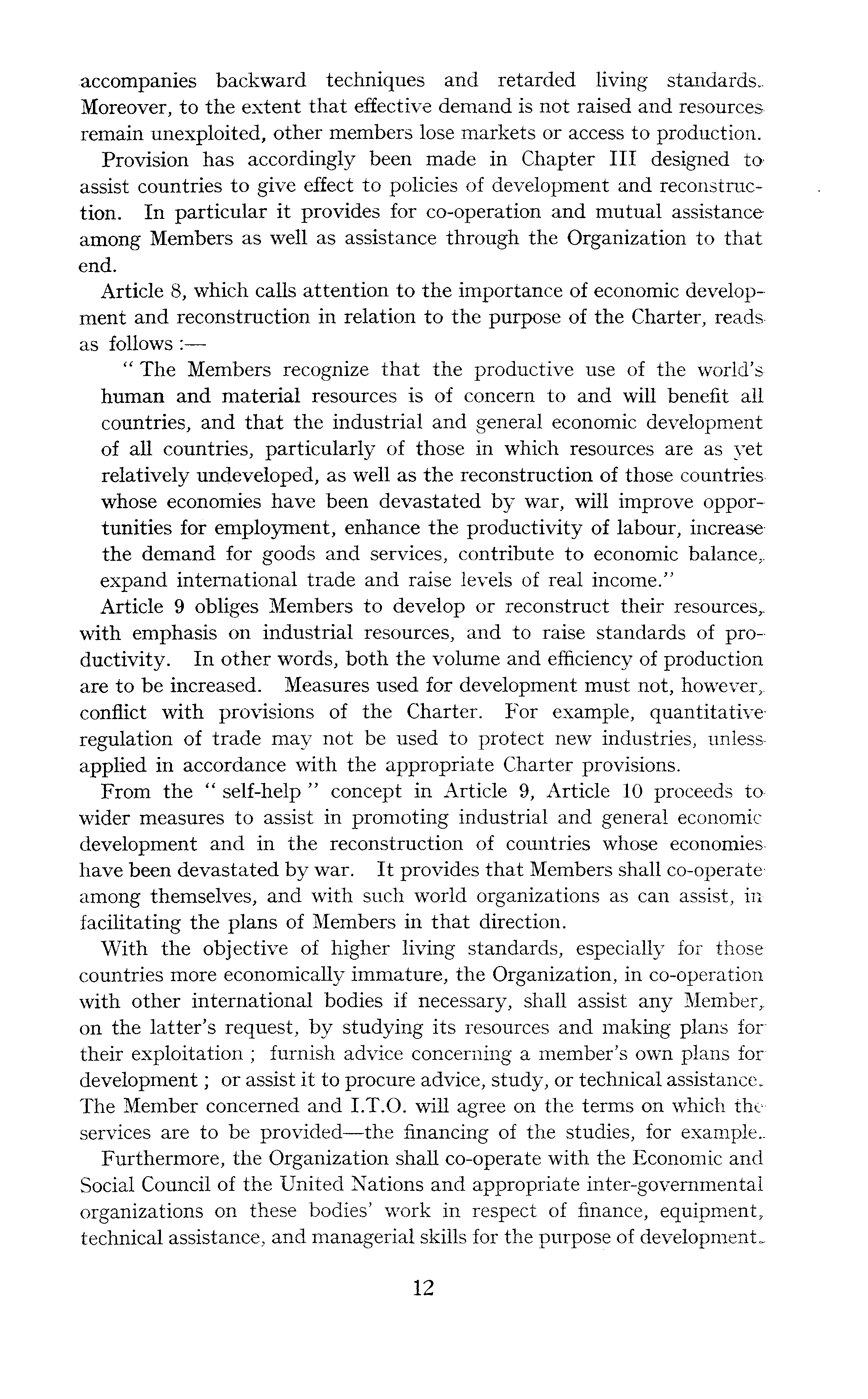 accompanies backward techniques and retarded living standards.. Moreover, to the extent that effective demand is not raised and resources remain unexploited, other members lose markets or access to production. Provision has accordingly been made in Chapter 111 designed to assist countries to give effect to policies of development and reconstruction. In particular it provides for co-operation and mutual assistance among Members as well as assistance through the Organization to that end. Article 8, which calls attention to the importance of economic development and reconstruction in relation to the purpose of the Charter, reads as follows : " The Members recognize that the productive use of the world's human and material resources is of concern to and will benefit all countries, and that the industrial and general economic development of all countries, particularly of those in which resources are as yet relatively undeveloped, as well as the reconstruction of those countries whose economies have been devastated by war, will improve opportunities for employment, enhance the productivity of labour, increase the demand for goods and services, contribute to economic balance,, expand international trade and raise levels of real income." Article 9 obliges Members to develop or reconstruct their resources,. with emphasis on industrial resources, and to raise standards of productivity. In other words, both the volume and efficiency of production are to be increased. Measures used for development must not, however,. conflict with provisions of the Charter. For example, quantitative regulation of trade may not be used to protect new industries, unlessapplied in accordance with the appropriate Charter provisions. From the " self-help " concept in Article 9, Article 10 proceeds towider measures to assist in promoting industrial and general economic development and in the reconstruction of countries whose economies have been devastated by war. It provides that Members shall co-operate among themselves, and with such world organizations as can assist, in facilitating the plans of Members in that direction. With the objective of higher living standards, especially for thosecountries more economically immature, the Organization, in co-operation with other international bodies if necessary, shall assist any Member, on the latter's request, by studying its resources and making plans for their exploitation ; furnish advice concerning a member's own plans for development; or assist it to procure advice, study, or technical assistance. The Member concerned and 1.T.0. will agree on the terms on which theservices are to be provided—the financing of the studies, for example.Furthermore, the Organization shall co-operate with the Economic and. Social Council of the United Nations and appropriate inter-governmental organizations on these bodies' work in respect of finance, equipment,, technical assistance, and managerial skills for the purpose of development..