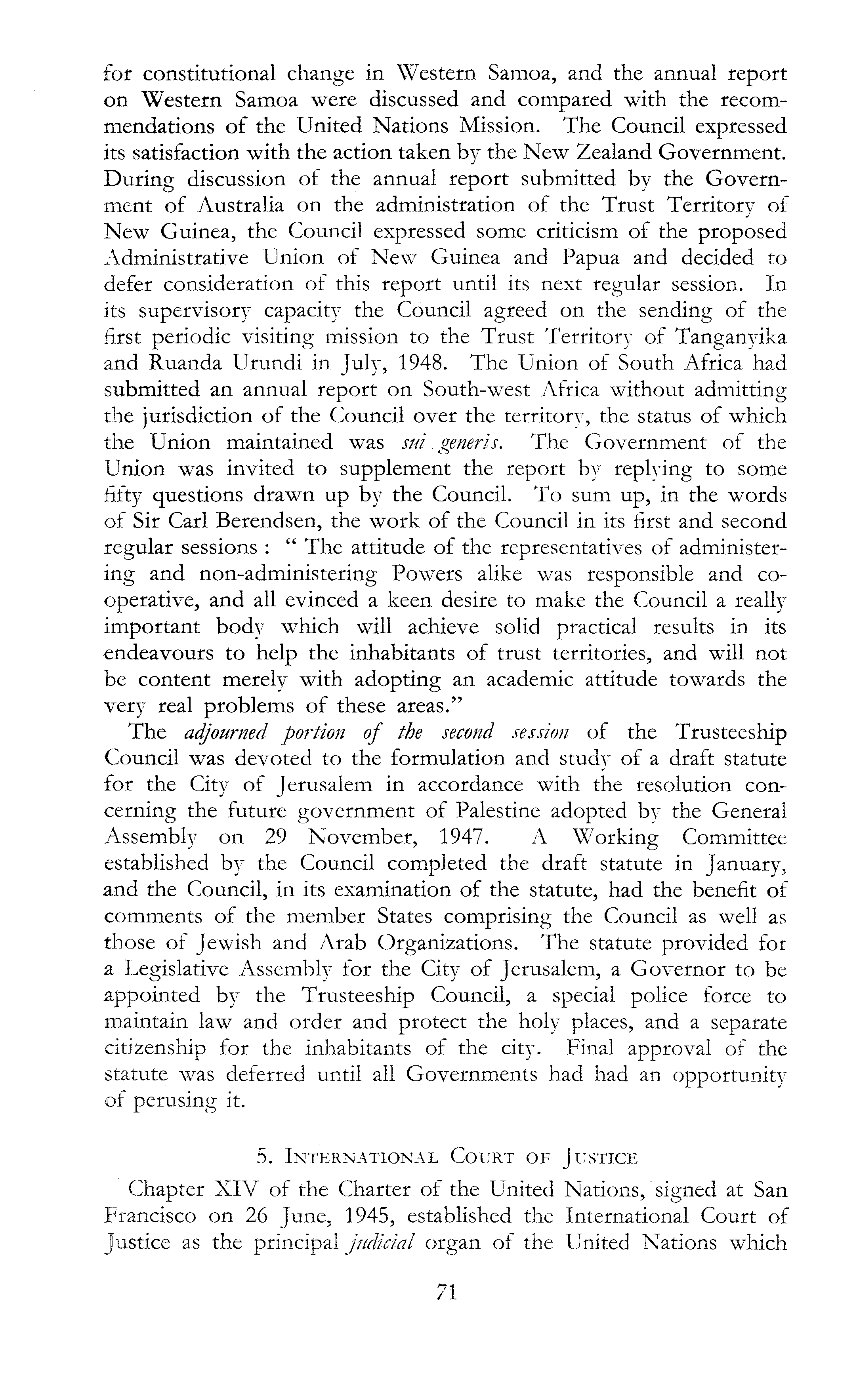 for constitutional change in Western Samoa, and the annual report on Western Samoa were discussed and compared with the recommendations of the United Nations Mission. The Council expressed its satisfaction with the action taken by the New Zealand Government. During discussion of the annual report submitted by the Government of Australia on the administration of the Trust Territory of New Guinea, the Council expressed some criticism of the proposed Administrative Union of New Guinea and Papua and decided to defer consideration of this report until its next regular session. In its supervisory capacity the Council agreed on the sending of the first periodic visiting mission to the Trust Territory of Tanganyika and Ruanda Urundi in July, 1948. The Union of South Africa had submitted an annual report on South-west Africa without admitting the jurisdiction of the Council over the territory, the status of which the Union maintained was sui generis. The Government of the Union was invited to supplement the report by replying to some fifty questions drawn up by the Council. To sum up, in the words of Sir Carl Berendsen, the work of the Council in its first and second regular sessions : " The attitude of the representatives of administering and non-administering Powers alike was responsible and cooperative, and all evinced a keen desire to make the Council a really important body which will achieve solid practical results in its endeavours to help the inhabitants of trust territories, and will not be content merely with adopting an academic attitude towards the very real problems of these areas." The adjourned portion of the second session of the Trusteeship Council was devoted to the formulation and study of a draft statute for the City of Jerusalem in accordance with the resolution concerning the future government of Palestine adopted by the General Assembly on 29 November, 1947. A Working Committee established by the Council completed the draft statute in January, and the Council, in its examination of the statute, had the benefit of comments of the member States comprising the Council as well as those of Jewish and Arab Organizations. The statute provided for a Legislative Assembly for the City of Jerusalem, a Governor to be appointed by the Trusteeship Council, a special police force to maintain law and order and protect the holy places, and a separate citizenship for the inhabitants of the city. Final approval of the statute was deferred until all Governments had had an opportunity of perusing it. 5. International Court of Justice Chapter XIV of the Charter of the United Nations, signed at San Francisco on 26 June, 1945, established the International Court of Justice as the principal judicial organ of the United Nations which