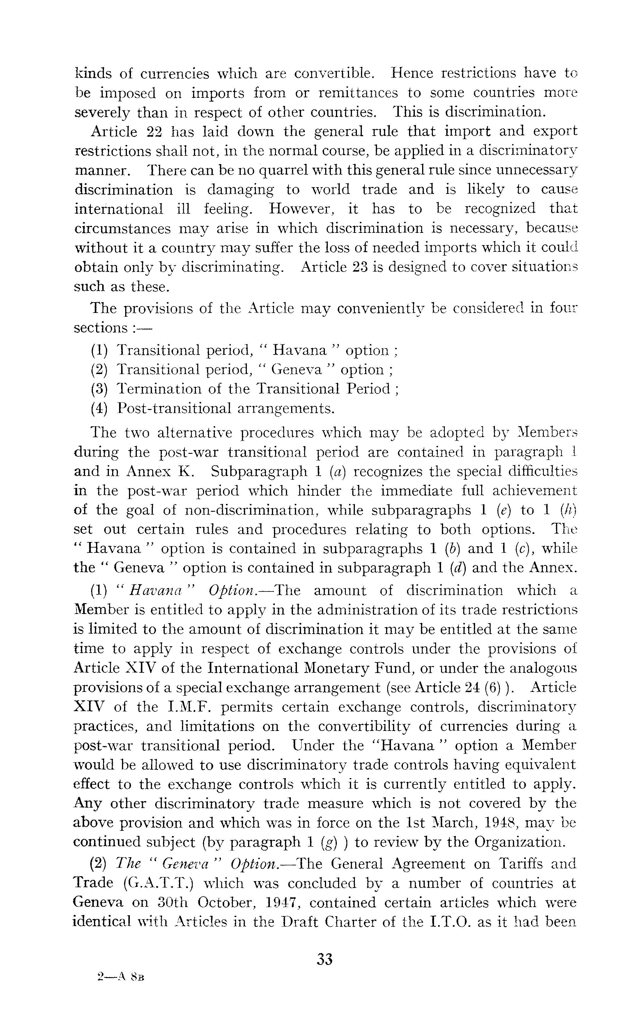 kinds of currencies which are convertible. Hence restrictions have to be imposed on imports from or remittances to some countries more severely than in respect of other countries. This is discrimination. Article 22 has laid down the general rule that import and export restrictions shall not, in the normal course, be applied in a discriminatory manner. There can be no quarrel with this general rule since unnecessary discrimination is damaging to world trade and is likely to cause international ill feeling. However, it has to be recognized that circumstances may arise in which discrimination is necessary, because without it a country may suffer the loss of needed imports which it could obtain only by discriminating. Article 23 is designed to cover situations such as these. The provisions of the Article may conveniently be considered in four sections : (1) Transitional period, " Havana " option ; (2) Transitional period, " Geneva " option ; (3) Termination of the Transitional Period ; (4) Post-transitional arrangements. The two alternative procedures which may be adopted by Members during the post-war transitional period are contained in paragraph 1 and in Annex K. Subparagraph 1 (a) recognizes the special difficulties in the post-war period which hinder the immediate full achievement of the goal of non-discrimination, while subparagraphs 1 (e) to 1 (h) set out certain rules and procedures relating to both options. The " Havana " option is contained in subparagraphs 1 (b) and 1 (c), while the " Geneva " option is contained in subparagraph 1 (d) and the Annex. (1) " Havana" Option. —The amount of discrimination which a Member is entitled to apply in the administration of its trade restrictions is limited to the amount of discrimination it may be entitled at the same time to apply in respect of exchange controls under the provisions of Article XIV of the International Monetary Fund, or under the analogous provisions of a special exchange arrangement (see Article 24 (6)). Article XIV of the I.M.F. permits certain exchange controls, discriminatory practices, and limitations on the convertibility of currencies during a post-war transitional period. Under the "Havana " option a Member would be allowed to use discriminatory trade controls having equivalent effect to the exchange controls which it is currently entitled to apply. Any other discriminatory trade measure which is not covered by the above provision and which was in force on the Ist March, 1948, may be continued subject (by paragraph 1 (g) ) to review by the Organization. (2) The " Geneva " Option. —The General Agreement on Tariffs and Trade (G.A.T.T.) which was concluded by a number of countries at Geneva on 30th October, 1947, contained certain articles which were identical with Articles in the Draft Charter of the 1.T.0. as it had been