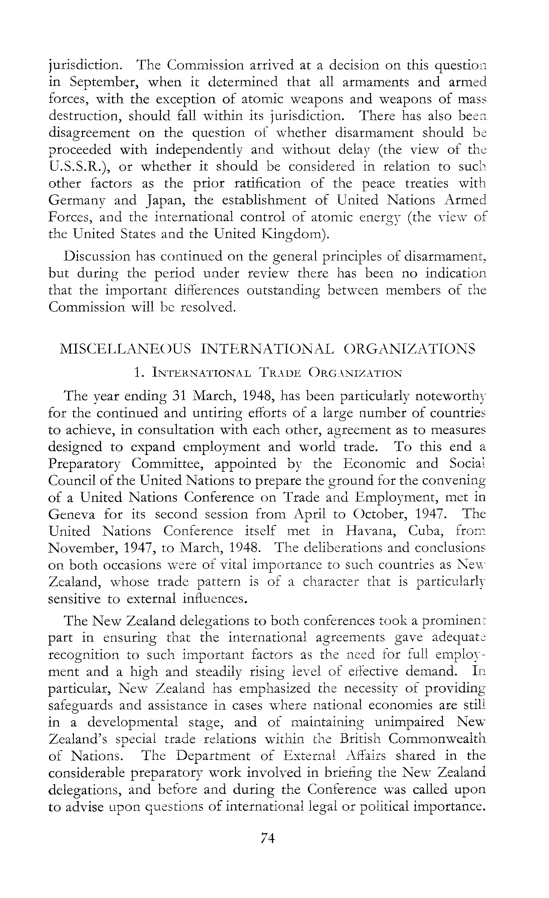 jurisdiction. The Commission arrived at a decision on this question in September, when it determined that all armaments and armed forces, with the exception of atomic weapons and weapons of mass destruction, should fall within its jurisdiction. There has also been disagreement on the question of whether disarmament should be proceeded with independently and without delay (the view of the U.S.S.R.), or whether it should be considered in relation to such other factors as the prior ratification of the peace treaties with Germany and Japan, the establishment of United Nations Armed Forces, and the international control of atomic energy (the view of the United States and the United Kingdom). Discussion has continued on the general principles of disarmament, but during the period under review there has been no indication that the important differences outstanding between members of the Commission will be resolved. MISCELLANEOUS INTERNATIONAL ORGANIZATIONS 1. International Trade Organization The year ending 31 March, 1948, has been particularly noteworthy for the continued and untiring efforts of a large number of countries to achieve, in consultation with each other, agreement as to measures designed to expand employment and world trade. To this end a Preparatory Committee, appointed by the Economic and Social Council of the United Nations to prepare the ground for the convening of a United Nations Conference on Trade and Employment, met in Geneva for its second session from April to October, 1947. The United Nations Conference itself met in Havana, Cuba, from November, 1947, to March, 1948. The deliberations and conclusions on both occasions were of vital importance to such countries as New Zealand, whose trade pattern is of a character that is particularly sensitive to external influences. The New Zealand delegations to both conferences took a prominent part in ensuring that the international agreements gave adequate recognition to such important factors as the need for full employment and a high and steadily rising level of effective demand. In particular, New Zealand has emphasized the necessity of providing safeguards and assistance in cases where national economies are still in a developmental stage, and of maintaining unimpaired New Zealand's special trade relations within the British Commonwealth of Nations. The Department of External Affairs shared in the considerable preparatory work involved in briefing the New Zealand delegations, and before and during the Conference was called upon to advise upon questions of international legal or political importance.