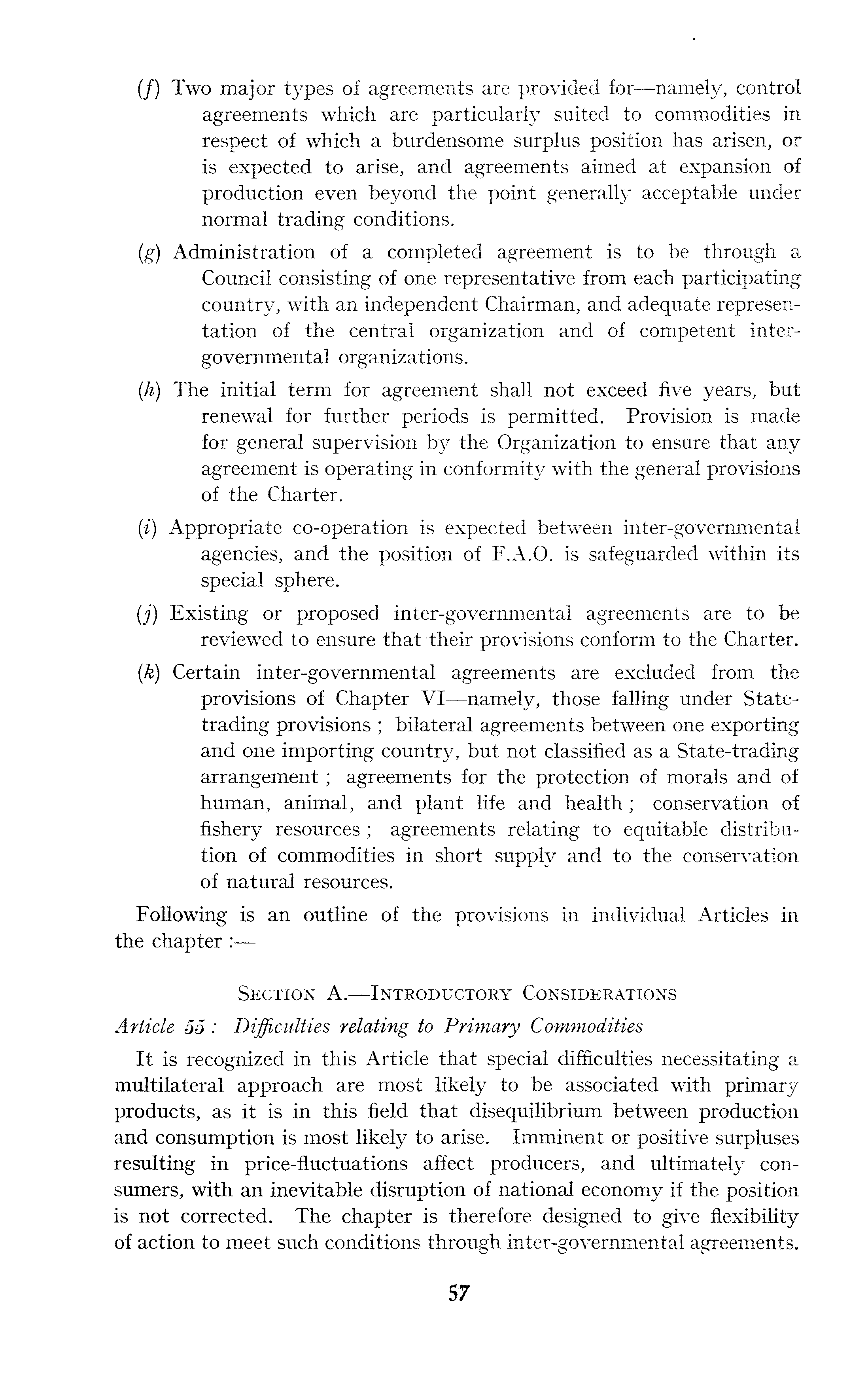 (/) Two major types of agreements are provided for —namely, control agreements which are particularly suited to commodities in respect of which a burdensome surplus position has arisen, or is expected to arise, and agreements aimed at expansion of production even beyond the point generally acceptable under normal trading conditions. (g) Administration of a completed agreement is to be through a Council consisting of one representative from each participating country, with an independent Chairman, and adequate representation of the central organization and of competent intergovernmental organizations. (h) The initial term for agreement shall not exceed five years, but renewal for further periods is permitted. Provision is made for general supervision by the Organization to ensure that any agreement is operating in conformity with the general provisions of the Charter. (i) Appropriate co-operation is expected between inter-governmentai agencies, and the position of F.A.O. is safeguarded within its special sphere. (j) Existing or proposed inter-governmental agreements are to be reviewed to ensure that their provisions conform to the Charter. (k) Certain inter-governmental agreements are excluded from the provisions of Chapter VI —namely, those falling under Statetrading provisions ; bilateral agreements between one exporting and one importing country, but not classified as a State-trading arrangement; agreements for the protection of morals and of human, animal, and plant life and health; conservation of fishery resources ; agreements relating to equitable distribution of commodities in short supply and to the conservation of natural resources. Following is an outline of the provisions in individual Articles in the chapter : Section A. —Introductory Considerations Article 55: Difficulties relating to Primary Commodities It is recognized in this Article that special difficulties necessitating a multilateral approach are most likely to be associated with primary products, as it is in this field that disequilibrium between production and consumption is most likely to arise. Imminent or positive surpluses resulting in price-fluctuations affect producers, and ultimately consumers, with an inevitable disruption of national economy if the position is not corrected. The chapter is therefore designed to give flexibility of action to meet such conditions through inter-governmental agreements.