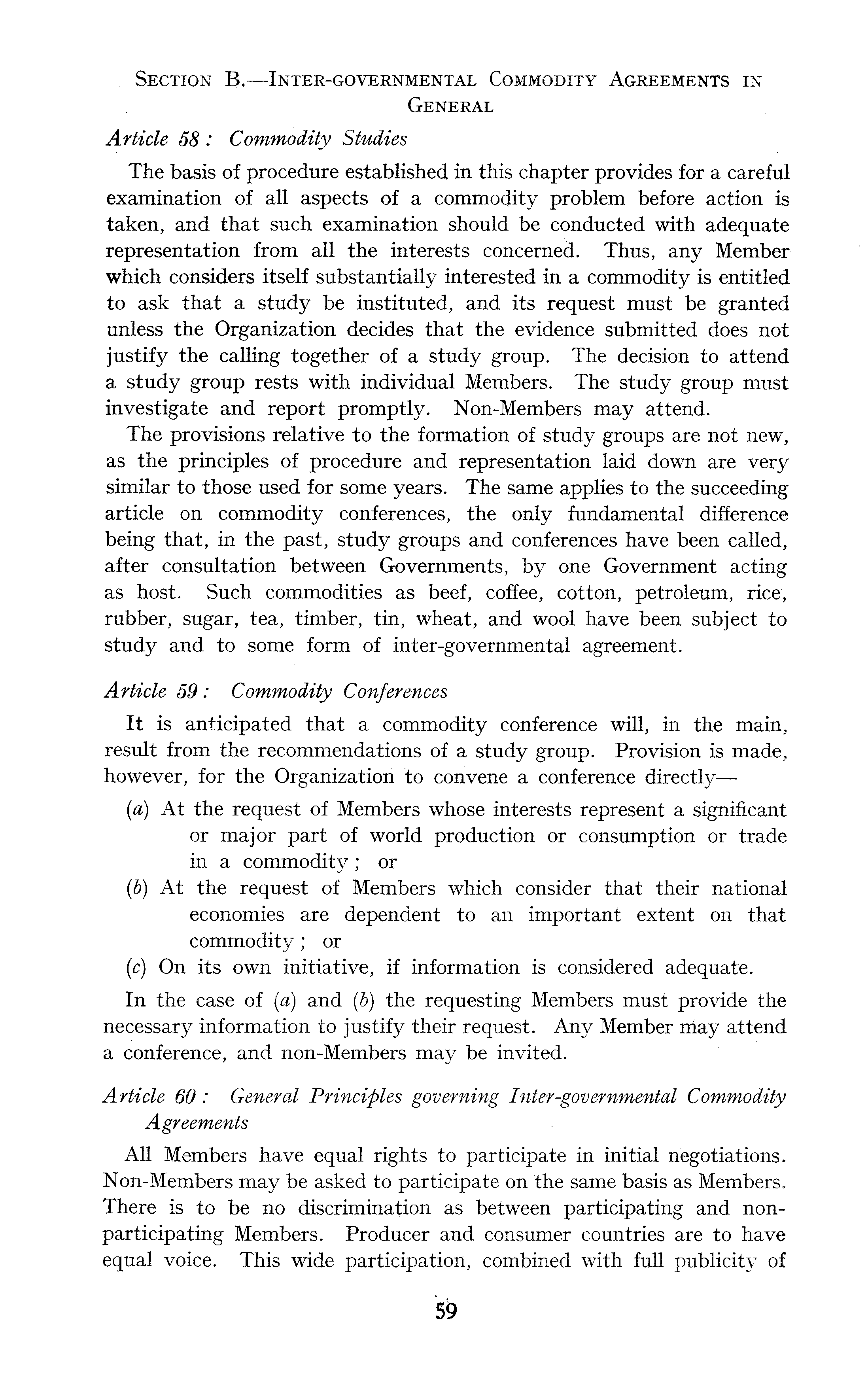 Section B.—lnter-governmental Commodity Agreements in General Article 58 : Commodity Studies The basis of procedure established in this chapter provides for a careful examination of all aspects of a commodity problem before action is taken, and that such examination should be conducted with adequate representation from all the interests concerned. Thus, any Member which considers itself substantially interested in a commodity is entitled to ask that a study be instituted, and its request must be granted unless the Organization decides that the evidence submitted does not justify the calling together of a study group. The decision to attend a study group rests with individual Members. The study group must investigate and report promptly. Non-Members may attend. The provisions relative to the formation of study groups are not new, as the principles of procedure and representation laid down are very similar to those used for some years. The same applies to the succeeding article on commodity conferences, the only fundamental difference being that, in the past, study groups and conferences have been called, after consultation between Governments, by one Government acting as host. Such commodities as beef, coffee, cotton, petroleum, rice, rubber, sugar, tea, timber, tin, wheat, and wool have been subject to study and to some form of inter-governmental agreement. Article 59: Commodity Conferences It is anticipated that a commodity conference will, in the main, result from the recommendations of a study group. Provision is made, however, for the Organization to convene a conference directly—(a) At the request of Members whose interests represent a significant or major part of world production or consumption or trade in a commodity; or (b) At the request of Members which consider that their national economies are dependent to an important extent on that commodity; or (c) On its own initiative, if information is considered adequate. In the case of (a) and (b) the requesting Members must provide the necessary information to justify their request. Any Member may attend a conference, and non-Members may be invited. Article 60: General Principles governing Inter-governmental Commodity Agreements All Members have equal rights to participate in initial negotiations. Non-Members may be asked to participate on the same basis as Members. There is to be no discrimination as between participating and nonparticipating Members. Producer and consumer countries are to have equal voice. This wide participation, combined with full publicity of