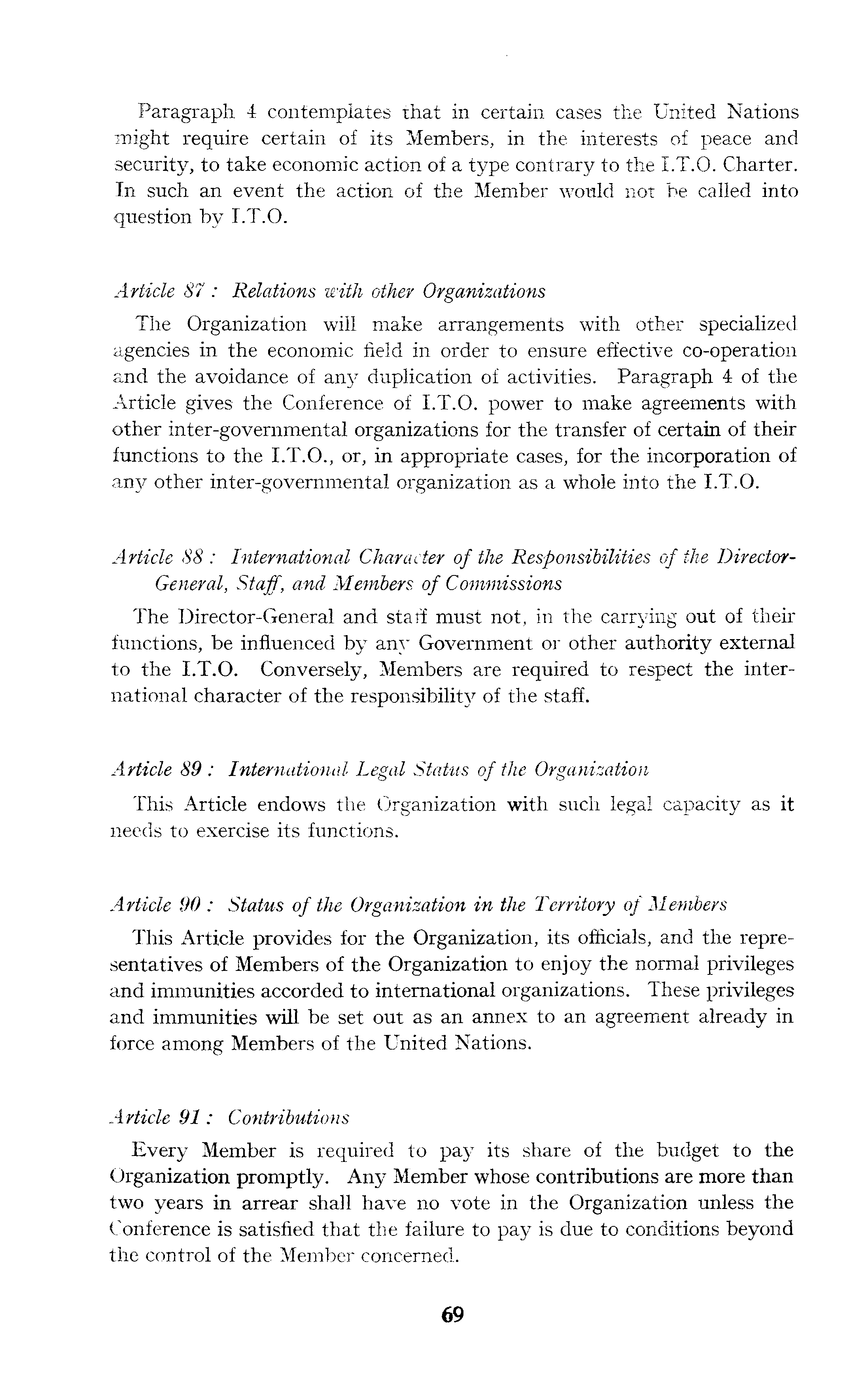 Paragraph 4 contemplates that in certain cases the United Nations might require certain of its Members, in the interests of peace and security, to take economic action of a type contrary to the 1.T.0. Charter. In such an event the action of the Member would not be called into question by 1.T.0. Article 87 : Relations with other Organizations The Organization will make arrangements with other specialized agencies in the economic field in order to ensure effective co-operation and the avoidance of any duplication of activities. Paragraph 4of the Article gives the Conference of 1.T.0. power to make agreements with other inter-governmental organizations for the transfer of certain of their functions to the 1.T.0., or, in appropriate cases, for the incorporation of any other inter-governmental organization as a whole into the 1.T.0. Article 88 : International Character of the Responsibilities of the DirectorGeneral, Staff, and Members of Commissions The Director-General and staff must not, in the carrying out of their functions, be influenced by any Government or other authority external to the 1.T.0. Conversely, Members are required to respect the international character of the responsibility of the staff. Article 89 : International Legal Status of the Organization This Article endows the Organization with such legal capacity as it needs to exercise its functions. Article 90 : Status of the Organization in the Territory of Members This Article provides for the Organization, its officials, and the representatives of Members of the Organization to enjoy the normal privileges and immunities accorded to international organizations. These privileges and immunities will be set out as an annex to an agreement already in force among Members of the United Nations. Article 91: Contributions Every Member is required to pay its share of the budget to the Organization promptly. Any Member whose contributions are more than two years in arrear shall have no vote in the Organization unless the Conference is satisfied that the failure to pay is due to conditions beyond the control of the Member concerned.