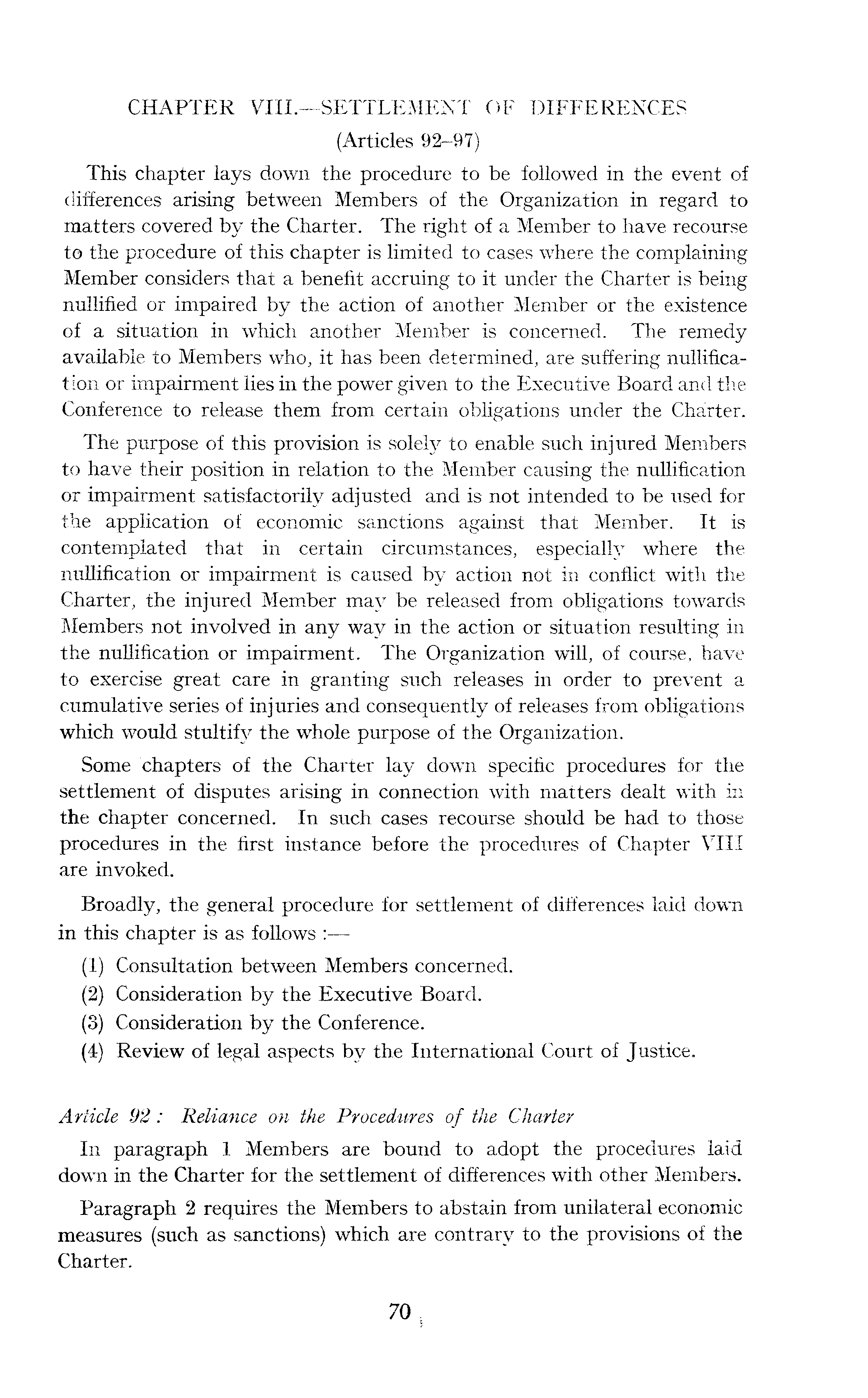 CHAPTER VIII.—SETTLEMENT OF DIFFERENCES (Articles 92-97) This chapter lays down the procedure to be followed in the event of differences arising between Members of the Organization in regard to matters covered by the Charter. The right of a Member to have recourse to the procedure of this chapter is limited to cases where the complaining Member considers that a benefit accruing to it under the Charter is being nullified or impaired by the action of another Member or the existence of a situation in which another Member is concerned. The remedy available to Members who, it has been determined, are suffering nullification or impairment lies in the power given to the Executive Board and the Conference to release them from certain obligations under the Charter. The purpose of this provision is solely to enable such injured Members to have their position in relation to the Member causing the nullification or impairment satisfactorily adjusted and is not intended to be used for the application of economic sanctions against that Member. It is contemplated that in certain circumstances, especially where the nullification or impairment is caused by action not in conflict with the Charter, the injured Member may be released from obligations towards Members not involved in any way in the action or situation resulting in the nullification or impairment. The Organization will, of course, have to exercise great care in granting such releases in order to prevent a cumulative series of injuries and consequently of releases from obligations which would stultify the whole purpose of the Organization. Some chapters of the Charter lay down specific procedures for the settlement of disputes arising in connection with matters dealt with in the chapter concerned. In such cases recourse should be had to those procedures in the first instance before the procedures of Chapter VIII are invoked. Broadly, the general procedure for settlement of differences laid down in this chapter is as follows : (1) Consultation between Members concerned. (2) Consideration by the Executive Board. (3) Consideration by the Conference. (4) Review of legal aspects by the International Court of Justice. Article 92: Reliance on the Procedures of the Charter In paragraph 1 Members are bound to adopt the procedures laid down in the Charter for the settlement of differences with other Members. Paragraph 2 requires the Members to abstain from unilateral economic measures (such as sanctions) which are contrary to the provisions of the Charter.