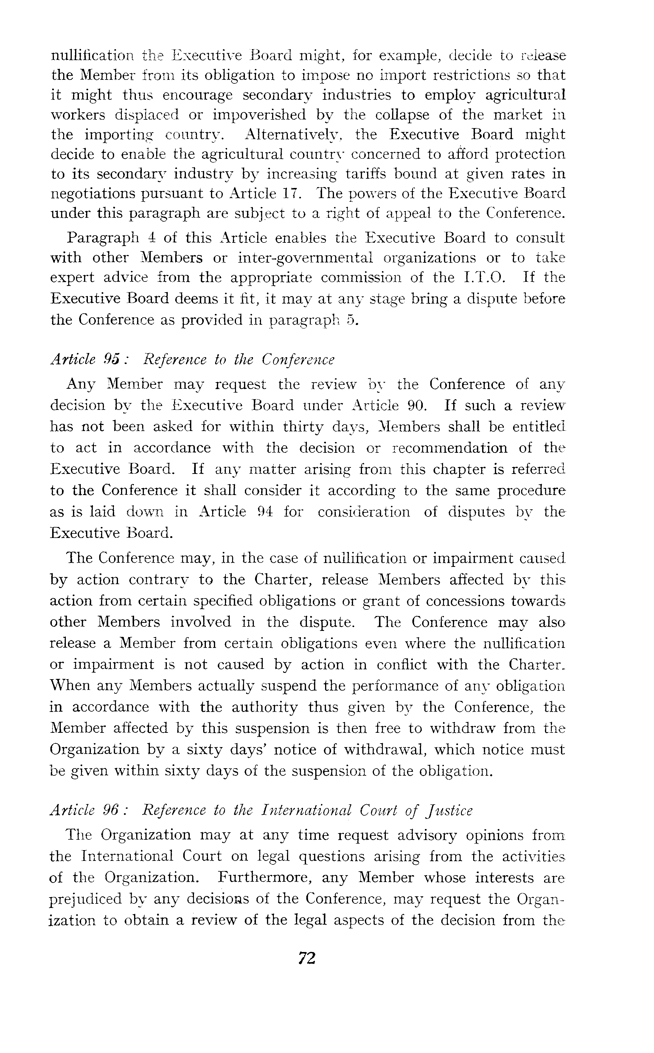 nullification the Executive Board might, for example, decide to release the Member from its obligation to impose no import restrictions so that it might thus encourage secondary industries to employ agricultural workers displaced or impoverished by the collapse of the market in the importing country. Alternatively, the Executive Board might decide to enable the agricultural country concerned to afford protection to its secondary industry by increasing tariffs bound at given rates in negotiations pursuant to Article 17. The powers of the Executive Board under this paragraph are subject to a right of appeal to the Conference. Paragraph 4 of this Article enables the Executive Board to consult with other Members or inter-governmental organizations or to take expert advice from the appropriate commission of the 1.T.0. If the Executive Board deems it fit, it may at any stage bring a dispute before the Conference as provided in paragraph 5. Article 95: Reference to the Conference Any Member may request the review by the Conference of any decision by the Executive Board under Article 90. If such a review has not been asked for within thirty days, Members shall be entitled to act in accordance with the decision or recommendation of the Executive Board. If any matter arising from this chapter is referred to the Conference it shall consider it according to the same procedure as is laid down in Article 94 for consideration of disputes by the Executive Board. The Conference may, in the case of nullification or impairment caused by action contrary to the Charter, release Members affected by this action from certain specified obligations or grant of concessions towards other Members involved in the dispute. The Conference may also release a Member from certain obligations even where the nullification or impairment is not caused by action in conflict with the Charter. When any Members actually suspend the performance of any obligation in accordance with the authority thus given by the Conference, the Member affected by this suspension is then free to withdraw from the Organization by a sixty days' notice of withdrawal, which notice must be given within sixty days of the suspension of the obligation. Article 96: Reference to the International Court of Justice The Organization may at any time request advisory opinions from the International Court on legal questions arising from the activities of the Organization. Furthermore, any Member whose interests are prejudiced by any decisions of the Conference, may request the Organization to obtain a review of the legal aspects of the decision from the