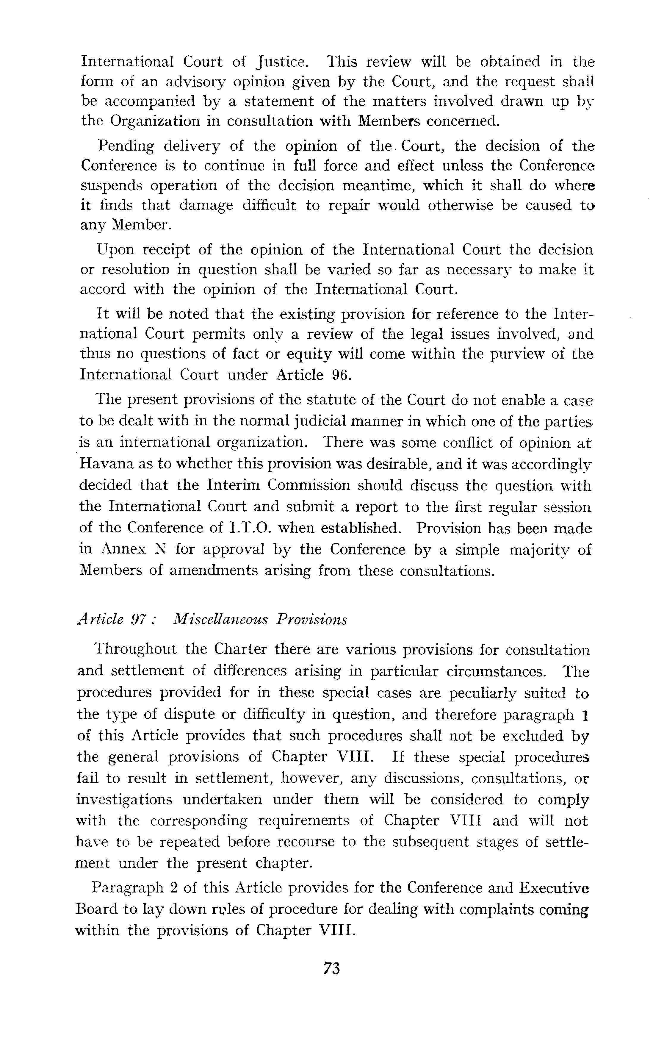 International Court of Justice. This review will be obtained in the form of an advisory opinion given by the Court, and the request shall be accompanied by a statement of the matters involved drawn up by the Organization in consultation with Members concerned. Pending delivery of the opinion of the Court, the decision of the Conference is to continue in full force and effect unless the Conference suspends operation of the decision meantime, which it shall do where it finds that damage difficult to repair would otherwise be caused to any Member. Upon receipt of the opinion of the International Court the decision or resolution in question shall be varied so far as necessary to make it accord with the opinion of the International Court. It will be noted that the existing provision for reference to the International Court permits only a review of the legal issues involved, and thus no questions of fact or equity wiil come within the purview of the International Court under Article 96. The present provisions of the statute of the Court do not enable a case to be dealt with in the normal judicial manner in which one of the parties is an international organization. There was some conflict of opinion at Havana as to whether this provision was desirable, and it was accordingly decided that the Interim Commission should discuss the question with the International Court and submit a report to the first regular session of the Conference of 1.T.0. when established. Provision has been made in Annex N for approval by the Conference by a simple majority of Members of amendments arising from these consultations. Article 97 : Miscellaneous Provisions Throughout the Charter there are various provisions for consultation and settlement of differences arising in particular circumstances. The procedures provided for in these special cases are peculiarly suited to the type of dispute or difficulty in question, and therefore paragraph 1 of this Article provides that such procedures shall not be excluded by the general provisions of Chapter VIII. If these special procedures fail to result in settlement, however, any discussions, consultations, or investigations undertaken under them will be considered to comply with the corresponding requirements of Chapter VIII and will not have to be repeated before recourse to the subsequent stages of settlement under the present chapter. Paragraph 2 of this Article provides for the Conference and Executive Board to lay down rules of procedure for dealing with complaints coming within the provisions of Chapter VIII.