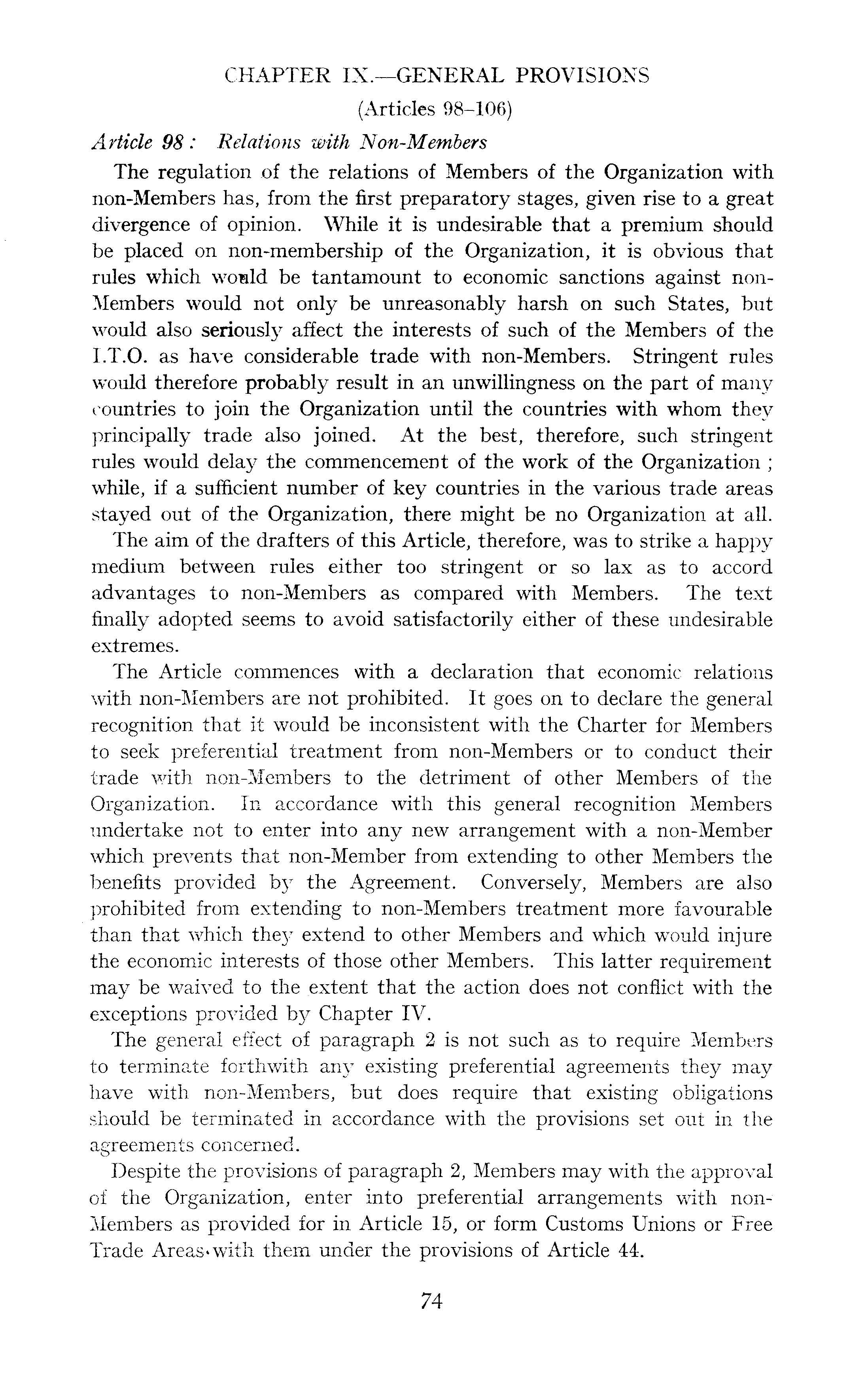 CHAPTER IX.—GENERAL PROVISIONS (Articles 98-106) Article 98 : Relations with Non-Members The regulation of the relations of Members of the Organization with non-Members has, from the first preparatory stages, given rise to a great divergence of opinion. While it is undesirable that a premium should be placed on non-membership of the Organization, it is obvious that rules which wosld be tantamount to economic sanctions against nonMembers would not only be unreasonably harsh on such States, but would also seriously affect the interests of such of the Members of the 1.T.0. as have considerable trade with non-Members. Stringent rules would therefore probably result in an unwillingness on the part of many countries to join the Organization until the countries with whom they principally trade also joined. At the best, therefore, such stringent rules would delay the commencement of the work of the Organization ; while, if a sufficient number of key countries in the various trade areas stayed out of the Organization, there might be no Organization at all. The aim of the drafters of this Article, therefore, was to strike a happy medium between rules either too stringent or so lax as to accord advantages to non-Members as compared with Members. The text finally adopted seems to avoid satisfactorily either of these undesirable extremes. The Article commences with a declaration that economic relations with non-Members are not prohibited. It goes on to declare the general recognition that it would be inconsistent with the Charter for Members to seek preferential treatment from non-Members or to conduct their trade with non-Members to the detriment of other Members of the Organization. In accordance with this general recognition Members undertake not to enter into any new arrangement with a non-Member which prevents that non-Member from extending to other Members the benefits provided by the Agreement. Conversely, Members are also prohibited from extending to non-Members treatment more favourable than that which extend to other Members and which would injure the economic interests of those other Members. This latter requirement may be waived to the extent that the action does not conflict with the exceptions provided by Chapter IV. The general effect of paragraph 2 is not such as to require Members to terminate forthwith any existing preferential agreements they may have with non-Members, but does require that existing obligations should be terminated in accordance with the provisions set out in the agreements concerned. Despite the provisions of paragraph 2, Members may with the approval of the Organization, enter into preferential arrangements with nonMembers as provided for in Article 15, or form Customs Unions or Free Trade Areas*with them under the provisions of Article 44.