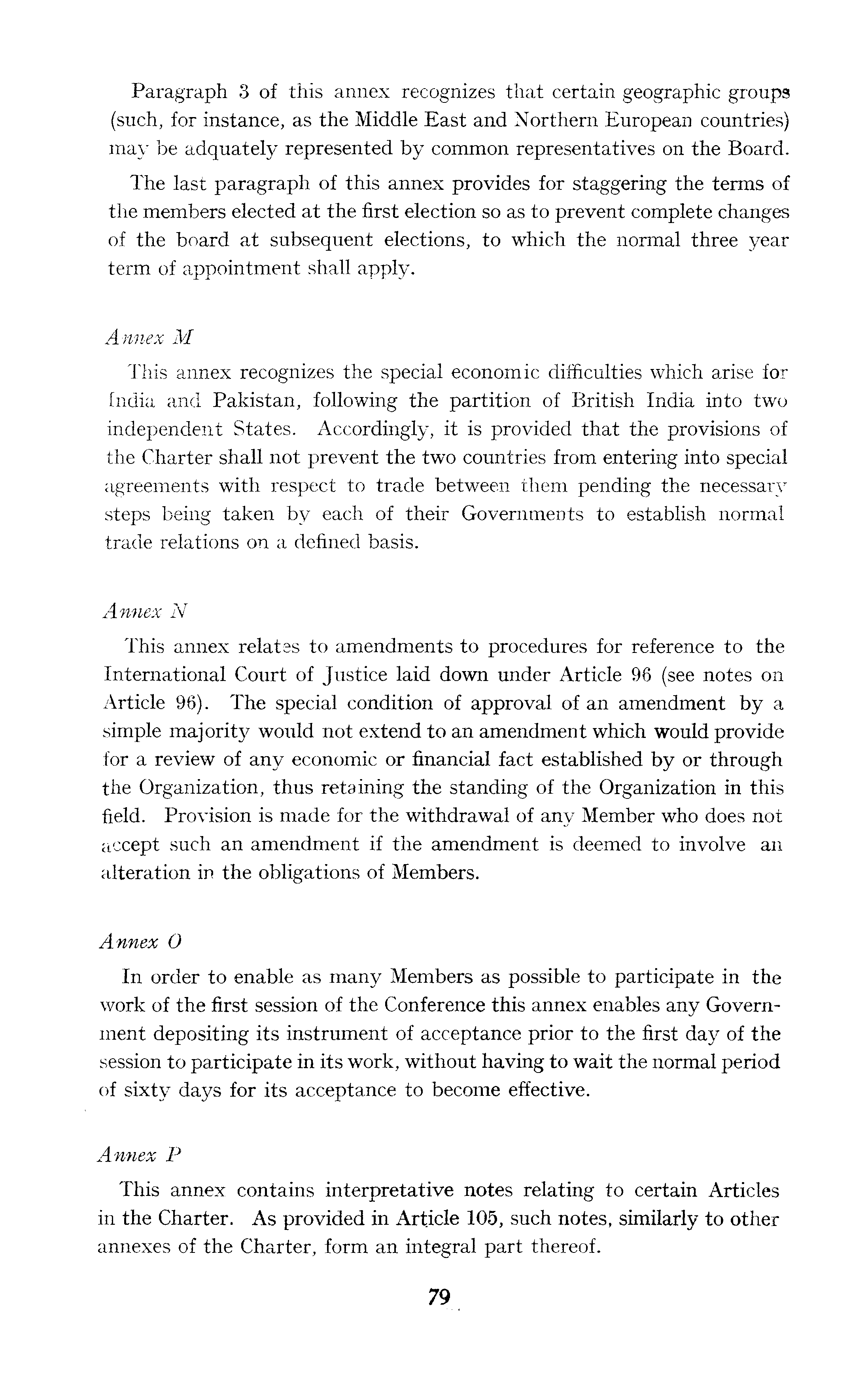 Paragraph 3 of this annex recognizes that certain geographic groups (such, for instance, as the Middle East and Northern European countries) may be adquately represented by common representatives on the Board. The last paragraph of this annex provides for staggering the terms of the members elected at the first election so as to prevent complete changes of the board at subsequent elections, to which the normal three year term of appointment shall apply. Annex M This annex recognizes the special economic difficulties which arise for India and Pakistan, following the partition of British India into two independent States. Accordingly, it is provided that the provisions of the Charter shall not prevent the two countries from entering into special agreements with respect to trade between them pending the necessary steps being taken by each of their Governments to establish normal trade relations on a defined basis. Annex N This annex relates to amendments to procedures for reference to the International Court of Justice laid down under Article 96 (see notes on Article 96). The special condition of approval of an amendment by a simple majority would not extend to an amendment which would provide for a review of any economic or financial fact established by or through the Organization, thus retaining the standing of the Organization in this field. Provision is made for the withdrawal of any Member who does not accept such an amendment if the amendment is deemed to involve an alteration in the obligations of Members. Annex 0 In order to enable as many Members as possible to participate in the work of the first session of the Conference this annex enables any Government depositing its instrument of acceptance prior to the first day of the session to participate in its work, without having to wait the normal period of sixty days for its acceptance to become effective. Annex P This annex contains interpretative notes relating to certain Articles in the Charter. As provided in Article 105, such notes, similarly to other annexes of the Charter, form an integral part thereof.
