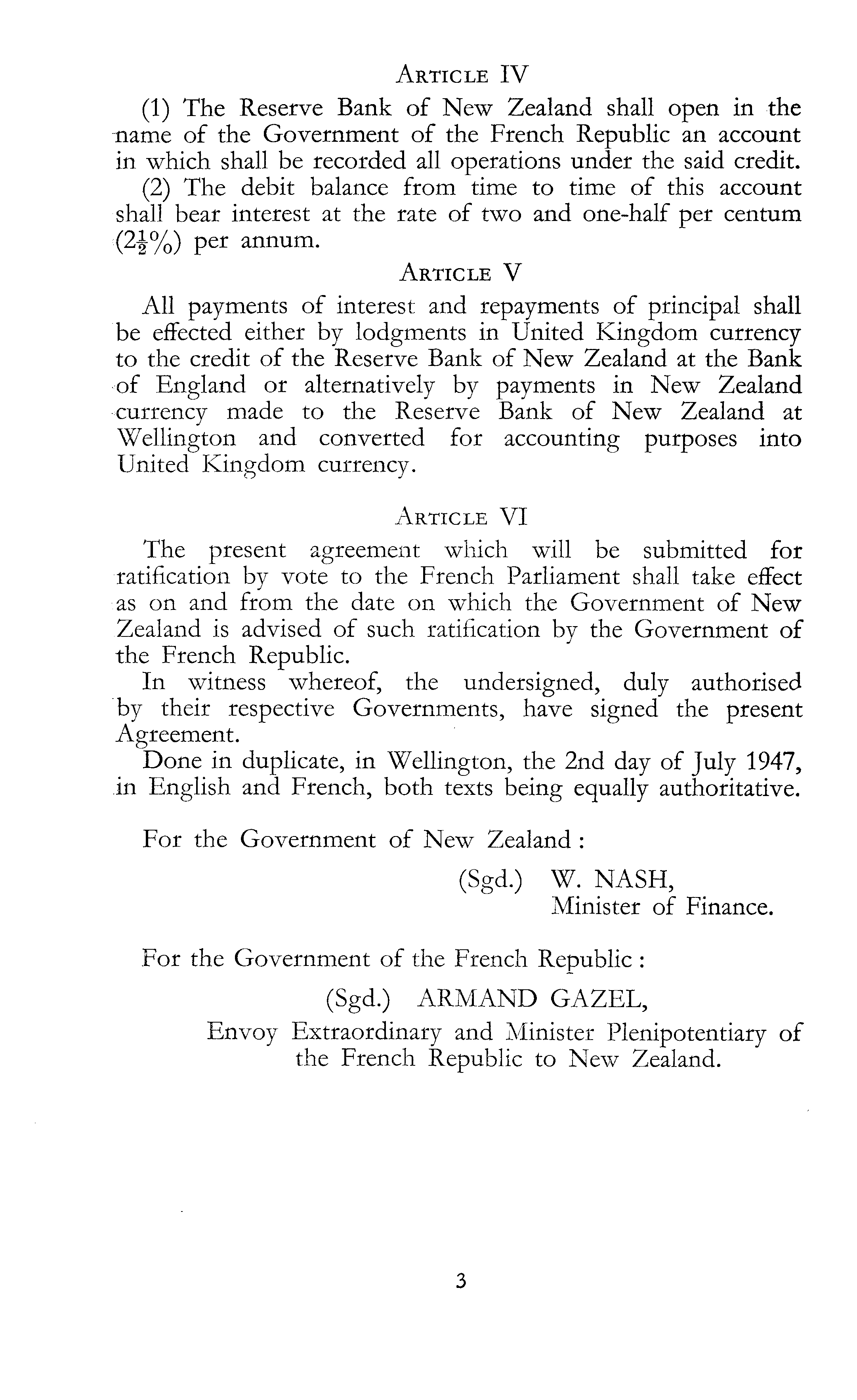 Article IV (1) The Reserve Bank of New Zealand shall open in the name of the Government of the French Republic an account in which shall be recorded all operations under the said credit. (2) The debit balance from time to time of this account shall bear interest at the rate of two and one-half per centum '(24%) per annum. Article V All payments of interest and repayments of principal shall be effected either by lodgments in United Kingdom currency to the credit of the Reserve Bank of New Zealand at the Bank of England or alternatively by payments in New Zealand currency made to the Reserve Bank of New Zealand at Wellington and converted for accounting purposes into United Kingdom currency. Article VI The present agreement which will be submitted for ratification by vote to the French Parliament shall take effect as on and from the date on which the Government of New Zealand is advised of such ratification by the Government of the French Republic. In witness whereof, the undersigned, duly authorised by their respective Governments, have signed the present Agreement. Done in duplicate, in Wellington, the 2nd day of July 1947, in English and French, both texts being equally authoritative. For the Government of New Zealand : (Sgd.) W. NASH, Minister of Finance. For the Government of the French Republic : (Sgd.) ARMAND GAZEL, Envoy Extraordinary and Minister Plenipotentiary of the French Republic to New Zealand.