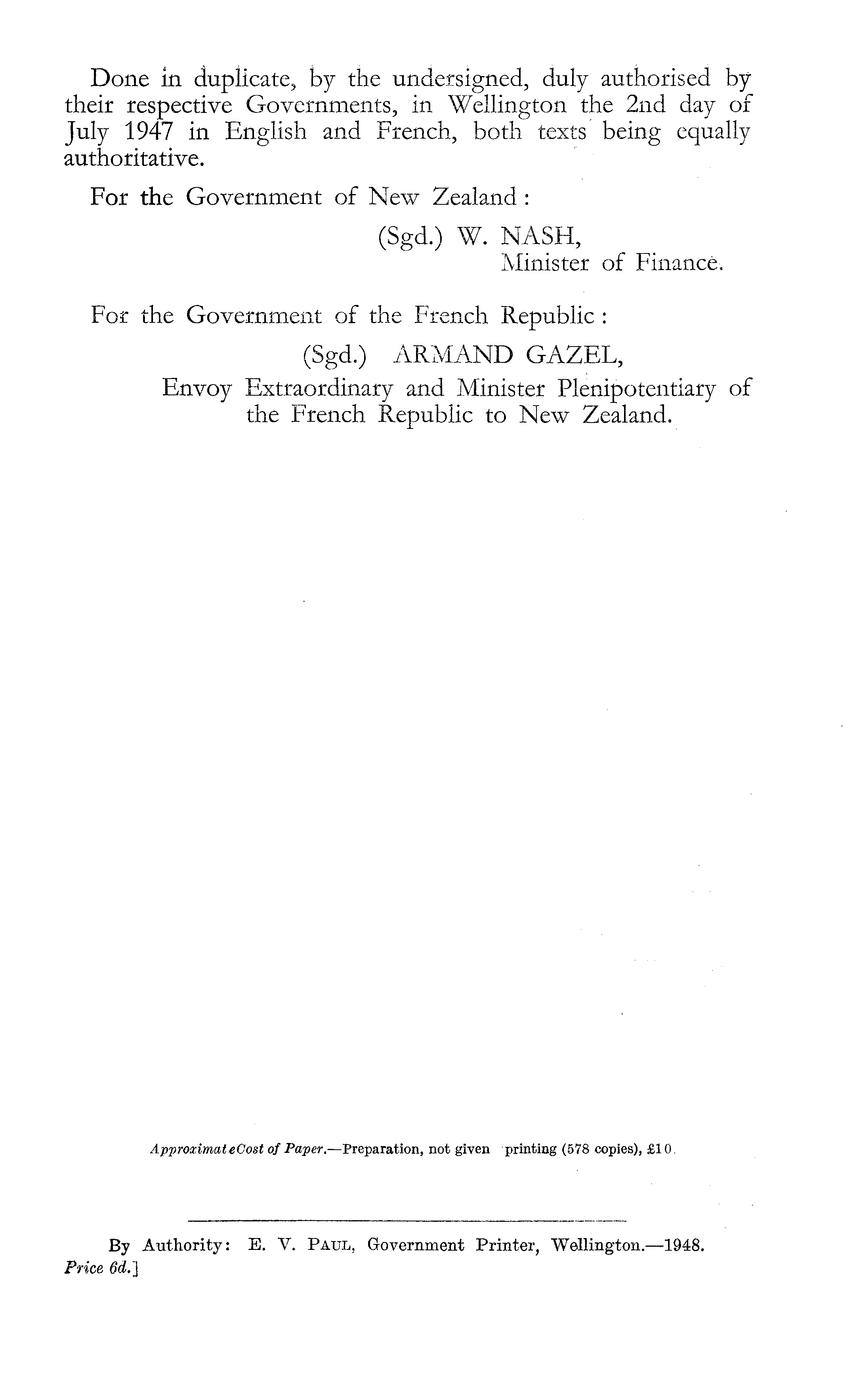 Done in duplicate, by the undersigned, duly authorised by their respective Governments, in Wellington the 2nd day of July 1947 in English and French, both texts being equally authoritative. For the Government of New Zealand: (Sgd.) W. NASH, Minister of Finance. For the Government of the French Republic : (Sgd.) ARMAND GAZEL, Envoy Extraordinary and Minister Plenipotentiary of the French Republic to New Zealand.