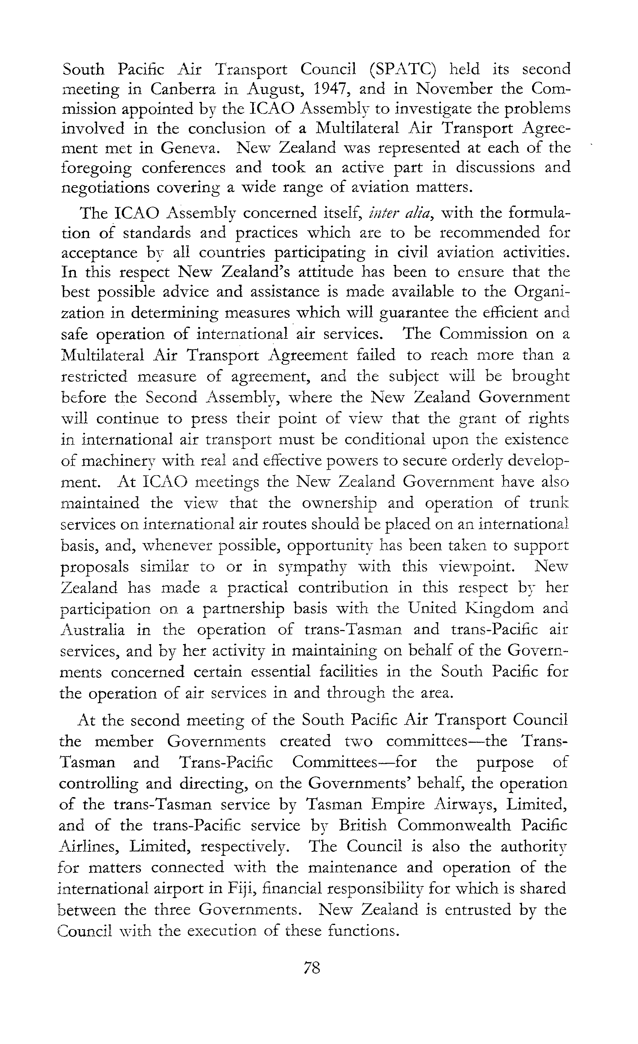 South Pacific Air Transport Council (SPATC) held its second meeting in Canberra in August, 1947, and in November the Commission appointed by the ICAO Assembly to investigate the problems involved in the conclusion of a Multilateral Air Transport Agreement met in Geneva. New Zealand was represented at each of the foregoing conferences and took an active part in discussions and negotiations covering a wide range of aviation matters. The ICAO Assembly concerned itself, inter alia,, with the formulation of standards and practices which are to be recommended for acceptance by all countries participating in civil aviation activities. In this respect New Zealand's attitude has been to ensure that the best possible advice and assistance is made available to the Organization in determining measures which will guarantee the efficient and safe operation of international air services. The Commission on a Multilateral Air Transport Agreement failed to reach more than a restricted measure of agreement, and the subject will be brought before the Second Assembly, where the New Zealand Government will continue to press their point of view that the grant of rights in international air transport must be conditional upon the existence of machinery with real and effective powers to secure orderly development. At ICAO meetings the New Zealand Government have also maintained the view that the ownership and operation of trunk services on international air routes should be placed on an international basis, and, whenever possible, opportunity has been taken to support proposals similar to or in sympathy with this viewpoint. New Zealand has made a practical contribution in this respect by her participation on a partnership basis with the United Kingdom and Australia in the operation of trans-Tasman and trans-Pacific air services, and by her activity in maintaining on behalf of the Governments concerned certain essential facilities in the South Pacific for the operation of air services in and through the area. At the second meeting of the South Pacific Air Transport Council the member Governments created two committees—the TransTasman and Trans-Pacific Committees —for the purpose of controlling and directing, on the Governments' behalf, the operation of the trans-Tasman service by Tasman Empire Airways, Limited, and of the trans-Pacific service by British Commonwealth Pacific Airlines, Limited, respectively. The Council is also the authority for matters connected with the maintenance and operation of the international airport in Fiji, financial responsibility for which is shared between the three Governments. New Zealand is entrusted by the Council with the execution of these functions.