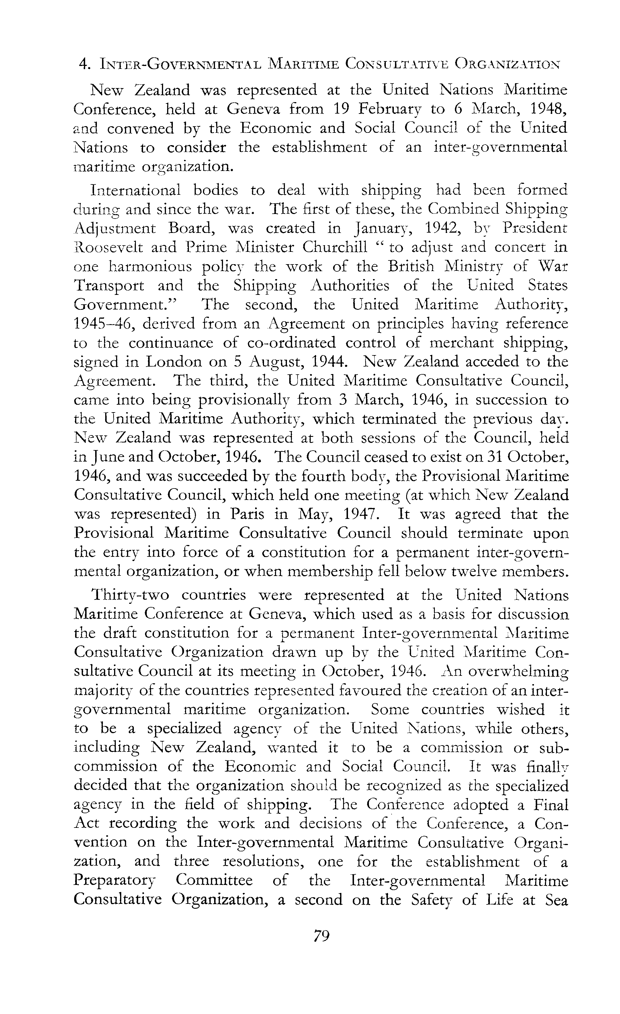 4. Inter-Governmental Maritime Consultative Organization New Zealand was represented at the United Nations Maritime Conference, held at Geneva from 19 February to 6 March, 1948, and convened by the Economic and Social Council of the United Nations to consider the establishment of an inter-governmental maritime organization. International bodies to deal with shipping had been formed during and since the war. The first of these, the Combined Shipping Adjustment Board, was created in January, 1942, by President Roosevelt and Prime Minister Churchill " to adjust and concert in one harmonious policy the work of the British Ministry of War Transport and the Shipping Authorities of the United States Government." The second, the United Maritime Authority, 1945-46, derived from an Agreement on principles having reference to the continuance of co-ordinated control of merchant shipping, signed in London on 5 August, 1944. New Zealand acceded to the Agreement. The third, the United Maritime Consultative Council, came into being provisionally from 3 March, 1946, in succession to the United Maritime Authority, which terminated the previous day. New Zealand was represented at both sessions of the Council, held in June and October, 1946. The Council ceased to exist on 31 October, 1946, and was succeeded by the fourth body, the Provisional Maritime Consultative Council, which held one meeting (at which New Zealand was represented) in Paris in May, 1947. It was agreed that the Provisional Maritime Consultative Council should terminate upon the entry into force of a constitution for a permanent inter-govern-mental organization, or when membership fell below twelve members. Thirty-two countries were represented at the United Nations Maritime Conference at Geneva, which used as a basis for discussion the draft constitution for a permanent Inter-governmental Maritime Consultative Organization drawn up by the United Maritime Consultative Council at its meeting in October, 1946. An overwhelming majority of the countries represented favoured the creation of an intergovernmental maritime organization. Some countries wished it to be a specialized agency of the United Nations, while others, including New Zealand, wanted it to be a commission or subcommission of the Economic and Social Council. It was finally decided that the organization should be recognized as the specialized agency in the field of shipping. The Conference adopted a Final Act recording the work and decisions of the Conference, a Convention on the Inter-governmental Maritime Consultative Organization, and three resolutions, one for the establishment of a Preparatory Committee of the Inter-governmental Maritime Consultative Organization, a second on the Safety of Life at Sea