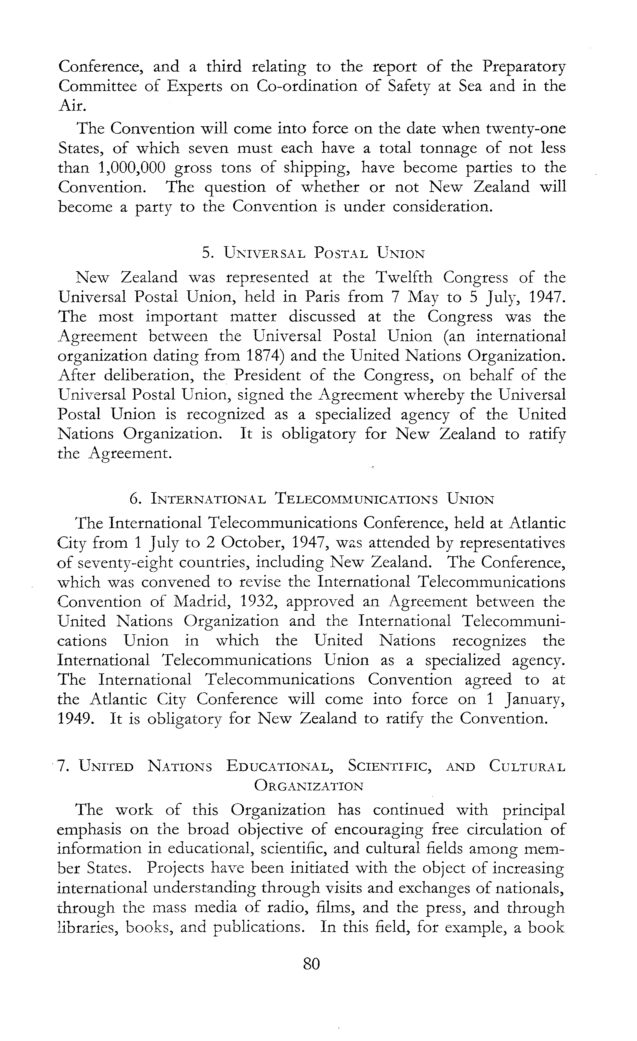 Conference, and a third relating to the report of the Preparatory Committee of Experts on Co-ordination of Safety at Sea and in the Air. The Convention will come into force on the date when twenty-one States, of which seven must each have a total tonnage of not less than 1,000,000 gross tons of shipping, have become parties to the Convention. The question of whether or not New Zealand will become a party to the Convention is under consideration. 5. Universal Postal Union New Zealand was represented at the Twelfth Congress of the Universal Postal Union, held in Paris from 7 May to 5 July, 1947. The most important matter discussed at the Congress was the Agreement between the Universal Postal Union (an international organization dating from 1874) and the United Nations Organization. After deliberation, the President of the Congress, on behalf of the Universal Postal Union, signed the Agreement whereby the Universal Postal Union is recognized as a specialized agency of the United Nations Organization. It is obligatory for New Zealand to ratify the Agreement. 6. International Telecommunications Union The International Telecommunications Conference, held at Atlantic City from 1 July to 2 October, 1947, was attended by representatives of seventy-eight countries, including New Zealand. The Conference, which was convened to revise the International Telecommunications Convention of Madrid, 1932, approved an Agreement between the United Nations Organization and the International Telecommunications Union in which the United Nations recognizes the International Telecommunications Union as a specialized agency. The International Telecommunications Convention agreed to at the Atlantic City Conference will come into force on 1 January, 1949. It is obligatory for New Zealand to ratify the Convention. 7. United Nations Educational, Scientific, and Cultural Organization The work of this Organization has continued with principal emphasis on the broad objective of encouraging free circulation of information in educational, scientific, and cultural fields among member States. Projects have been initiated with the object of increasing international understanding through visits and exchanges of nationals, through the mass media of radio, films, and the press, and through libraries, books, and publications. In this field, for example, a book