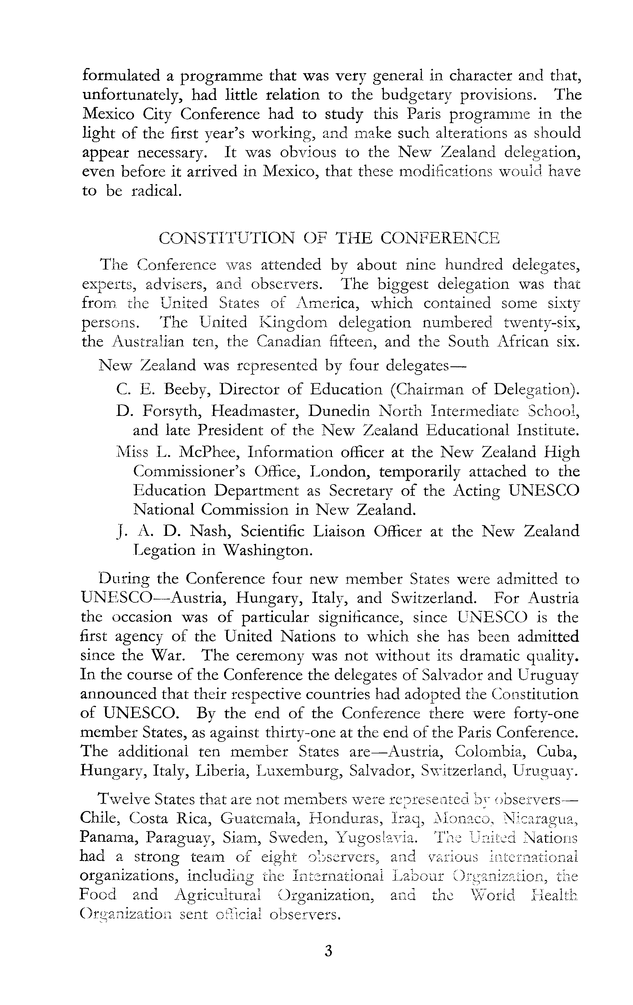 formulated a programme that was very general in character and that, unfortunately, had little relation to the budgetary provisions. The Mexico City Conference had to study this Paris programme in the light of the first year's working, and make such alterations as should appear necessary. It was obvious to the New Zealand delegation, even before it arrived in Mexico, that these modifications would have to be radical. CONSTITUTION OF THE CONFERENCE The Conference was attended by about nine hundred delegates, experts, advisers, and observers. The biggest delegation was that from the United States of America, which contained some sixty persons. The United Kingdom delegation numbered twenty-six, the Australian ten, the Canadian fifteen, and the South African six. New Zealand was represented by four delegates— C. E. Beeby, Director of Education (Chairman of Delegation). D. Forsyth, Headmaster, Dunedin North Intermediate School, and late President of the New Zealand Educational Institute. Miss L. McPhee, Information officer at the New Zealand High Commissioner's Office, London, temporarily attached to the Education Department as Secretary of the Acting UNESCO National Commission in New Zealand. J. A. D. Nash, Scientific Liaison Officer at the New Zealand Legation in Washington. During the Conference four new member States were admitted to UNESCO—Austria, Hungary, Italy, and Switzerland. For Austria the occasion was of particular significance, since UNESCO is the first agency of the United Nations to which she has been admitted since the War. The ceremony was not without its dramatic quality. In the course of the Conference the delegates of Salvador and Uruguay announced that their respective countries had adopted the Constitution of UNESCO. By the end of the Conference there were forty-one member States, as against thirty-one at the end of the Paris Conference. The additional ten member States are—Austria, Colombia, Cuba, Hungary, Italy, Liberia, Luxemburg, Salvador, Switzerland, Uruguay. Twelve States that are not members were represented by observers— Chile, Costa Rica, Guatemala, Honduras, Iraq, Monaco, Nicaragua, Panama, Paraguay, Siam, Sweden, Yugoslavia. The United Nations had a strong team of eight observers, and various international organizations, including the International Labour Organization, the Food and Agricultural Organization, and the World Health Organization sent official observers.