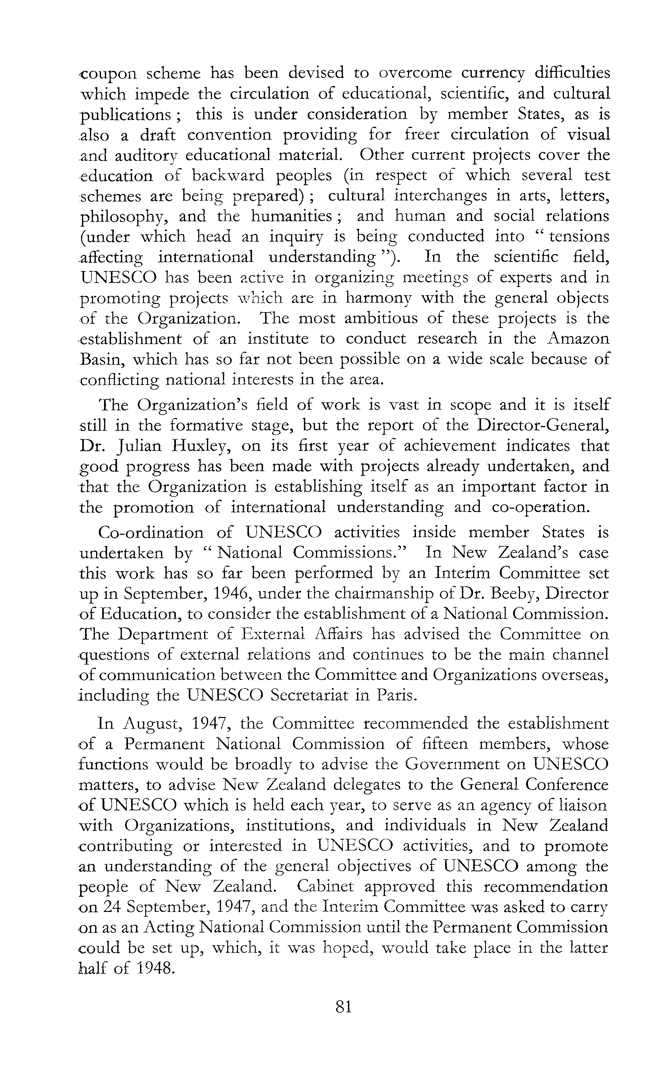 coupon scheme has been devised to overcome currency difficulties which impede the circulation of educational, scientific, and cultural publications ; this is under consideration by member States, as is also a draft convention providing for freer circulation of visual and auditory educational material. Other current projects cover the education of backward peoples (in respect of which several test schemes are being prepared) ; cultural interchanges in arts, letters, philosophy, and the humanities ; and human and social relations (under which head an inquiry is being conducted into " tensions affecting international understanding"). In the scientific field, UNESCO has been active in organizing meetings of experts and in promoting projects which are in harmony with the general objects ■of the Organization. The most ambitious of these projects is the •establishment of an institute to conduct research in the Amazon Basin, which has so far not been possible on a wide scale because of ■conflicting national interests in the area. The Organization's field of work is vast in scope and it is itself still in the formative stage, but the report of the Director-General, Dr. Julian Huxley, on its first year of achievement indicates that good progress has been made with projects already undertaken, and that the Organization is establishing itself as an important factor in the promotion of international understanding and co-operation. Co-ordination of UNESCO activities inside member States is undertaken by " National Commissions." In New Zealand's case this work has so far been performed by an Interim Committee set up in September, 1946, under the chairmanship of Dr. Beeby, Director -of Education, to consider the establishment of a National Commission. The Department of External Affairs has advised the Committee on •questions of external relations and continues to be the main channel of communication between the Committee and Organizations overseas, including the UNESCO Secretariat in Paris. In August, 1947, the Committee recommended the establishment of a Permanent National Commission of fifteen members, whose functions would be broadly to advise the Government on UNESCO matters, to advise New Zealand delegates to the General Conference of UNESCO which is held each year, to serve as an agency of liaison with Organizations, institutions, and individuals in New Zealand contributing or interested in UNESCO activities, and to promote an understanding of the general objectives of UNESCO among the people of New Zealand. Cabinet approved this recommendation on 24 September, 1947, and the Interim Committee was asked to carry on as an Acting National Commission until the Permanent Commission could be set up, which, it was hoped, would take place in the latter half of 1948.