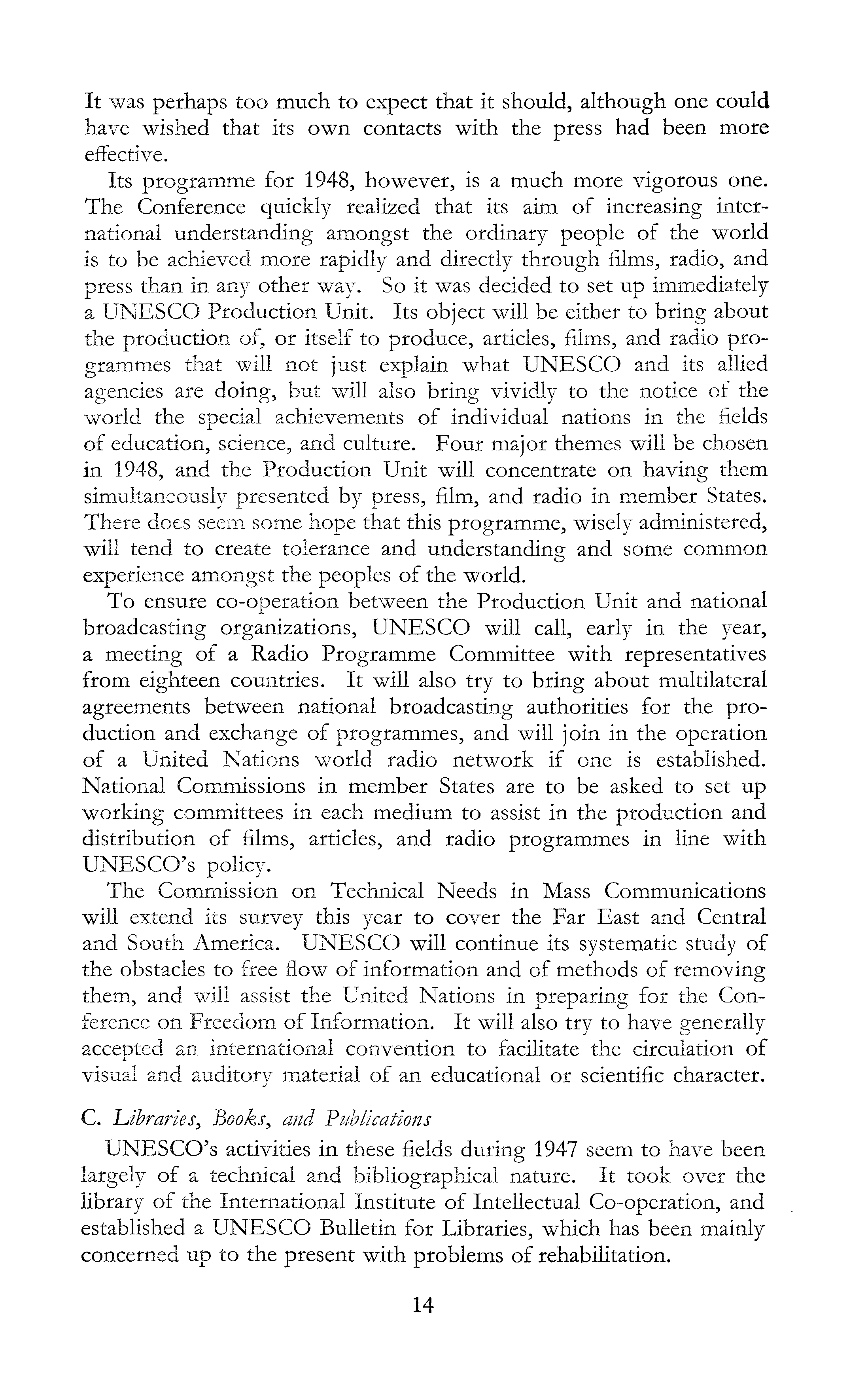 It was perhaps too much to expect that it should, although one could have wished that its own contacts with the press had been more effective. Its programme for 1948, however, is a much more vigorous one. The Conference quickly realized that its aim of increasing international understanding amongst the ordinary people of the world is to be achieved more rapidly and directly through films, radio, and press than in any other way. So it was decided to set up immediately a UNESCO Production Unit. Its object will be either to bring about the production of, or itself to produce, articles, films, and radio programmes that will not just explain what UNESCO and its allied agencies are doing, but will also bring vividly to the notice of the world the special achievements of individual nations in the fields of education, science, and culture. Four major themes will be chosen in 1948, and the Production Unit will concentrate on having them simultaneously presented by press, film, and radio in member States. There does seem some hope that this programme, wisely administered, will tend to create tolerance and understanding and some common experience amongst the peoples of the world. To ensure co-operation between the Production Unit and national broadcasting organizations, UNESCO will call, early in the year, a meeting of a Radio Programme Committee with representatives from eighteen countries. It will also try to bring about multilateral agreements between national broadcasting authorities for the production and exchange of programmes, and will join in the operation of a United Nations world radio network if one is established. National Commissions in member States are to be asked to set up working committees in each medium to assist in the production and distribution of films, articles, and radio programmes in line with UNESCO's policy. The Commission on Technical Needs in Mass Communications will extend its survey this year to cover the Far East and Central and South America. UNESCO will continue its systematic study of the obstacles to free flow of information and of methods of removing them, and will assist the United Nations in preparing for the Conference on Freedom of Information. It will also try to have generally accepted an international convention to facilitate the circulation of visual and auditory material of an educational or scientific character. C. Libraries, Books, and Publications UNESCO's activities in these fields during 1947 seem to have been largely of a technical and bibliographical nature. It took over the library of the International Institute of Intellectual Co-operation, and established a UNESCO Bulletin for Libraries, which has been mainly concerned up to the present with problems of rehabilitation.