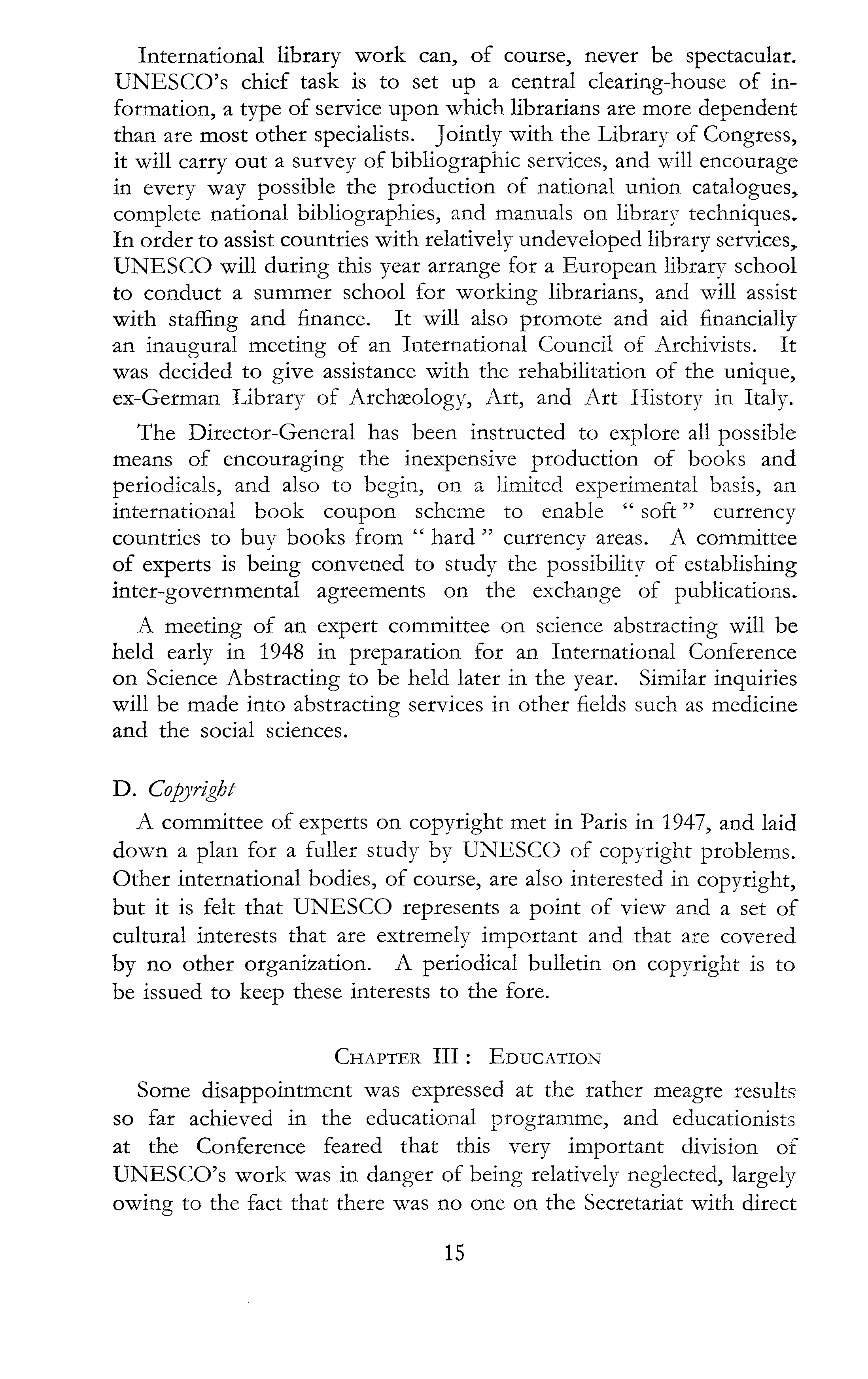 International library work can, of course, never be spectacular. UNESCO's chief task is to set up a central clearing-house of information, a type of service upon which librarians are more dependent than are most other specialists. Jointly with the Library of Congress, it will carry out a survey of bibliographic services, and will encourage in every way possible the production of national union catalogues, complete national bibliographies, and manuals on library techniques. In order to assist countries with relatively undeveloped library services, UNESCO will during this year arrange for a European library school to conduct a summer school for working librarians, and will assist with staffing and finance. It will also promote and aid financially an inaugural meeting of an International Council of Archivists. It was decided to give assistance with the rehabilitation of the unique, ex-German Library of Archaeology, Art, and Art History in Italy. The Director-General has been instructed to explore all possible means of encouraging the inexpensive production of books and periodicals, and also to begin, on a limited experimental basis, an international book coupon scheme to enable " soft" currency countries to buy books from " hard " currency areas. A committee of experts is being convened to study the possibility of establishing inter-governmental agreements on the exchange of publications. A meeting of an expert committee on science abstracting will be held early in 1948 in preparation for an International Conference on Science Abstracting to be held later in the year. Similar inquiries will be made into abstracting services in other fields such as medicine and the social sciences. D. Copyright A committee of experts on copyright met in Paris in 1947, and laid down a plan for a fuller study by UNESCO of copyright problems. Other international bodies, of course, are also interested in copyright, but it is felt that UNESCO represents a point of view and a set of cultural interests that are extremely important and that are covered by no other organization. A periodical bulletin on copyright is to be issued to keep these interests to the fore. Chapter III: Education Some disappointment was expressed at the rather meagre results so far achieved in the educational programme, and educationists at the Conference feared that this very important division of UNESCO's work was in danger of being relatively neglected, largely owing to the fact that there was no one on the Secretariat with direct
