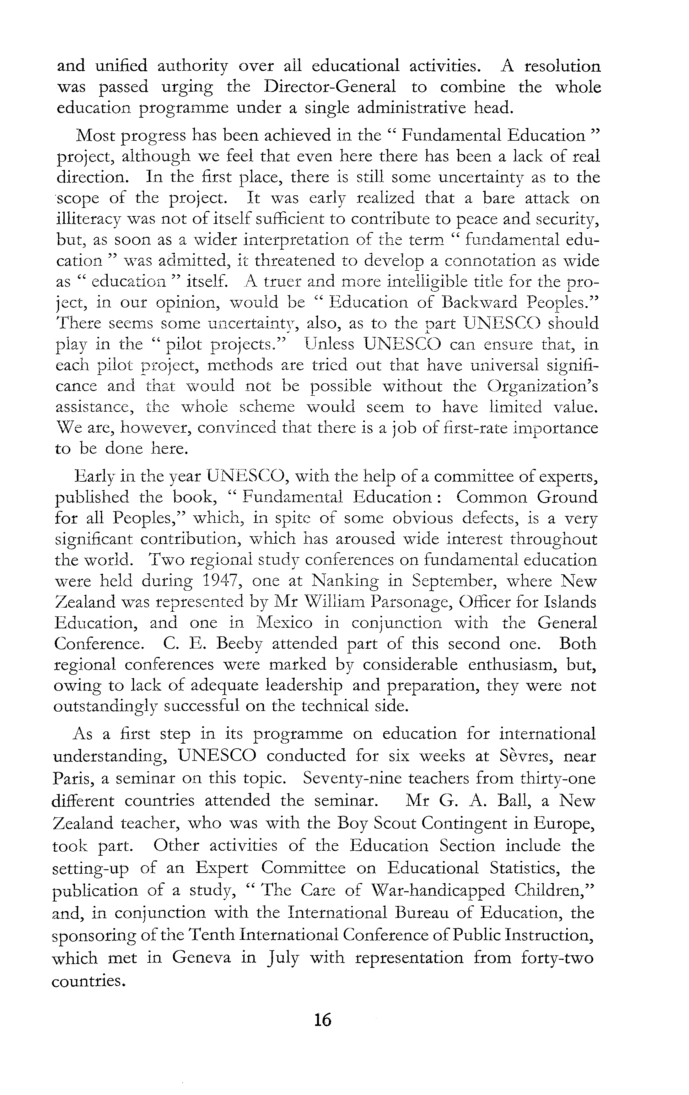 and unified authority over all educational activities. A resolution was passed urging the Director-General to combine the whole education programme under a single administrative head. Most progress has been achieved in the " Fundamental Education " project, although we feel that even here there has been a lack of real direction. In the first place, there is still some uncertainty as to the scope of the project. It was early realized that a bare attack on illiteracy was not of itself sufficient to contribute to peace and security, but, as soon as a wider interpretation of the term " fundamental education " was admitted, it threatened to develop a connotation as wide as " education " itself. A truer and more intelligible title for the project, in our opinion, would be " Education of Backward Peoples." There seems some uncertainty, also, as to the part UNESCO should play in the " pilot projects." Unless UNESCO can ensure that, in each pilot project, methods are tried out that have universal significance and that would not be possible without the Organization's assistance, the whole scheme would seem to have limited value. We are, however, convinced that there is a job of first-rate importance to be done here. Early in the year UNESCO, with the help of a committee of experts, published the book, " Fundamental Education : Common Ground for all Peoples," which, in spite of some obvious defects, is a very significant contribution, which has aroused wide interest throughout the world. Two regional study conferences on fundamental education were held during 1947, one at Nanking in September, where New Zealand was represented by Mr William Parsonage, Officer for Islands Education, and one in Mexico in conjunction with the General Conference. C. E. Beeby attended part of this second one. Both regional conferences were marked by considerable enthusiasm, but, owing to lack of adequate leadership and preparation, they were not outstandingly successful on the technical side. As a first step in its programme on education for international understanding, UNESCO conducted for six weeks at Sevres, near Paris, a seminar on this topic. Seventy-nine teachers from thirty-one different countries attended the seminar. Mr G. A. Ball, a New Zealand teacher, who was with the Boy Scout Contingent in Europe, took part. Other activities of the Education Section include the setting-up of an Expert Committee on Educational Statistics, the publication of a study, " The Care of War-handicapped Children," and, in conjunction with the International Bureau of Education, the sponsoring of the Tenth International Conference of Public Instruction, which met in Geneva in July with representation from forty-two countries.