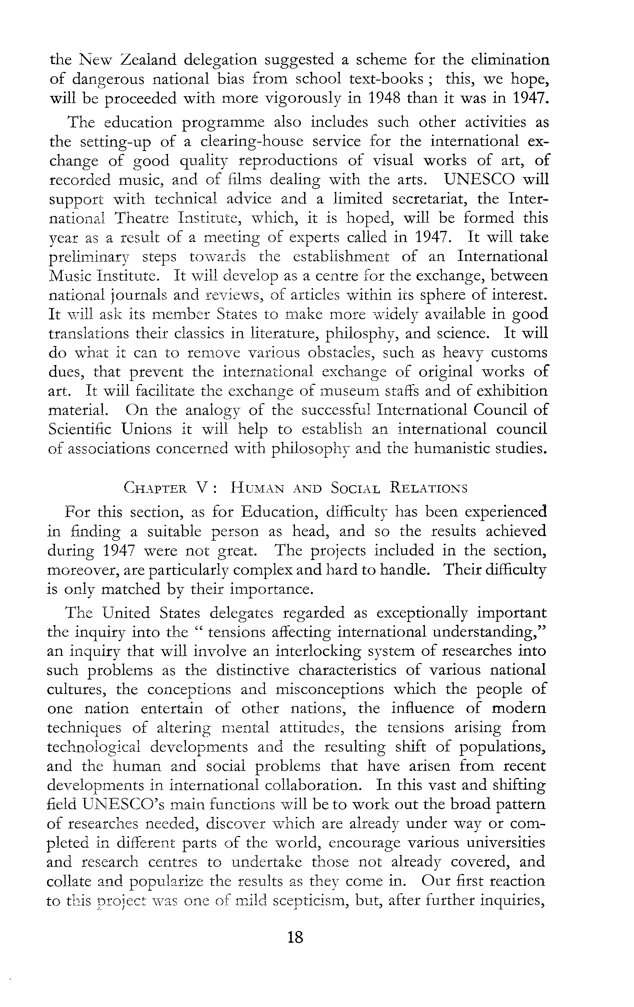 the New Zealand delegation suggested a scheme for the elimination of dangerous national bias from school text-books ; this, we hope, will be proceeded with more vigorously in 1948 than it was in 1947. The education programme also includes such other activities as the setting-up of a clearing-house service for the international exchange of good quality reproductions of visual works of art, of recorded music, and of films dealing with the arts. UNESCO will support with technical advice and a limited secretariat, the International Theatre Institute, which, it is hoped, will be formed this year as a result of a meeting of experts called in 1947. It will take preliminary steps towards the establishment of an International Music Institute. It will develop as a centre for the exchange, between national journals and reviews, of articles within its sphere of interest. It will ask its member States to make more widely available in good translations their classics in literature, philosphy, and science. It will do what it can to remove various obstacles, such as heavy customs dues, that prevent the international exchange of original works of art. It will facilitate the exchange of museum staffs and of exhibition material. On the analogy of the successful International Council of Scientific Unions it will help to establish an international council of associations concerned with philosophy and the humanistic studies. Chapter V: Human and Social Relations For this section, as for Education, difficulty has been experienced in finding a suitable person as head, and so the results achieved during 1947 were not great. The projects included in the section, moreover, are particularly complex and hard to handle. Their difficulty is only matched by their importance. The United States delegates regarded as exceptionally important the inquiry into the " tensions affecting international understanding," an inquiry that will involve an interlocking system of researches into such problems as the distinctive characteristics of various national cultures, the conceptions and misconceptions which the people of one nation entertain of other nations, the influence of modern techniques of altering mental attitudes, the tensions arising from technological developments and the resulting shift of populations, and the human and social problems that have arisen from recent developments in international collaboration. In this vast and shifting field UNESCO's main functions will be to work out the broad pattern of researches needed, discover which are already under way or completed in different parts of the world, encourage various universities and research centres to undertake those not already covered, and collate and popularize the results as they come in. Our first reaction to this project was one of mild scepticism, but, after further inquiries,