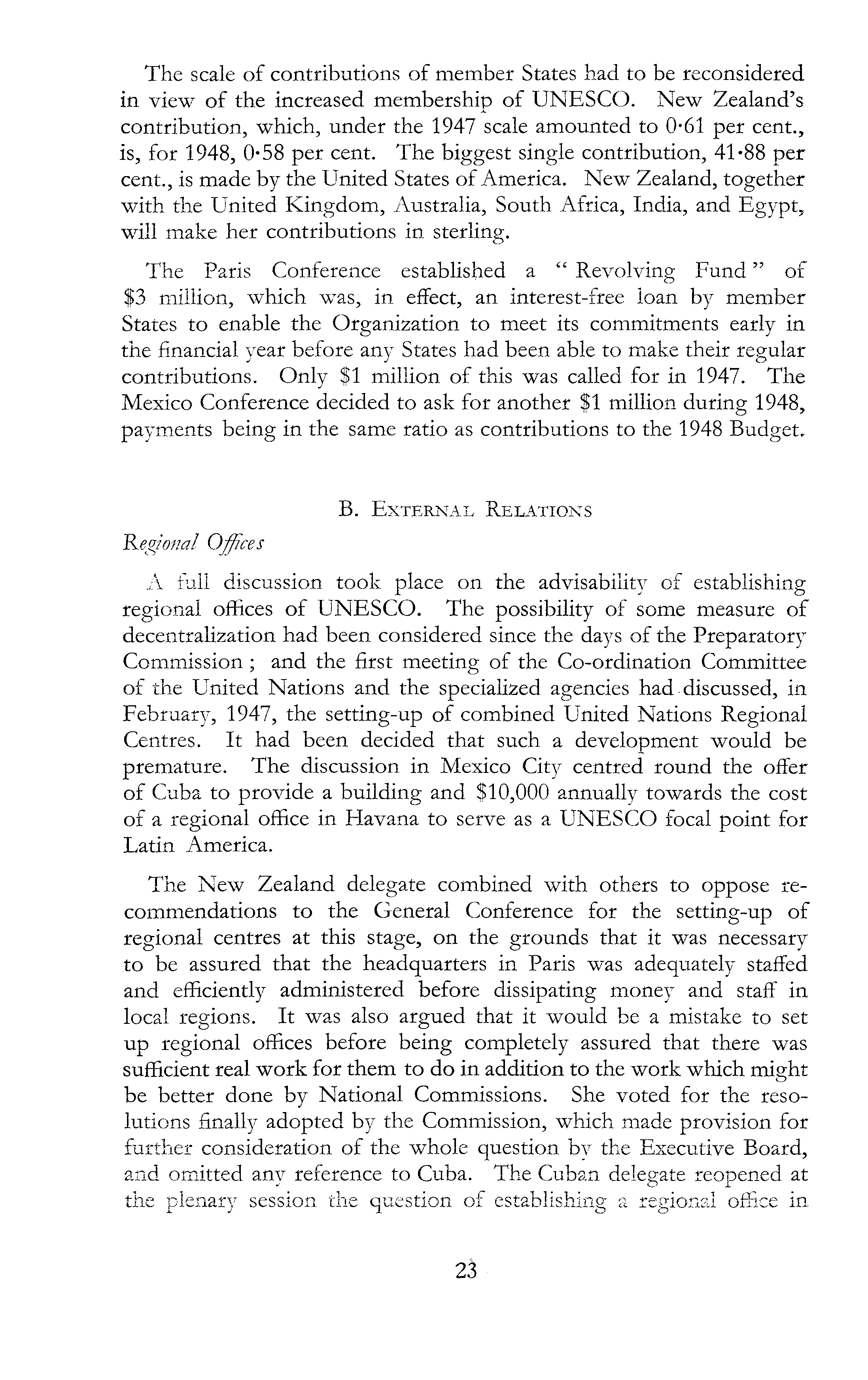 The scale of contributions of member States had to be reconsidered in view of the increased membership of UNESCO. New Zealand's contribution, which, under the 1947 scale amounted to 0-61 per cent., is, for 1948, 058 per cent. The biggest single contribution, 41-88 per cent., is made by the United States of America. New Zealand, together with the United Kingdom, Australia, South Africa, India, and Egypt, will make her contributions in sterling. The Paris Conference established a " Revolving Fund" of $3 million, which was, in effect, an interest-free loan by member States to enable the Organization to meet its commitments early in the financial year before any States had been able to make their regular contributions. Only $1 million of this was called for in 1947. The Mexico Conference decided to ask for another $1 million during 1948, payments being in the same ratio as contributions to the 1948 Budget. B. External Relations Regional Offices A full discussion took place on the advisability of establishing regional offices of UNESCO. The possibility of some measure of decentralization had been considered since the days of the Preparatory Commission; and the first meeting of the Co-ordination Committee of the United Nations and the specialized agencies had ■ discussed, in February, 1947, the setting-up of combined United Nations Regional Centres. It had been decided that such a development would be premature. The discussion in Mexico City centred round the offer of Cuba to provide a building and $lO,OOO annually towards the cost of a regional office in Havana to serve as a UNESCO focal point for Latin America. The New Zealand delegate combined with others to oppose recommendations to the General Conference for the setting-up of regional centres at this stage, on the grounds that it was necessary to be assured that the headquarters in Paris was adequately staffed and efficiently administered before dissipating money and staff in local regions. It was also argued that it would be a mistake to set up regional offices before being completely assured that there was sufficient real work for them to do in addition to the work which might be better done by National Commissions. She voted for the resolutions finally adopted by the Commission, which made provision for further consideration of the whole question by the Executive Board, and omitted any reference to Cuba. The Cuban delegate reopened at the plenary session the question of establishing a regional office in