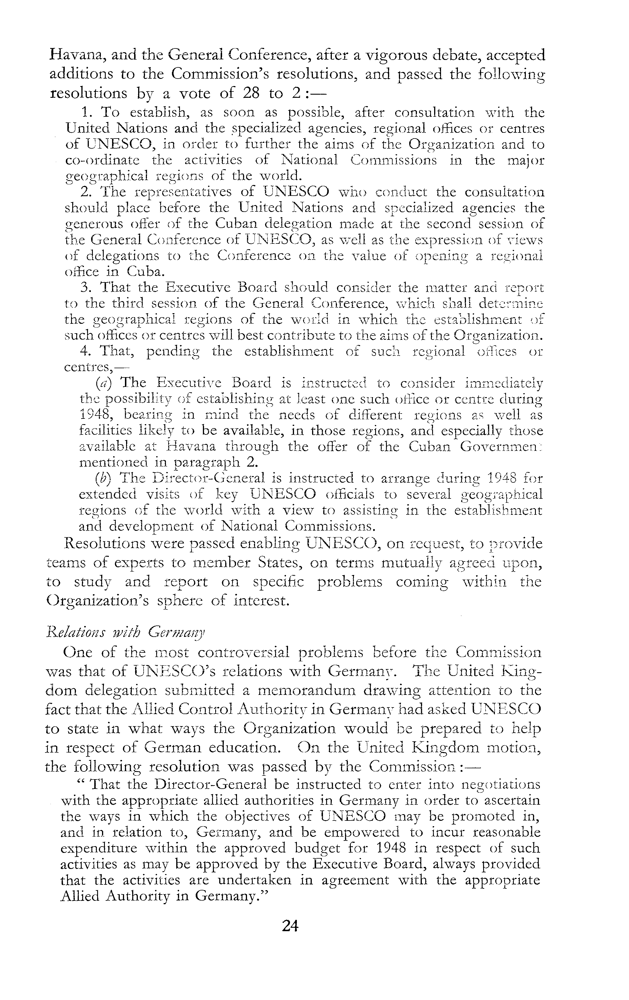 Havana, and the General Conference, after a vigorous debate, accepted additions to the Commission's resolutions, and passed the following resolutions by a vote of 28 to 2:— 1. To establish, as soon as possible, after consultation with the United Nations and the specialized agencies, regional offices or centres of UNESCO, in order to further the aims of the Organization and to co-ordinate the activities of National Commissions in the major geographical regions of the world. 2. The representatives of UNESCO who conduct the consultation should place before the United Nations and specialized agencies the generous offer of the Cuban delegation made at the second session of the General Conference of UNESCO, as well as the expression of views of delegations to the Conference on the value of opening a regional office in Cuba. 3. That the Executive Board should consider the matter and report to the third session of the General Conference, which shall determine the geographical regions of the world in which the establishment of such offices or centres will best contribute to the aims of the Organization. 4. That, pending the establishment of such regional offices or centres, — (a) The Executive Board is instructed to consider immediately the possibility of establishing at least one such office or centre during 1948, bearing in mind the needs of different regions as well as facilities likely to be available, in those regions, and especially those available at Havana through the offer of the Cuban Government mentioned in paragraph 2. (b) The Director-General is instructed to arrange during 1948 for extended visits of key UNESCO officials to several geographical regions of the world with a view to assisting in the establishment and development of National Commissions. Resolutions were passed enabling UNESCO, on request, to provide teams of experts to member States, on terms mutually agreed upon, to study and. report on specific problems coming within the Organization's sphere of interest. delations with Germany One of the most controversial problems before the Commission was that of UNESCO's relations with Germany. The United Kingdom delegation submitted a memorandum drawing attention to the fact that the Allied Control Authority in Germany had asked UNESCO to state in what ways the Organization would be prepared to help in respect of German education. On the United Kingdom motion, the following resolution was passed by the Commission: — " That the Director-General be instructed to enter into negotiations . with the appropriate allied authorities in Germany in order to ascertain the ways in which the objectives of UNESCO may be promoted in, and in relation to, Germany, and be empowered to incur reasonable expenditure within the approved budget for 1948 in respect of such activities as may be approved by the Executive Board, always provided that the activities are undertaken in agreement with the appropriate Allied Authority in Germany."