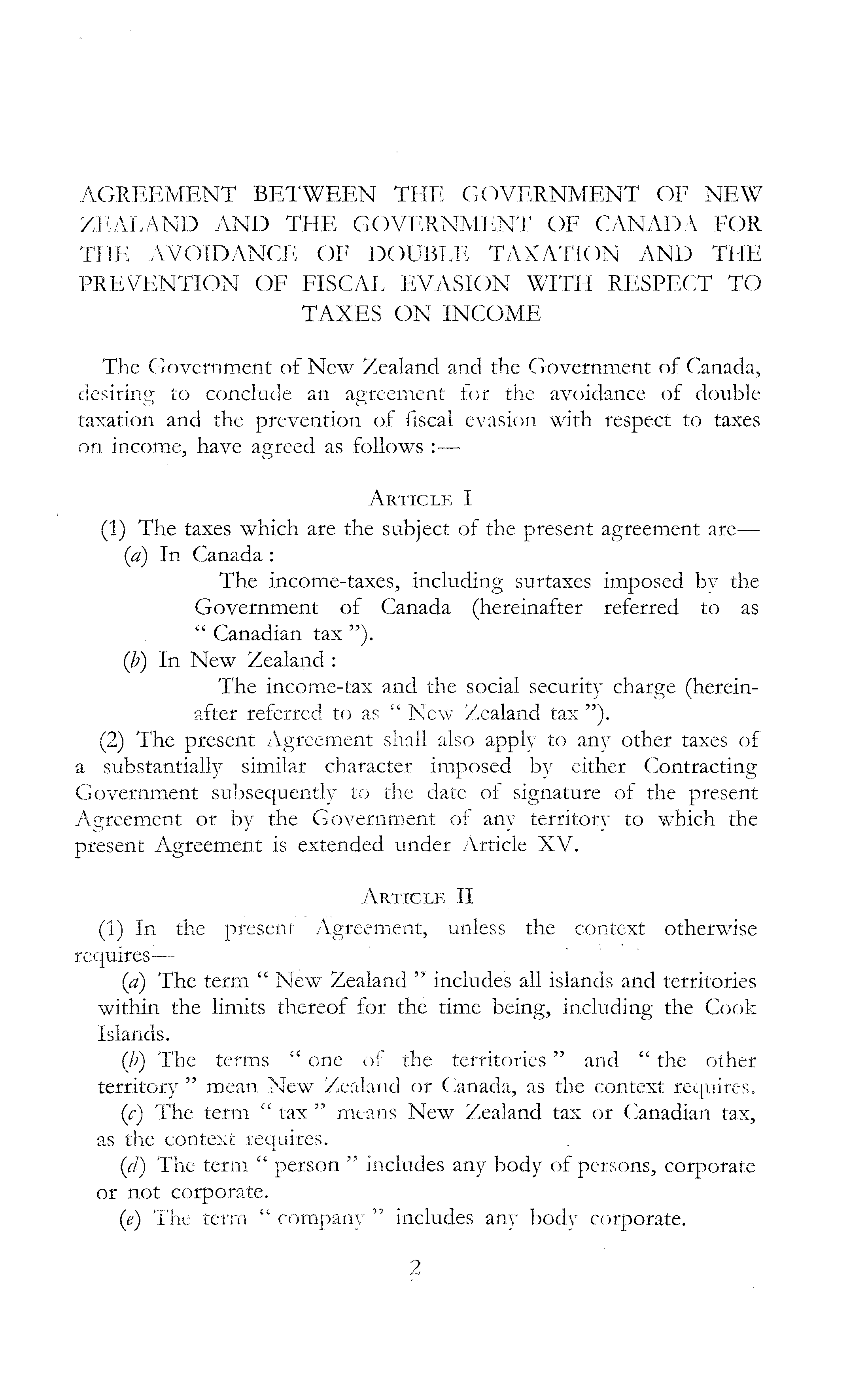 AGREEMENT BETWEEN THE GOVERNMENT OF NEW ZEALAND AND THE GOVERNMENT OF CANADA FOR THE AVOIDANCE OF DOUBLE TAXATION AND THE PREVENTION OF FISCAL EVASION WITH RESPECT TO TAXES ON INCOME The Government of New Zealand and the Government of Canada, desiring to conclude an agreement for the avoidance of double taxation and the prevention of fiscal evasion with respect to taxes on income, have agreed as follows : Article I (1) The taxes which are the subject of the present agreement are — (a) In Canada: The income-taxes, including surtaxes imposed by the Government of Canada (hereinafter referred to as " Canadian tax "). (b) In New Zealand : The income-tax and the social security charge (hereinafter referred to as " New Zealand tax "). (2) The present Agreement shall also apply to any other taxes of a substantially similar character imposed by either Contracting Government subsequently to the date of signature of the present Agreement or by the Government of any territory to which the present Agreement is extended under Article XV. Article II (1) In the present Agreement, unless the context otherwise requires—(a) The term " New Zealand " includes all islands and territories within the limits thereof for the time being, including the Cook Islands. (/;) The terms " one of the territories " and " the other territory " mean New Zealand or Canada, as the context requires. (c) The term " tax " means New Zealand tax or Canadian tax, as the context requires. (d) The term " person " includes any body of persons, corporate or not corporate. (e) The term " company " includes any body corporate.