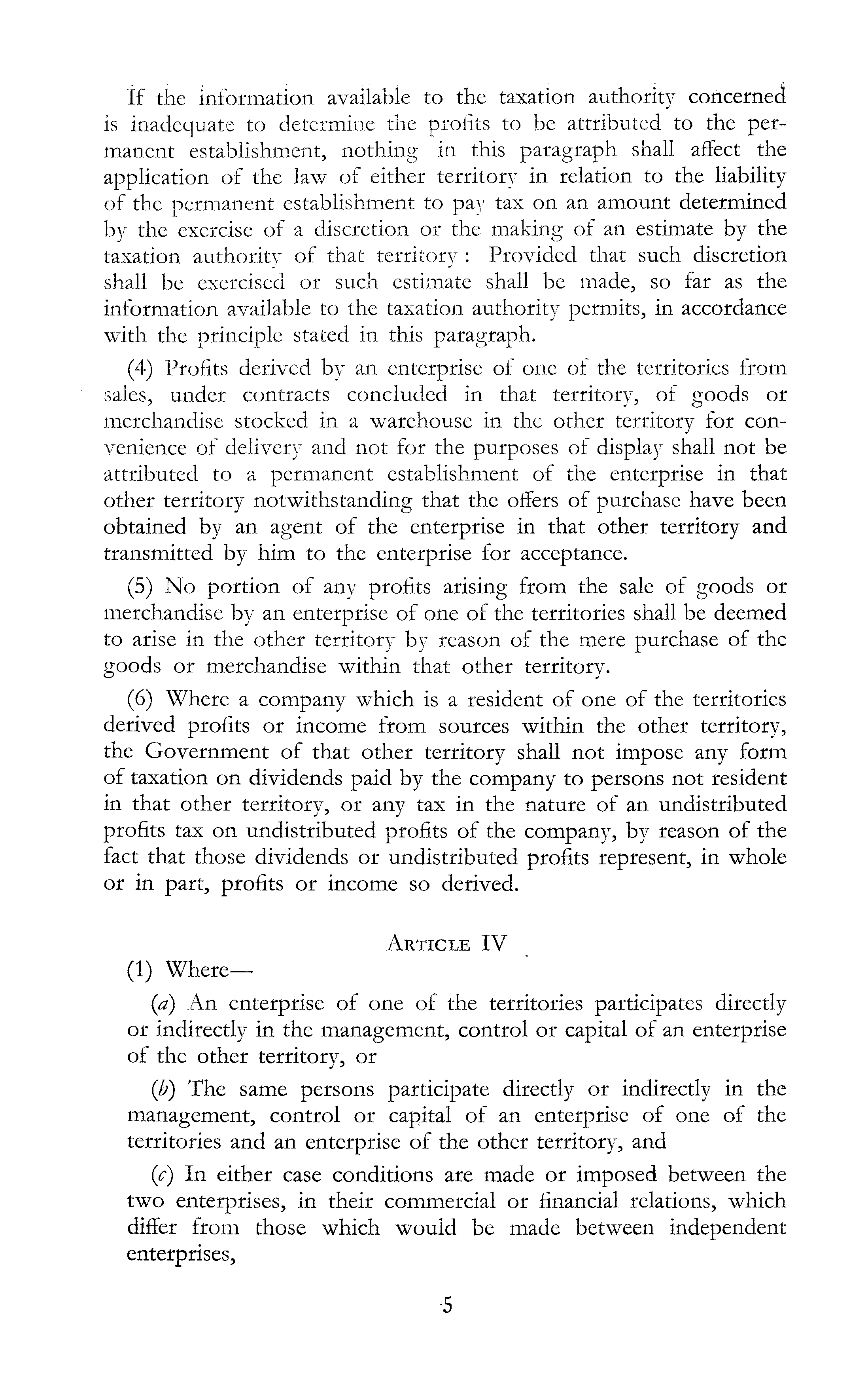 If the information available to the taxation authority concerned is inadequate to determine the profits to be attributed to the permanent establishment, nothing in this paragraph shall affect the application of the law of either territory in relation to the liability of the permanent establishment to pay tax on an amount determined by the exercise of a discretion or the making of an estimate by the taxation authority of that territory : Provided that such discretion shall be exercised or such estimate shall be made, so far as the information available to the taxation authority permits, in accordance with the principle stated in this paragraph. (4) Profits derived by an enterprise of one of the territories from sales, under contracts concluded in that territory, of goods or merchandise stocked in a warehouse in the other territory for convenience of delivery and not for the purposes of display shall not be attributed to a permanent establishment of the enterprise in that other territory notwithstanding that the offers of purchase have been obtained by an agent of the enterprise in that other territory and transmitted by him to the enterprise for acceptance. (5) No portion of any profits arising from the sale of goods or merchandise by an enterprise of one of the territories shall be deemed to arise in the other territory by reason of the mere purchase of the goods or merchandise within that other territory. (6) Where a company which is a resident of one of the territories derived profits or income from sources within the other territory, the Government of that other territory shall not impose any form of taxation on dividends paid by the company to persons not resident in that other territory, or any tax in the nature of an undistributed profits tax on undistributed profits of the company, by reason of the fact that those dividends or undistributed profits represent, in whole or in part, profits or income so derived. Article IV (1) Where—{a) An enterprise of one of the territories participates directly or indirectly in the management, control or capital of an enterprise of the other territory, or (b) The same persons participate directly or indirectly in the management, control or capital of an enterprise of one of the territories and an enterprise of the other territory, and (V) In either case conditions are made or imposed between the two enterprises, in their commercial or financial relations, which differ from those which would be made between independent enterprises,