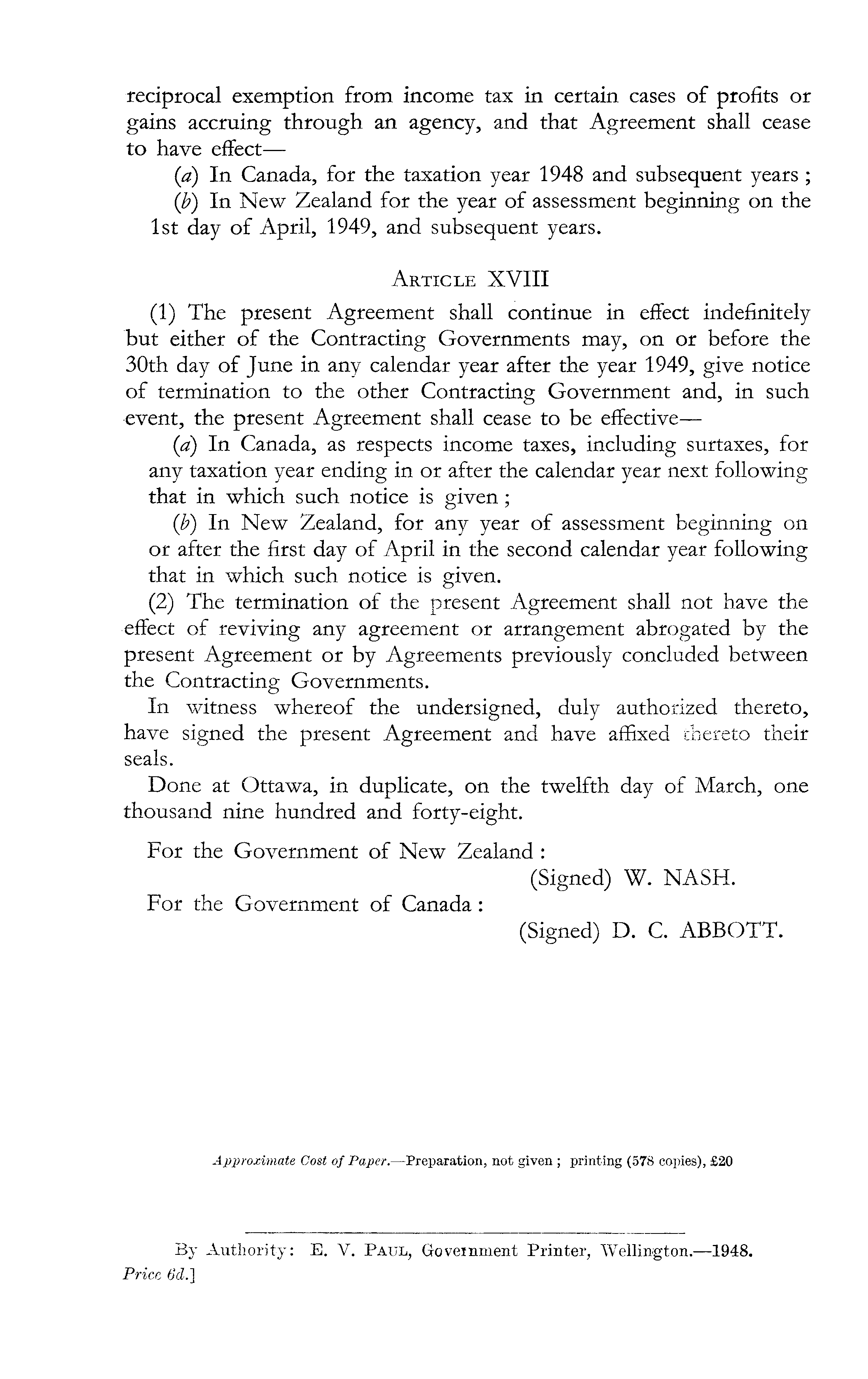 reciprocal exemption from income tax in certain cases of profits or gains accruing through an agency, and that Agreement shall cease to have effect—(a) In Canada, for the taxation year 1948 and subsequent years ; (b) In New Zealand for the year of assessment beginning on the Ist day of April, 1949, and subsequent years. Article XVIII (1) The present Agreement shall continue in effect indefinitely but either of the Contracting Governments may, on or before the 30th day of June in any calendar year after the year 1949, give notice of termination to the other Contracting Government and, in such event, the present Agreement shall cease to be effective—(a) In Canada, as respects income taxes, including surtaxes, for any taxation year ending in or after the calendar year next following that in which such notice is given; (b) In New Zealand, for any year of assessment beginning on or after the first day of April in the second calendar year following that in which such notice is given. (2) The termination of the present Agreement shall not have the effect of reviving any agreement or arrangement abrogated by the present Agreement or by Agreements previously concluded between the Contracting Governments. In witness whereof the undersigned, duly authorized thereto, have signed the present Agreement and have affixed thereto their seals. Done at Ottawa, in duplicate, on the twelfth day of March, one thousand nine hundred and forty-eight. For the Government of New Zealand : (Signed) W. NASH. For the Government of Canada : (Signed) D. C. ABBOTT.