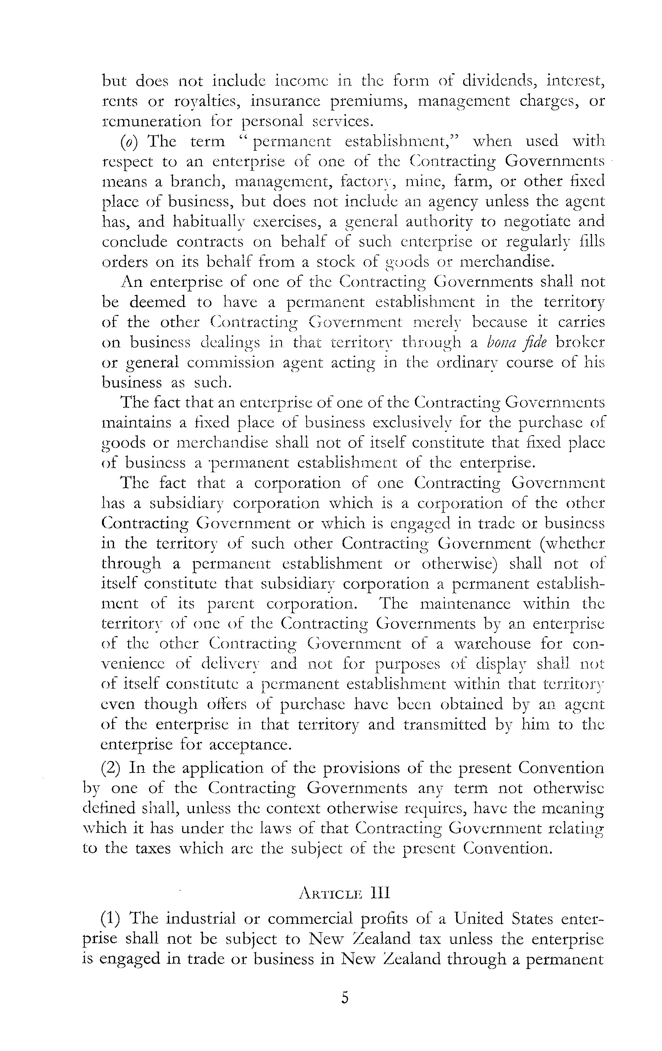 but does not include income in the form of dividends, interest, rents or royalties, insurance premiums, management charges, or remuneration for personal services. (io) The term " permanent establishment," when used with respect to an enterprise of one of the Contracting Governments means a branch, management, factory, mine, farm, or other fixed place of business, but does not include an agency unless the agent has, and habitually exercises, a general authority to negotiate and conclude contracts on behalf of such enterprise or regularly fills orders on its behalf from a stock of goods or merchandise. An enterprise of one of the Contracting Governments shall not be deemed to have a permanent establishment in the territory of the other Contracting Government merely because it carries on business dealings in that territory through a bona fide broker or general commission agent acting in the ordinary course of his business as such. The fact that an enterprise of one of the Contracting Governments maintains a fixed place of business exclusively for the purchase of goods or merchandise shall not of itself constitute, that fixed place of business a -permanent establishment of the enterprise. The fact that a corporation of one Contracting Government has a subsidiary corporation which is a corporation of the other Contracting Government or which is engaged in trade or business in the territory of such other Contracting Government (whether through a permanent establishment or otherwise) shall not of itself constitute that subsidiary corporation a permanent establishment of its parent corporation. The maintenance within the territory of one of the Contracting Governments by an enterprise of the other Contracting Government of a warehouse for convenience of delivery and not for purposes of display shall not of itself constitute a permanent establishment within that territory even though offers of purchase have been obtained by an agent of the enterprise in that territory and transmitted by him to the enterprise for acceptance. (2) In the application of the provisions of the present Convention by one of the Contracting Governments any term not otherwise defined shall, unless the context otherwise requires, have the meaning which it has under the laws of that Contracting Government relating to the taxes which are the subject of the present Convention. Article 111 (1) The industrial or commercial profits of a United States enterprise shall not be subject to New Zealand tax unless the enterprise is engaged in trade or business in New Zealand through a permanent