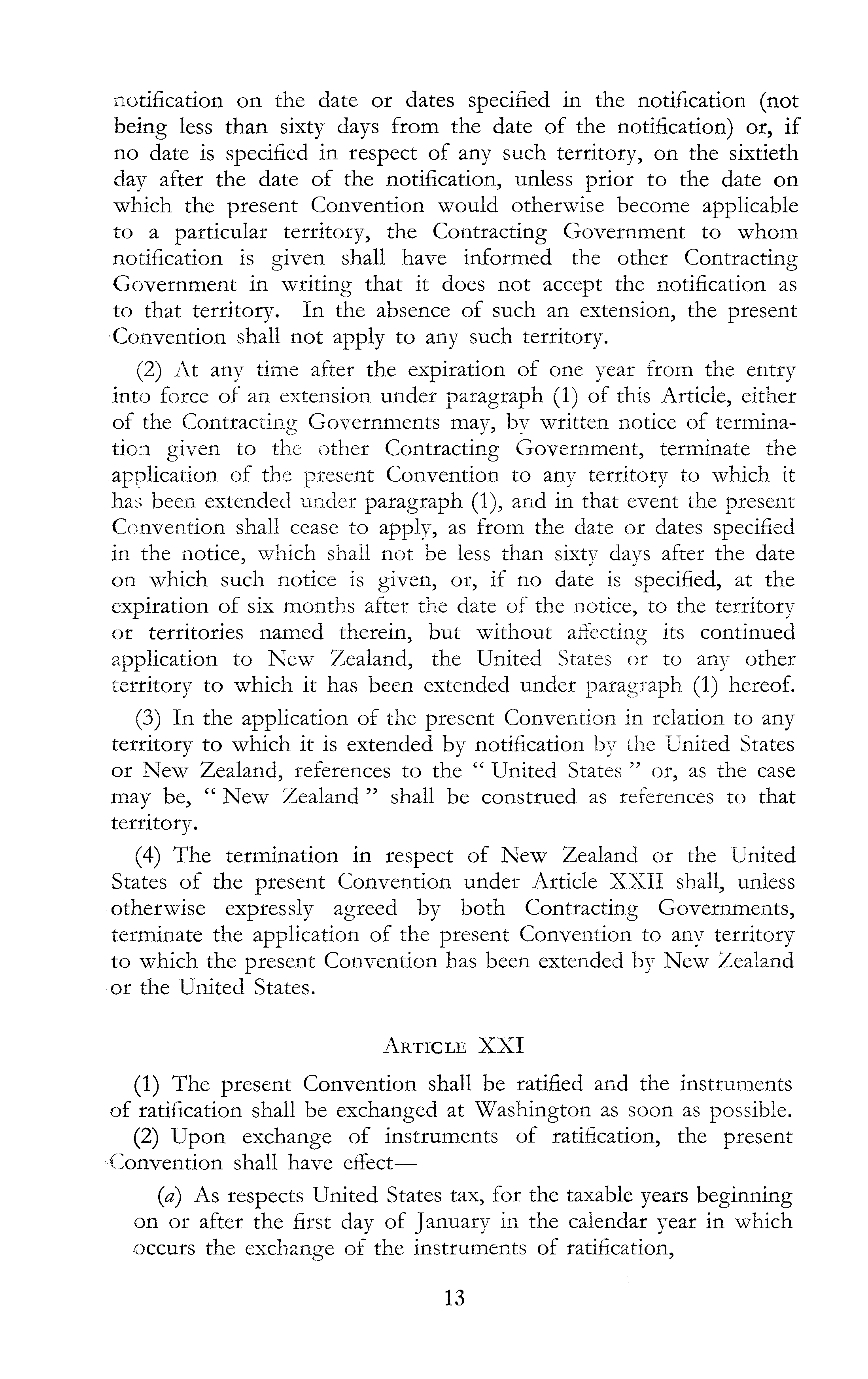 notification on the date or dates specified in the notification (not being less than sixty days from the date of the notification) or, if no date is specified in respect of any such territory, on the sixtieth day after the date of the notification, unless prior to the date on which the present Convention would otherwise become applicable to a particular territory, the Contracting Government to whom notification is given shall have informed the other Contracting Government in writing that it does not accept the notification as to that territory. In the absence of such an extension, the present •Convention shall not apply to any such territory. (2) At any time after the expiration of one year from the entry into force of an extension under paragraph (1) of this Article, either of the Contracting Governments may, by written notice of termination given to the other Contracting Government, terminate the application of the present Convention to any territory to which it has been extended under paragraph (1), and in that event the present Convention shall cease to apply, as from the date or dates specified in the notice, which shall not be less than sixty days after the date on which such notice is given, or, if no date is specified, at the expiration of six months after the date of the notice, to the territory or territories named therein, but without affecting its continued application to New Zealand, the United States or to any other territory to which it has been extended under paragraph (1) hereof. (3) In the application of the present Convention in relation to any territory to which it is extended by notification by the United States or New Zealand, references to the " United States " or, as the case may be, " New Zealand " shall be construed as references to that territory. (4) The termination in respect of New Zealand or the United States of the present Convention under Article XXII shall, unless •otherwise expressly agreed by both Contracting Governments, terminate the application of the present Convention to any territory to which the present Convention has been extended by New Zealand or the United States. Article XXI (1) The present Convention shall be ratified and the instruments of ratification shall be exchanged at Washington as soon as possible. (2) Upon exchange of instruments of ratification, the present Convention shall have effect—(a) As respects United States tax, for the taxable years beginning on or after the first day of January in the calendar year in which occurs the exchange of the instruments of ratification,