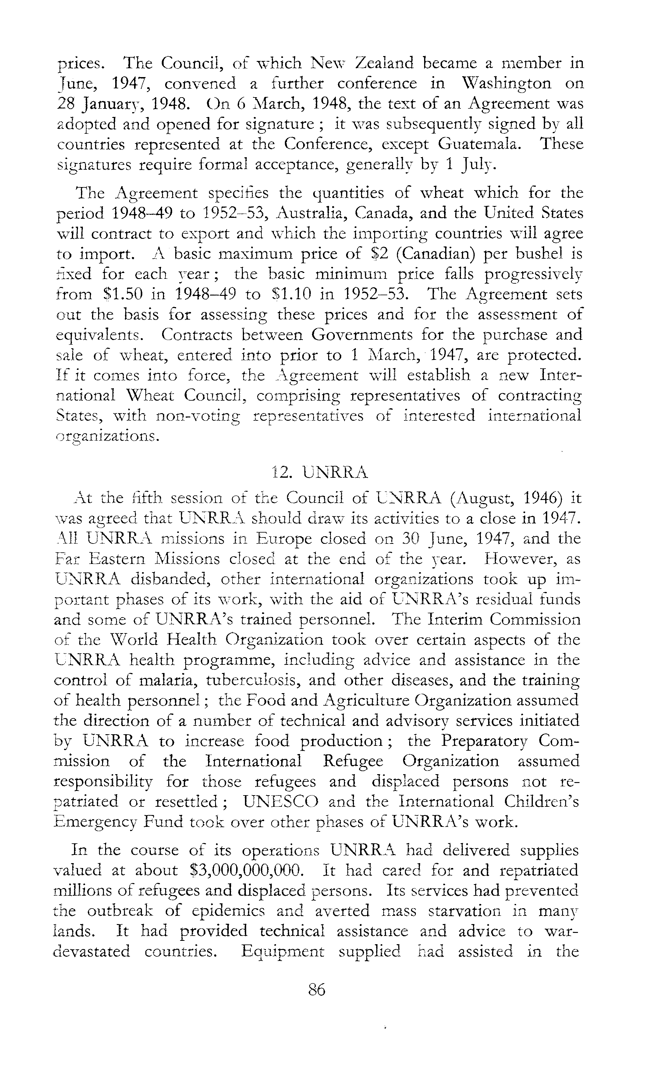 prices. The Council, of which New Zealand became a member in June, 1947, convened a further conference in Washington on 28 January, 1948. On 6 March, 1948, the text of an Agreement was adopted and opened for signature; it was subsequently signed by all countries represented at the Conference, except Guatemala. These signatures require formal acceptance, generally by 1 July. The Agreement specifies the quantities of wheat which for the period 1948-49 to 1952-53, Australia, Canada, and the United States will contract to export and which the importing countries will agree to import. A basic maximum price of $2 (Canadian) per bushel is fixed for each year; the basic minimum price falls progressively from $1.50 in 1948-49 to sl.lO in 1952-53. The Agreement sets out the basis for assessing these prices and for the assessment of equivalents. Contracts between Governments for the purchase and sale of wheat, entered into prior to 1 March, 1947, are protected. If it comes into force, the Agreement will establish a new International Wheat Council, comprising representatives of contracting States, with non-voting representatives of interested international organizations. 12. UNRRA At the fifth session of the Council of UNRRA (August, 1946) it was agreed that UNRRA should draw its activities to a close in 1947. All UNRRA missions in Europe closed on 30 June, 1947, and the Far Eastern Missions closed at the end of the year. However, as UNRRA disbanded, other international organizations took up important phases of its work, with the aid of UNRRA's residual funds and some of UNRRA's trained personnel. The Interim Commission of the World Health Organization took over certain aspects of the UNRRA health programme, including advice and assistance in the control of malaria, tuberculosis, and other diseases, and the training of health personnel; the Food and Agriculture Organization assumed the direction of a number of technical and advisory services initiated by UNRRA to increase food production; the Preparatory Commission of the International Refugee Organization assumed responsibility for those refugees and displaced persons not repatriated or resettled; UNESCO and the International Children's Emergency Fund took over other phases of UNRRA's work. In the course of its operations UNRRA had delivered supplies valued at about $3,000,000,000. It had cared for and repatriated millions of refugees and displaced persons. Its services had prevented the outbreak of epidemics and averted mass starvation in many lands. It had provided technical assistance and advice to wardevastated countries. Equipment supplied had assisted in the