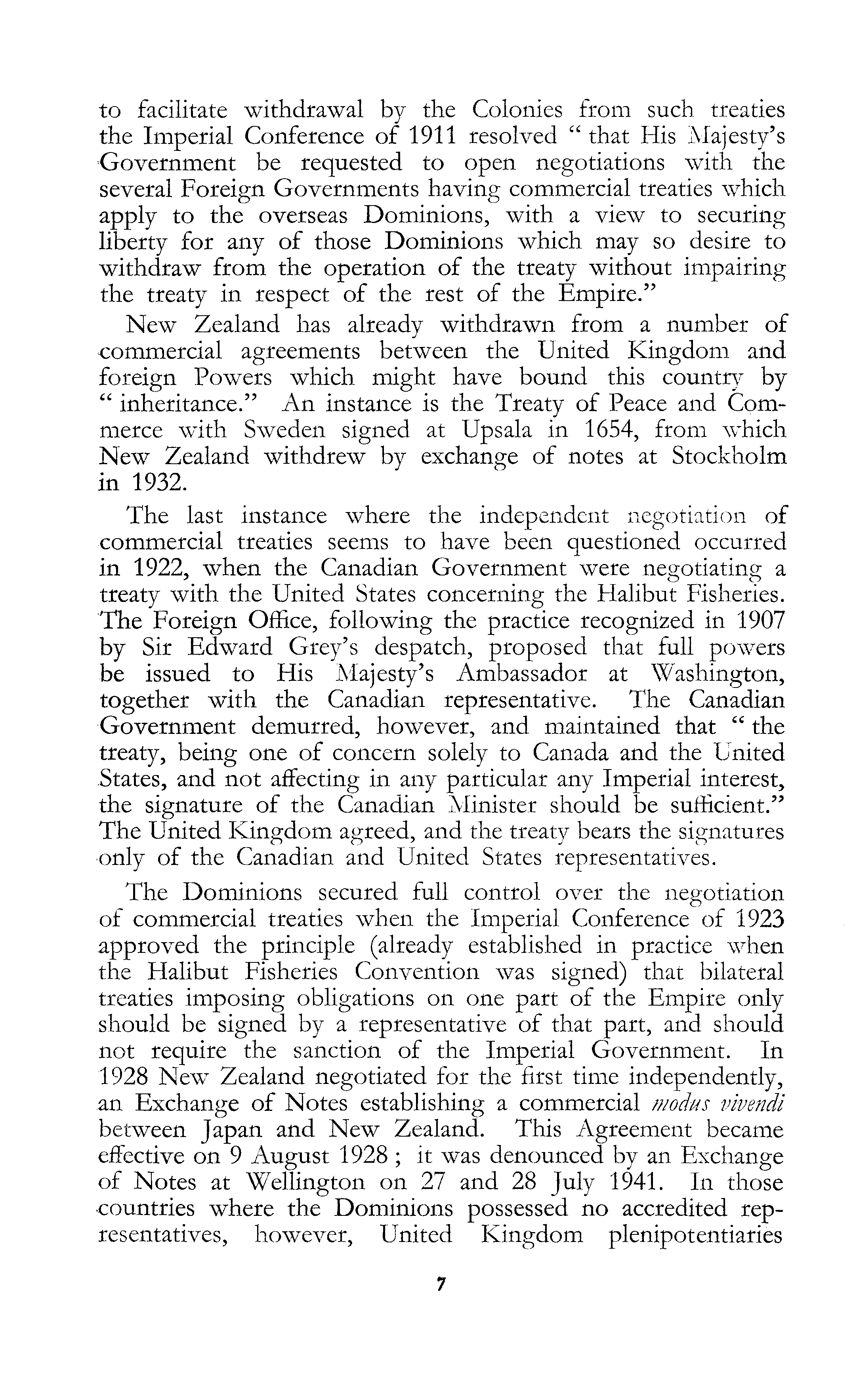 to facilitate withdrawal by the Colonies from such treaties the Imperial Conference of 1911 resolved " that His Majesty's Government be requested to open negotiations with the several Foreign Governments having commercial treaties which apply to the overseas Dominions, with a view to securing liberty for any of those Dominions which may so desire to withdraw from the operation of the treaty without impairing the treaty in respect of the rest of the Empire." New Zealand has already withdrawn from a number of commercial agreements between the United Kingdom and foreign Powers which might have bound this country by " inheritance." An instance is the Treaty of Peace and Commerce with Sweden signed at Upsala in 1654, from which New Zealand withdrew by exchange of notes at Stockholm in 1932. The last instance where the independent negotiation of commercial treaties seems to have been questioned occurred in 1922, when the Canadian Government were negotiating a treaty with the United States concerning the Halibut Fisheries. The Foreign Office, following the practice recognized in 1907 by Sir Edward Grey's despatch, proposed that full powers be issued to His Majesty's Ambassador at Washington, together with the Canadian representative. The Canadian Government demurred, however, and maintained that " the treaty, being one of concern solely to Canada and the United States, and not affecting in any particular any Imperial interest, the signature of the Canadian Minister should be sufficient." The United Kingdom agreed, and the treaty bears the signatures only of the Canadian and United States representatives. The Dominions secured full control over the negotiation of commercial treaties when the Imperial Conference of 1923 approved the principle (already established in practice when the Halibut Fisheries Convention was signed) that bilateral treaties imposing obligations on one part of the Empire only should be signed by a representative of that part, and should not require the sanction of the Imperial Government. In 1928 New Zealand negotiated for the first time independently, an Exchange of Notes establishing a commercial modus vivendi between Japan and New Zealand. This Agreement became effective on 9 August 1928 ; it was denounced by an Exchange of Notes at Wellington on 27 and 28 July 1941. In those countries where the Dominions possessed no accredited representatives, however, United Kingdom plenipotentiaries