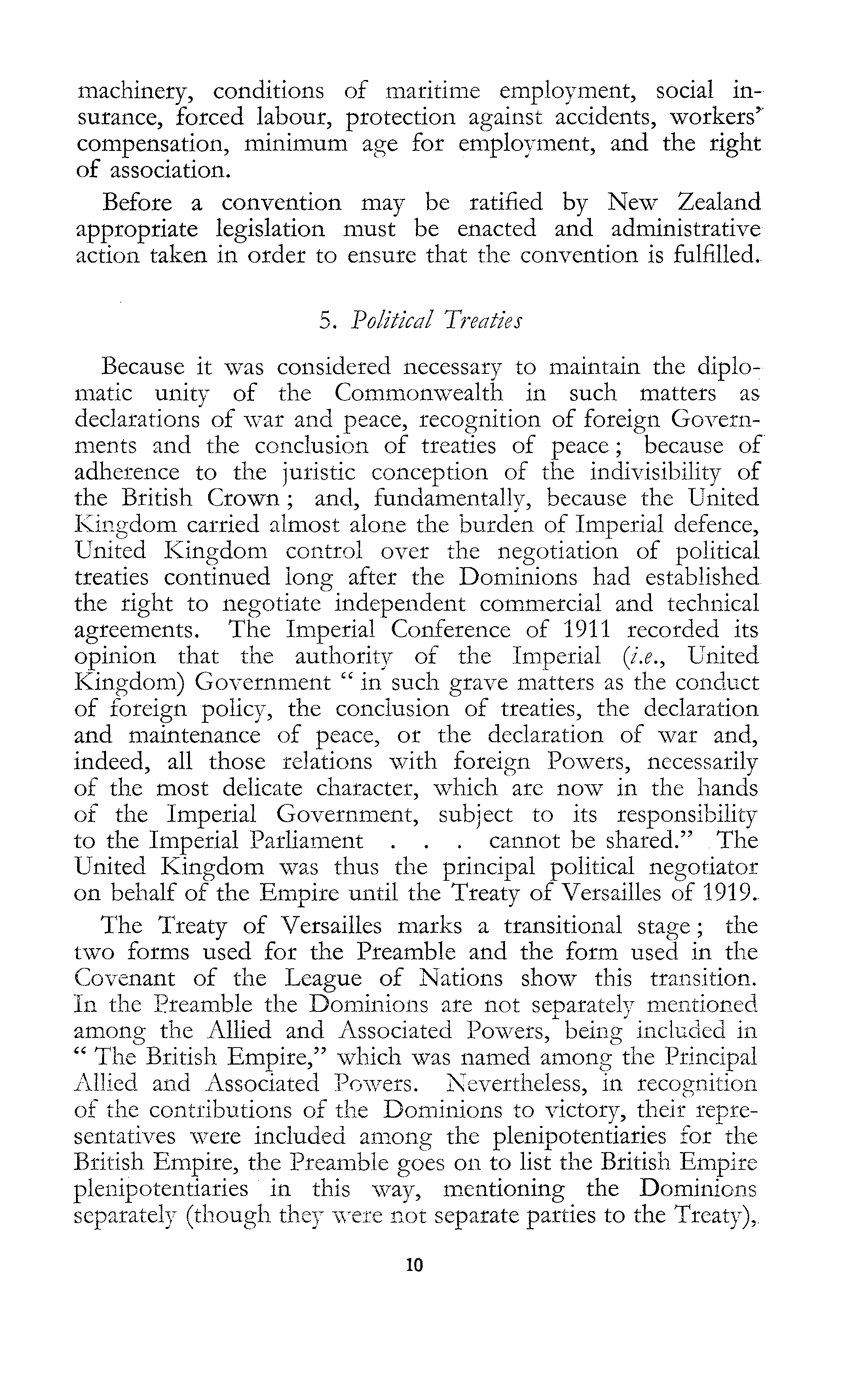 5. Political Treaties Because it was considered necessary to maintain the diplomatic unity of the Commonwealth in such matters as declarations of war and peace, recognition of foreign Governments and the conclusion of treaties of peace; because of adherence to the juristic conception of the indivisibility of the British Crown; and, fundamentally, because the United Kingdom carried almost alone the burden of Imperial defence, United Kingdom control over the negotiation of political treaties continued long after the Dominions had established the right to negotiate independent commercial and technical agreements. The Imperial Conference of 1911 recorded its opinion that the authority of the Imperial (i.e., United Kingdom) Government " in such grave matters as the conduct of foreign policy, the conclusion of treaties, the declaration and maintenance of peace, or the declaration of war and, indeed, all those relations with foreign Powers, necessarily of the most delicate character, which are now in the hands of the Imperial Government, subject to its responsibility to the Imperial Parliament . . . cannot be shared." The United Kingdom was thus the principal political negotiator on behalf of the Empire until the Treaty of Versailles of 1919The Treaty of Versailles marks a transitional stage; the two forms used for the Preamble and the form used in the Covenant of the League of Nations show this transition. In the Preamble the Dominions are not separately mentioned among the Allied and Associated Powers, being included in " The British Empire," which was named among the Principal Allied and Associated Powers. Nevertheless, in recognition of the contributions of the Dominions to victory, their representatives were included among the plenipotentiaries for the British Empire, the Preamble goes on to list the British Empire plenipotentiaries in this way, mentioning the Dominions separately (though they were not separate parties to the Treaty),.
