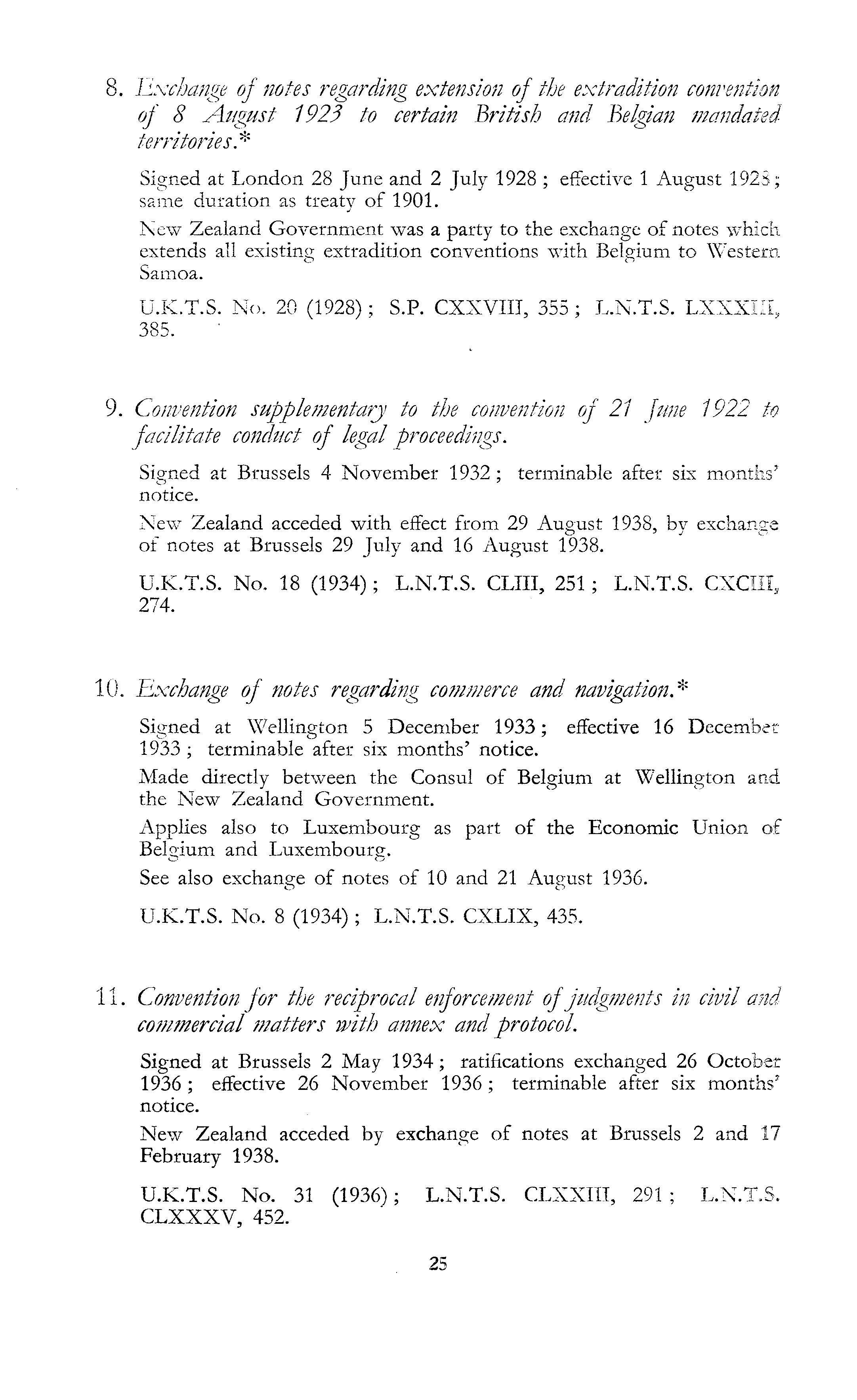 8. Exchange of notes regarding extension of the extradition convention of 8 August 1923 to certain British and Belgian mandated territories* Signed at London 28 June and 2 July 1928 ; effective 1 August 1928; same duration as treaty of 1901. New Zealand Government was a party to the exchange of notes which extends all existing extradition conventions with Belgium to Western Samoa. U.K.T.S. No. 20 (1928); S.P. CXXVIIJ, 355; L.N.T.S. LXXXXII, 385. 9. Convention supplementary to the convention of 21 June 1922 to facilitate conduct of legal proceedings. Signed at Brussels 4 November 1932; terminable after six months' notice. New Zealand acceded with effect from 29 August 1938, by exchange of notes at Brussels 29 July and 16 August 1938. U.K.T.S. No. 18 (1934); L.N.T.S. CLIII, 251 ; L.N.T.S. CXCIIX, 274. 10. Exchange of notes regarding commerce and navigation* Signed at Wellington 5 December 1933; effective 16 December 1933 ; terminable after six months' notice. Made directly between the Consul of Belgium at Wellington and the New Zealand Government. Applies also to Luxembourg as part of the Economic Union of Belgium and Luxembourg. See also exchange of notes of 10 and 21 August 1936. U.K.T.S. No. 8 (1934); L.N.T.S. CXLIX, 435. 11. Convention for the reciprocal enforcement of judgments in civil and commercial matters with annex and protocol. Signed at Brussels 2 May 1934; ratifications exchanged 26 October 1936; effective 26 November 1936 ; terminable after six months' notice. New Zealand acceded by exchange of notes at Brussels 2 and 17 February 1938. U.K.T.S. No. 31 (1936); L.N.T.S. CLXXIII, 291 ; L.N.T.S. CLXXXV, 452.