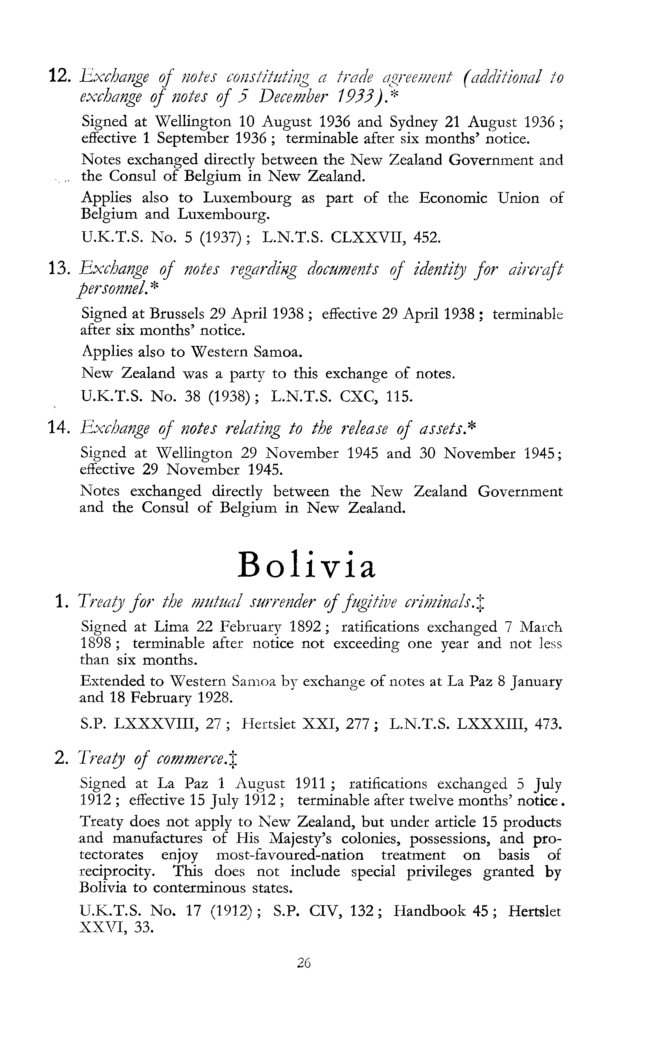 12. Exchange of notes constituting a trade agreement (additional to exchange of notes of 5 December 1933).* Signed at Wellington 10 August 1936 and Sydney 21 August 1936; effective 1 September 1936 ; terminable after six months' notice. Notes exchanged directly between the New Zealand Government and N „ the Consul of Belgium in New Zealand. Applies also to Luxembourg as part of the Economic Union of Belgium and Luxembourg. U.K.T.S. No. 5 (1937); L.N.T.S. CLXXVII, 452. 13. Exchange of notes regarding documents of identity for aircraft personnel* Signed at Brussels 29 April 1938 ; effective 29 April 1938 ; terminable after six months' notice. Applies also to Western Samoa. New Zealand was a party to this exchange of notes. U.K.T.S. No. 38 (1938); L.N.T.S. CXC, 115. 14. Exchange of notes relating to the release of assets* Signed at Wellington 29 November 1945 and 30 November 1945; effective 29 November 1945. Notes exchanged directly between the New Zealand Government and the Consul of Belgium in New Zealand. Bolivia 1. Treaty for the mutual surrender of fugitive criminals.% Signed at Lima 22 February 1892; ratifications exchanged 7 March 1898; terminable after notice not exceeding one year and not less than six months. Extended to Western Samoa by exchange of notes at La Paz 8 January and 18 February 1928. S.P. LXXXVIII, 27; Hertslet XXI, 277; L.N.T.S. LXXXIII, 473. 2. Treaty of commerce.% Signed at La Paz 1 August 1911 ; ratifications exchanged 5 July 1912 ; effective 15 July 1912 ; terminable after twelve months' notice. Treaty does not apply to New Zealand, but under article 15 products and manufactures of His Majesty's colonies, possessions, and protectorates enjoy most-favoured-nation treatment on basis of reciprocity. This does not include special privileges granted by Bolivia to conterminous states. U.K.T.S. No. 17 (1912); S.P. CIV, 132; Handbook 45; Hertslet XXVI, 33.