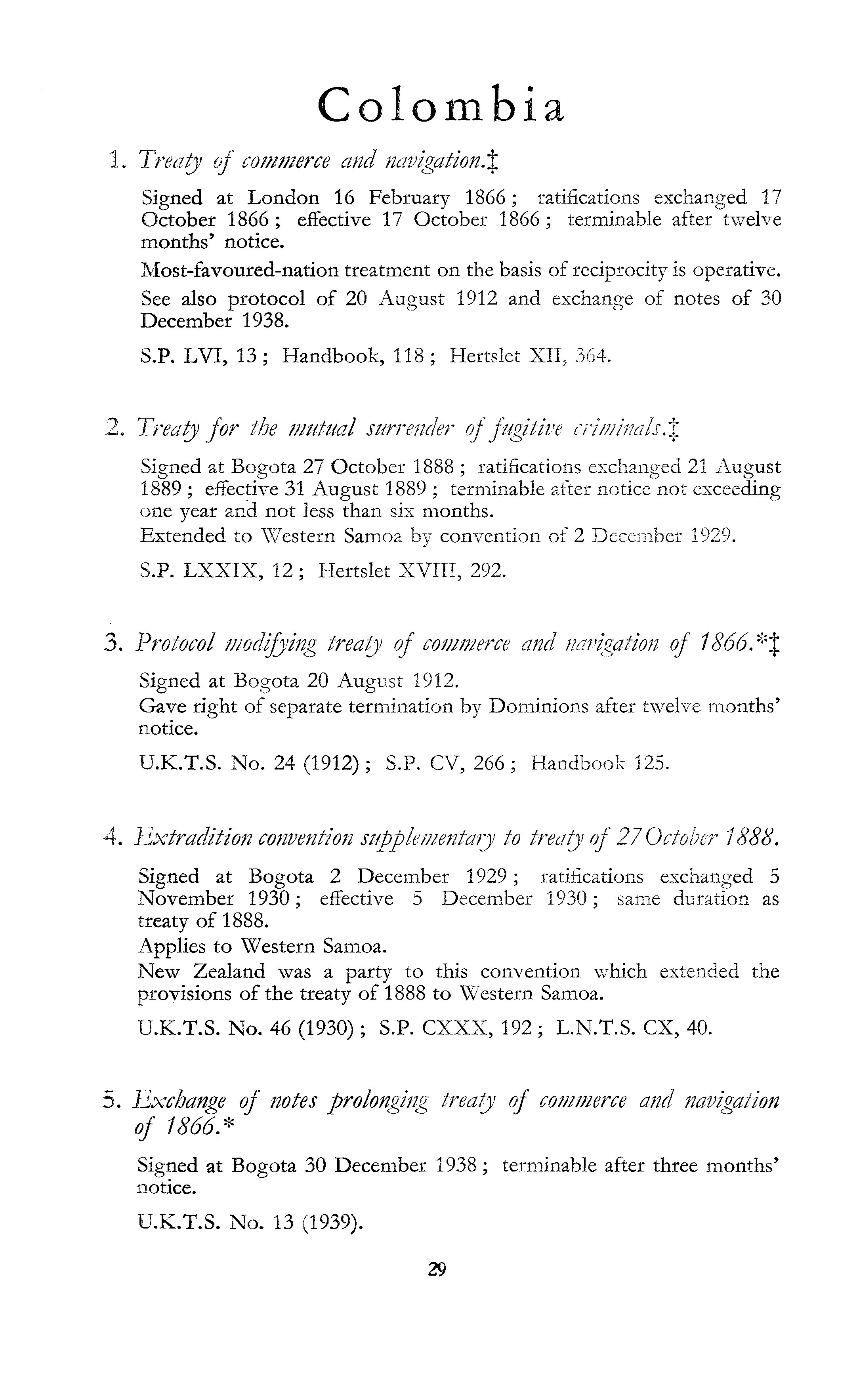 Colombia 1. Treaty of commerce and navigation.% Signed at London 16 February 1866; ratifications exchanged 17 October 1866 ; effective 17 October 1866 ; terminable after twelve months' notice. Most-favoured-nation treatment on the basis of reciprocity is operative. See also protocol of 20 August 1912 and exchange of notes of 30 December 1938. S.P. LVI, 13 ; Handbook, 118 ; Hertslet XII, 364. 2. Treaty for the mutual surrender of fugitive criminals.% Signed at Bogota 27 October 1888 ; ratifications exchanged 21 August 1889; effective 31 August 1889 ; terminable after notice not exceeding one year and not less than six months. Extended to Western Samoa by convention of 2 December 1929. S.P. LXXIX, 12 ; Hertslet XVIII, 292. 3. Protocol modifying treaty of commerce and navigation of 1866.*% Signed at Bogota 20 August 1912. Gave right of separate termination by Dominions after twelve months' notice. U.K.T.S. No. 24 (1912) ; S.P. CV, 266 ; Handbook 125. 4. Extradition convention supplementary to treaty of 27 October 1888. Signed at Bogota 2 December 1929; ratifications exchanged 5 November 1930; effective 5 December 1930; same duration as treaty of 1888. Applies to Western Samoa. New Zealand was a party to this convention which extended the provisions of the treaty of 1888 to Western Samoa. U.K.T.S. No. 46 (1930); S.P. CXXX, 192 ; L.N.T.S. CX, 40. 5. Exchange of notes prolonging treaty of commerce and navigation of 1866* Signed at Bogota 30 December 1938; terminable after three months' notice. U.K.T.S. No. 13 (1939).