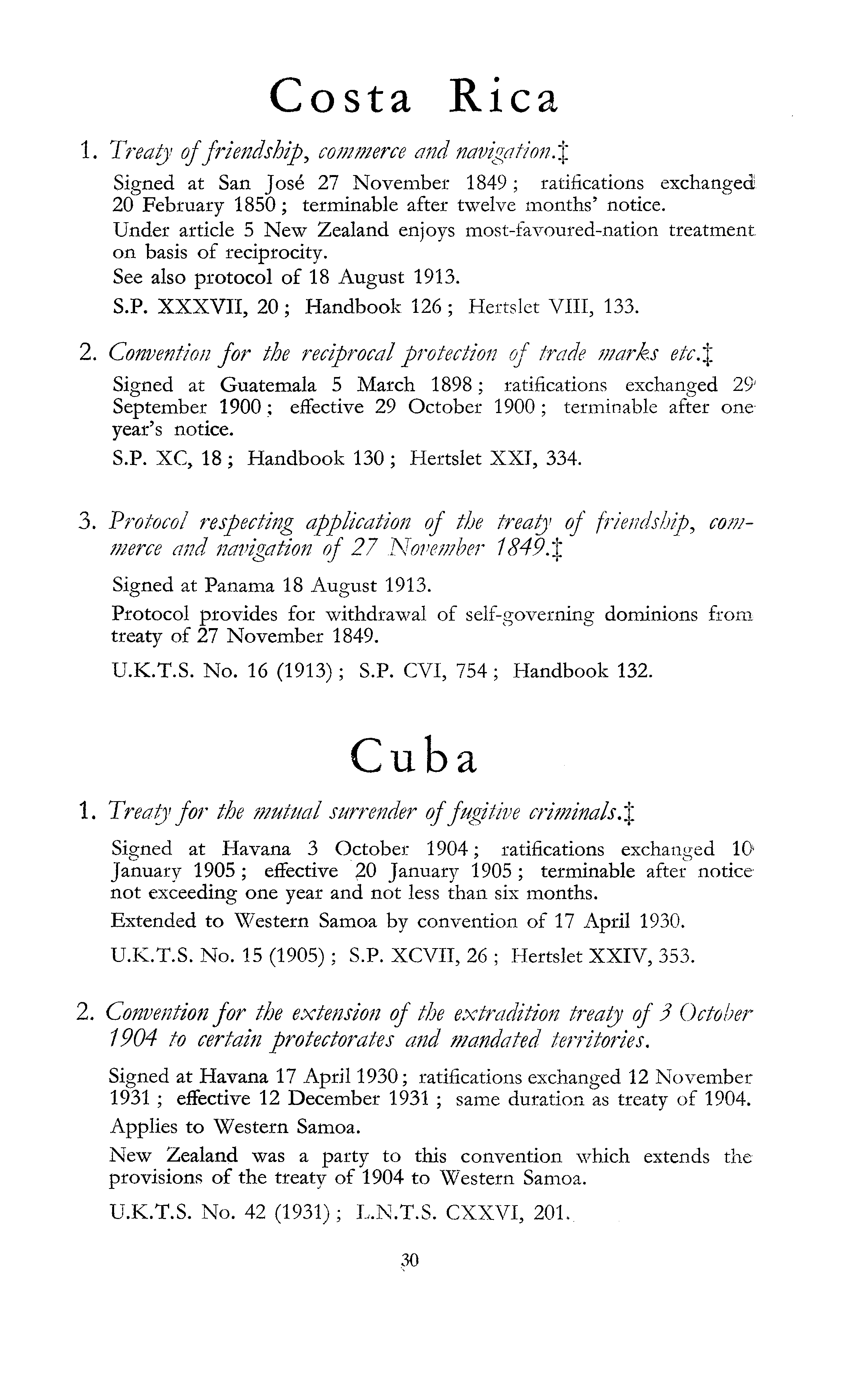 Costa Rica 1. Treaty of friendship, commerce and navigation.% Signed at San Jose 27 November 1849; ratifications exchanged 20 February 1850; terminable after twelve months' notice. Under article 5 New Zealand enjoys most-favoured-nation treatment on basis of reciprocity. See also protocol of 18 August 1913. S.P. XXXVII, 20 ; Handbook 126 ; Hertslet VIII, 133. 2. Convention for the reciprocal protection of trade marks etc.% Signed at Guatemala 5 March 1898; ratifications exchanged 29' September 1900; effective 29 October 1900 ; terminable after one year's notice. S.P. XC, 18 ; Handbook 130 ; Hertslet XXI, 334. 3. Protocol respecting application of the treaty of friendship, commerce and navigation of 27 November 1849.% Signed at Panama 18 August 1913. Protocol provides for withdrawal of self-governing dominions from treaty of 27 November 1849. U.K.T.S. No. 16 (1913); S.P. CVI, 754 ; Handbook 132. Cuba 1. Treaty for the mutual surrender of fugitive criminals.% Signed at Havana 3 October 1904; ratifications exchanged 10 January 1905 ; effective 20 January 1905 ; terminable after notice not exceeding one year and not less than six months. Extended to Western Samoa by convention of 17 April 1930. U.K.T.S. No. 15 (1905); S.P. XCVII, 26 ; Hertslet XXIV, 353. 2. Convention for the extension of the extradition treaty of 3 October 1904 to certain protectorates and mandated territories. Signed at Havana 17 April 1930; ratifications exchanged 12 November 1931 ; effective 12 December 1931 ; same duration as treaty of 1904. Applies to Western Samoa. New Zealand was a party to this convention which extends the provisions of the treaty of 1904 to Western Samoa. U.K.T.S. No. 42 (1931); L.N.T.S. CXXVI, 201..