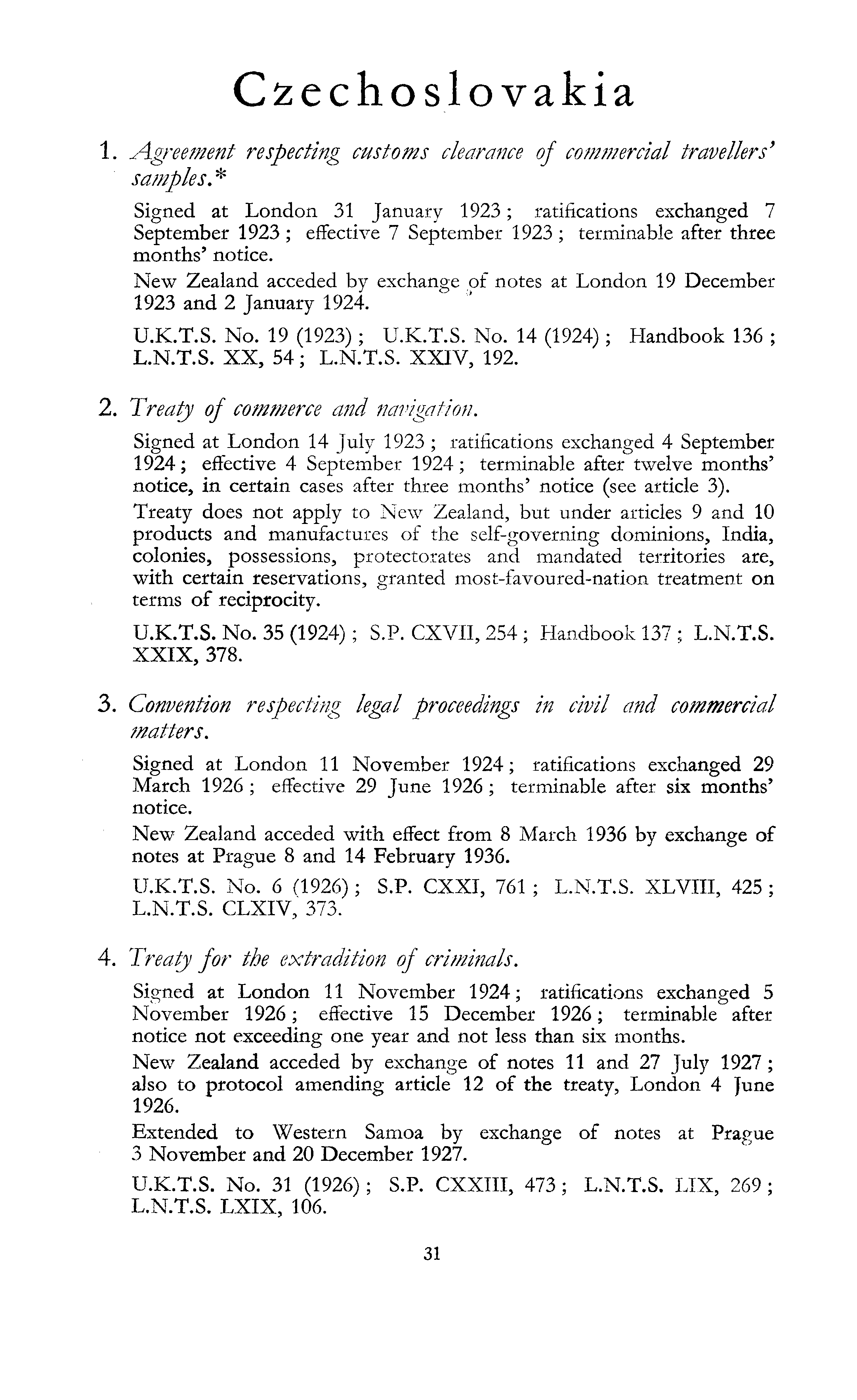 Czechoslovakia 1. Agreement respecting customs clearance of commercial travellers' samples* Signed at London 31 January 1923; ratifications exchanged 7 September 1923 ; effective 7 September 1923 ; terminable after three months' notice. New Zealand acceded by exchange of notes at London 19 December 1923 and 2 January 1924. U.K.T.S. No. 19 (1923) ; U.K.T.S. No. 14 (1924) ; Handbook 136 ; L.N.T.S. XX, 54; L.N.T.S. XXIV, 192. 2. Treaty of commerce and navigation. Signed at London 14 July 1923 ; ratifications exchanged 4 September 1924; effective 4 September 1924; terminable after twelve months' notice, in certain cases after three months' notice (see article 3). Treaty does not apply to New Zealand, but under articles 9 and 10 products and manufactures of the self-governing dominions, India, colonies, possessions, protectorates and mandated territories are, with certain reservations, granted most-favoured-nation treatment on terms of reciprocity. U.K.T.S. No. 35 (1924); S.P. CXVII, 254; Handbook 137 ; L.N.T.S. XXIX, 378. 3. Convention respecting legal proceedings in civil and commercial matters. Signed at London 11 November 1924; ratifications exchanged 29 March 1926 ; effective 29 June 1926; terminable after six months' notice. New Zealand acceded with effect from 8 March 1936 by exchange of notes at Prague 8 and 14 February 1936. U.K.T.S. No. 6 (1926); S.P. CXXI, 761 ; L.N.T.S. XLVIII, 425 ; L.N.T.S. CLXIV, 373. 4. Treaty for the extradition of criminals. Signed at London 11 November 1924; ratifications exchanged 5 November 1926; effective 15 December 1926; terminable after notice not exceeding one year and not less than six months. New Zealand acceded by exchange of notes 11 and 27 July 1927 ; also to protocol amending article 12 of the treaty, London 4 June 1926. Extended to Western Samoa by exchange of notes at Prague 3 November and 20 December 1927. U.K.T.S. No. 31 (1926); S.P. CXXIII, 473; L.N.T.S. LIX, 269; L.N.T.S. LXIX, 106.