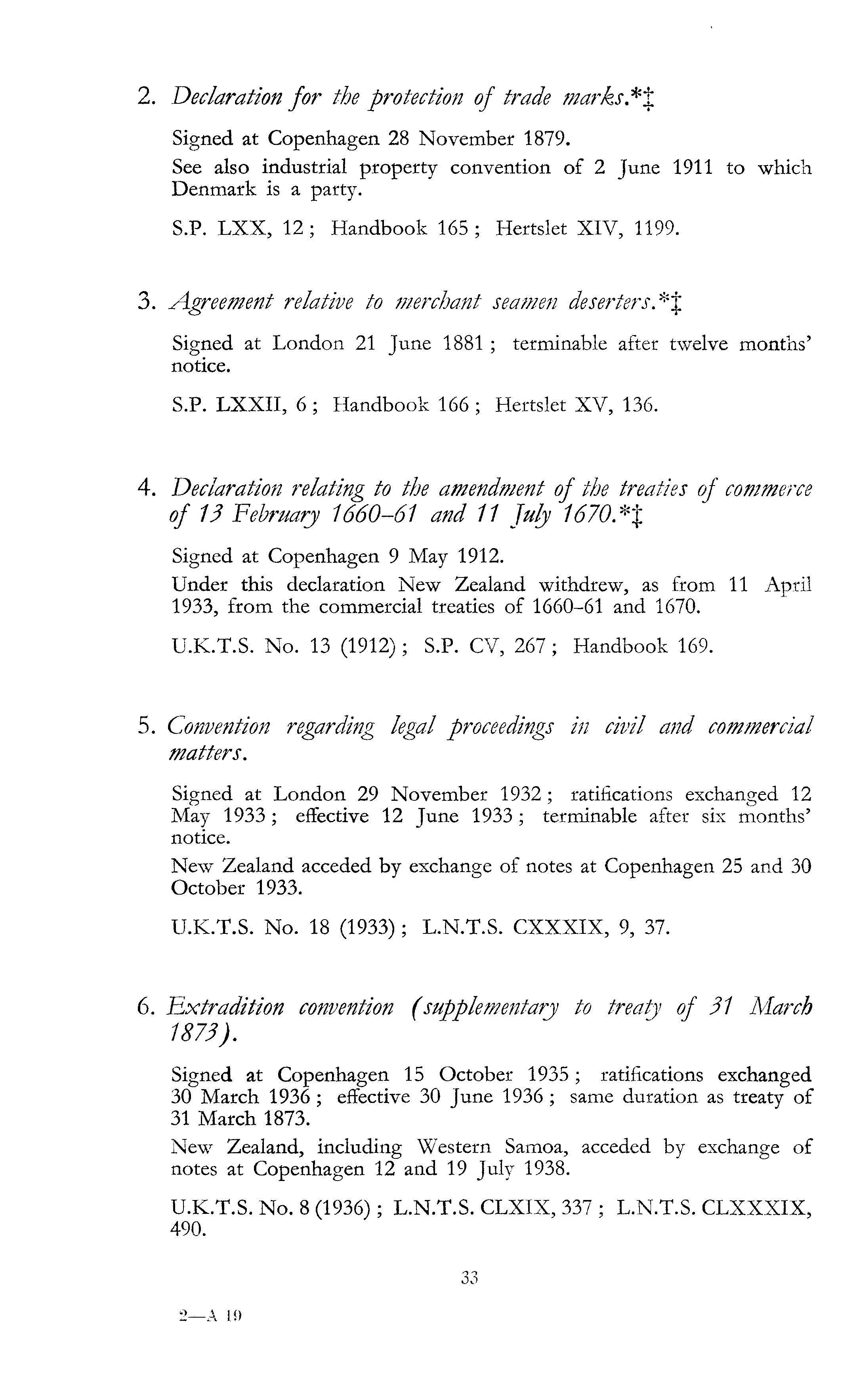 2. Declaration for the protection of trade marks.*% Signed at Copenhagen 28 November 1879. See also industrial property convention of 2 June 1911 to which Denmark is a party. S.P. LXX, 12 ; Handbook 165 ; Hertslet XIV, 1199. 3. Agreement relative to merchant seamen deserters *% Signed at London 21 June 1881 ; terminable after twelve months' notice. S.P. LXXII, 6 ; Handbook 166 ; Hertslet XV, 136. 4. Declaration relating to the amendment of the treaties of commerce of 13 February 1660-61 and 11 July 1670*% Signed at Copenhagen 9 May 1912. Under this declaration New Zealand withdrew, as from 11 April 1933, from the commercial treaties of 1660-61 and 1670. U.K.T.S. No. 13 (1912); S.P. CV, 267; Handbook 169. 5. Convention regarding legal proceedings in civil and commercial matters. Signed at London 29 November 1932 ; ratifications exchanged 12 May 1933 ; effective 12 June 1933 ; terminable after six months' notice. New Zealand acceded by exchange of notes at Copenhagen 25 and 30 October 1933. U.K.T.S. No. 18 (1933); L.N.T.S. CXXXIX, 9, 37. 6. Extradition convention (supplementary to treaty of 31 March 1873). Signed at Copenhagen 15 October 1935; ratifications exchanged 30 March 1936 ; effective 30 June 1936 ; same duration as treaty of 31 March 1873. New Zealand, including Western Samoa, acceded by exchange of notes at Copenhagen 12 and 19 July 1938. U.K.T.S. No. 8 (1936) ; L.N.T.S. CLXIX, 337 ; L.N.T.S. CLXXXIX, 490.