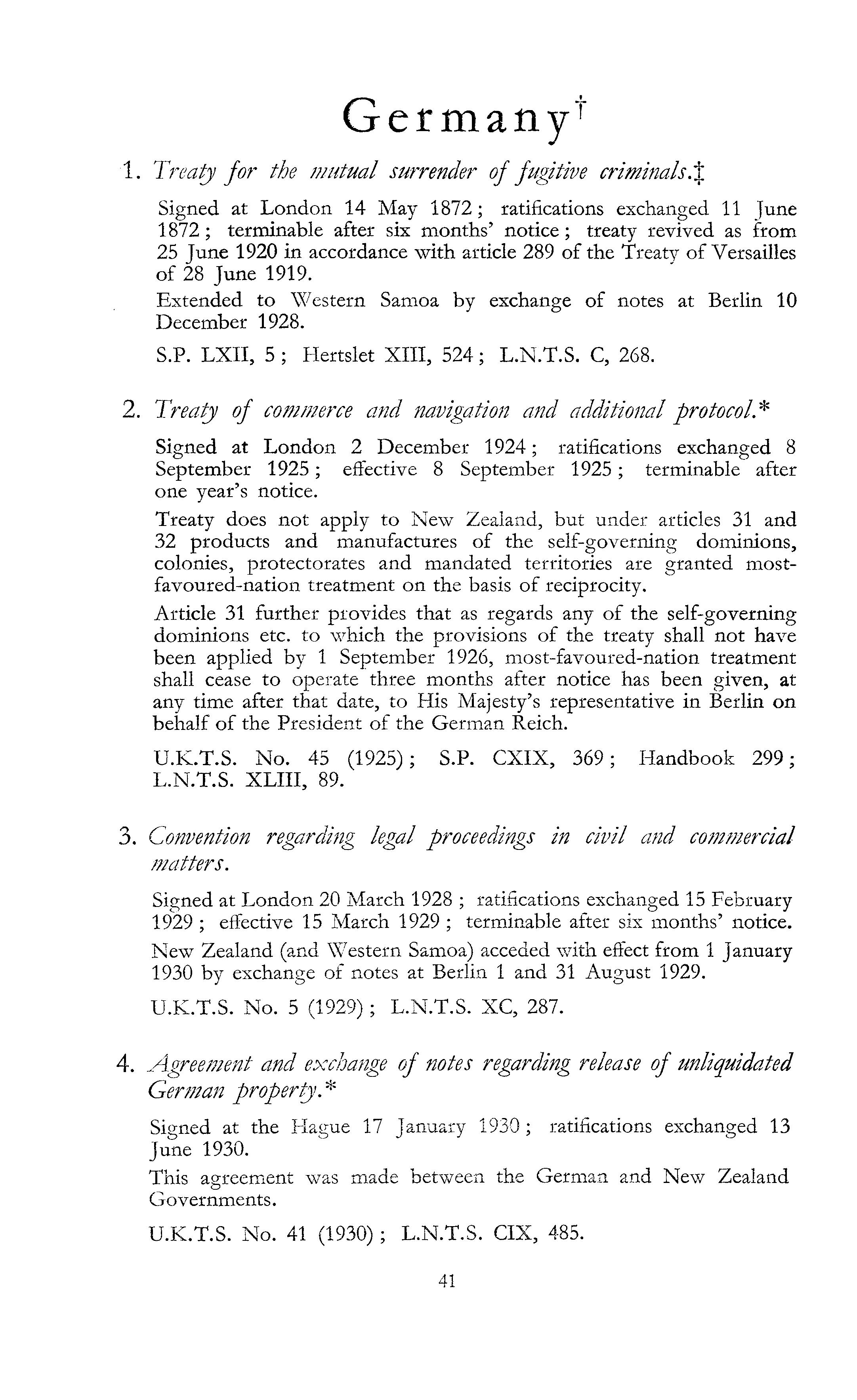 Germany 1 1. Treaty for the mutual surrender of fugitive criminals.% Signed at London 14 May 1872; ratifications exchanged 11 June 1872; terminable after six months' notice; treaty revived as from 25 June 1920 in accordance with article 289 of the Treaty of Versailles of 28 June 1919. Extended to Western Samoa by exchange of notes at Berlin 10 December 1928. S.P. LXII, 5 ; Hertslet XIII, 524; L.N.T.S. C, 268. 2. Treaty of commerce and navigation and additional protocol* Signed at London 2 December 1924; ratifications exchanged 8 September 1925; effective 8 September 1925; terminable after one year's notice. Treaty does not apply to New Zealand, but under articles 31 and 32 products and manufactures of the self-governing dominions, colonies, protectorates and mandated territories are granted most-favoured-nation treatment on the basis of reciprocity. Article 31 further provides that as regards any of the self-governing dominions etc. to which the provisions of the treaty shall not have been applied by 1 September 1926, most-favoured-nation treatment shall cease to operate three months after notice has been given, at any time after that date, to His Majesty's representative in Berlin on behalf of the President of the German Reich. U.K.T.S. No. 45 (1925); S.P. CXIX, 369; Handbook 299; L.N.T.S. XLIII, 89. 3. Convention regarding legal proceedings in civil and co?nmercial matters. Signed at London 20 March 1928 ; ratifications exchanged 15 February 1929 ; effective 15 March 1929 ; terminable after six months' notice. New Zealand (and Western Samoa) acceded with effect from 1 January 1930 by exchange of notes at Berlin 1 and 31 August 1929. U.K.T.S. No. 5 (1929); L.N.T.S. XC, 287. 4. Agreement and exchange of notes regarding release of unliquidated German property. * Signed at the Hague 17 January 1930 ; ratifications exchanged 13 June 1930. This agreement was made between the German and New Zealand Governments. U.K.T.S. No. 41 (1930) ; L.N.T.S. CIX, 485.