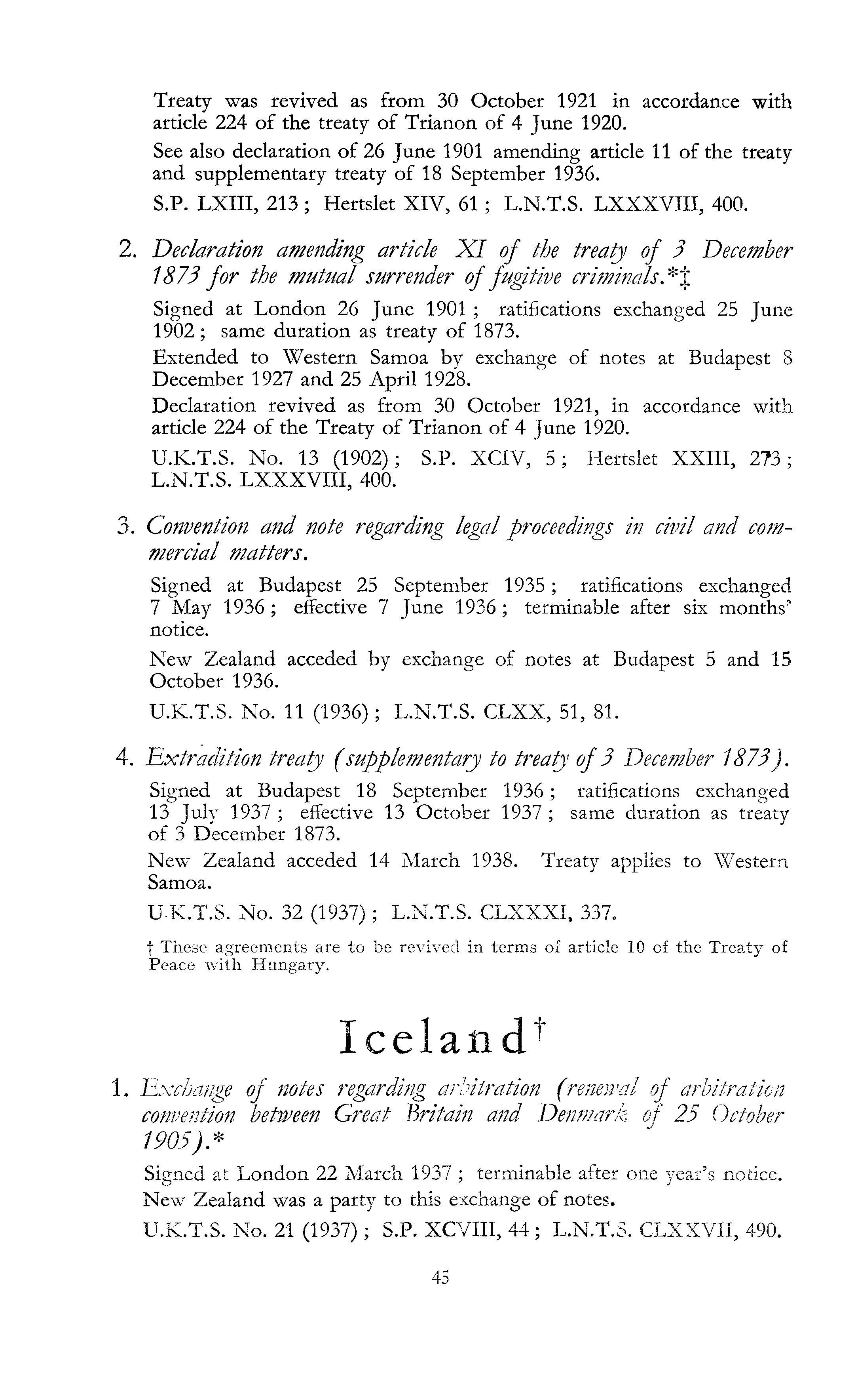 Treaty was revived as from 30 October 1921 in accordance with article 224 of the treaty of Trianon of 4 June 1920. See also declaration of 26 June 1901 amending article 11 of the treaty and supplementary treaty of 18 September 1936. S.P. LXIII, 213 ; Hertslet XIV, 61; L.N.T.S. LXXXVIII, 400. 2. Declaration amending article XI of the treaty of 3 December 1873 for the mutual surrender of fugitive criminals .*% Signed at London 26 June 1901 ; ratifications exchanged 25 June 1902 ; same duration as treaty of 1873. Extended to Western Samoa by exchange of notes at Budapest 8 December 1927 and 25 April 1928. Declaration revived as from 30 October 1921, in accordance with article 224 of the Treaty of Trianon of 4 June 1920. U.K.T.S. No. 13 (1902); S.P. XCIV, 5; Hertslet XXIII, 2?3; L.N.T.S. LXXXVIII, 400. 3. Convention and note regarding legal proceedings in civil and commercial matters. Signed at Budapest 25 September 1935; ratifications exchanged 7 May 1936; effective 7 June 1936 ; terminable after six months" notice. New Zealand acceded by exchange of notes at Budapest 5 and 15 October 1936. U.K.T.S. No. 11 (1936); L.N.T.S. CLXX, 51, 81. 4. Extradition treaty (supplementary to treaty of 3 December 1873). Signed at Budapest 18 September 1936; ratifications exchanged 13 July 1937 ; effective 13 October 1937 ; same duration as treaty of 3 December 1873. New Zealand acceded 14 March 1938. Treaty applies to Western Samoa. U-K.T.S. No. 32 (1937); L.N.T.S. CLXXXI, 337. t These agreements are to be revived in terms of article 10 of the Treaty of Peace with Hungary. Iceland r 1. Exchange of notes regarding arbitration (renewal of arbitration convention between Great Britain and Denmark of 25 October 1905).* Signed at London 22 March 1937 ; terminable after one year's notice. New Zealand was a party to this exchange of notes. U.K.T.S. No. 21 (1937) ; S.P. XCVIII, 44; L.N.T.S. CLXXVII, 490.
