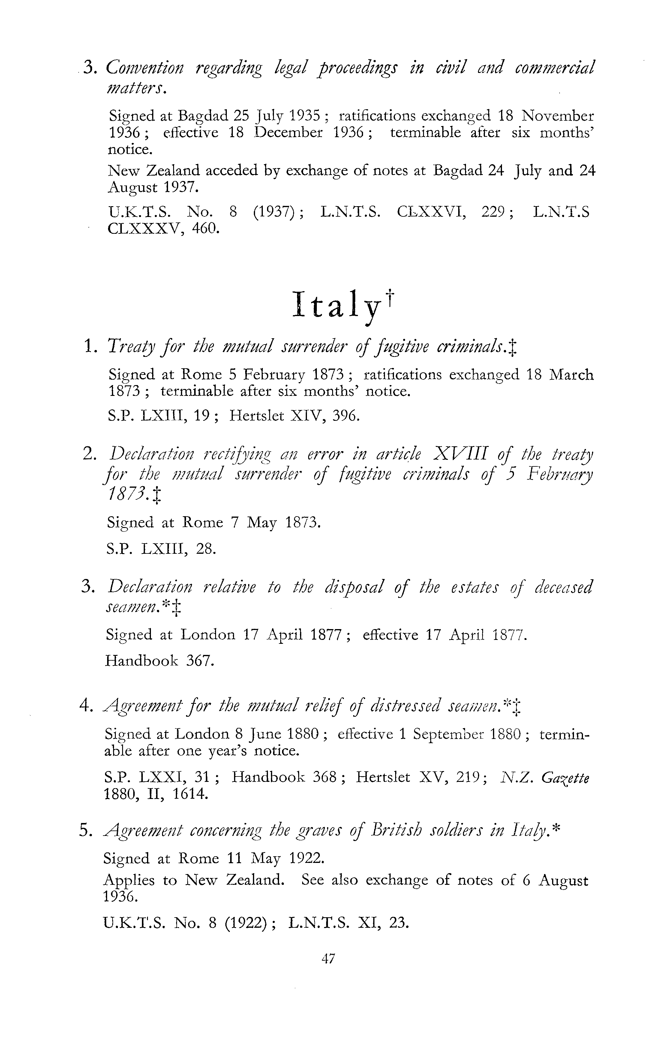 3. Convention regarding legal proceedings in civil and commercial matters. Signed at Bagdad 25 July 1935 ; ratifications exchanged 18 November 1936; effective 18 December 1936; terminable after six months' notice. New Zealand acceded by exchange of notes at Bagdad 24 July and 24 August 1937. U.K.T.S. No. 8 (1937); L.N.T.S. CLXXVI, 229; L.N.T.S • CLXXXV, 460. Italy 1 1. Treaty for the mutual surrender of fugitive criminals.% Signed at Rome 5 February 1873 ; ratifications exchanged 18 March 1873 ; terminable after six months' notice. S.P. LXIII, 19 ; Hertslet XIV, 396. 2. Declaration rectifying an error in article XVIII of the treaty for the mutual surrender of fugitive criminals of 5 February 1873.% Signed at Rome 7 May 1873. S.P. LXIII, 28. 3. Declaration relative to the disposal of the estates of deceased seamen*% Signed at London 17 April 1877 ; effective 17 April 1877. Handbook 367. 4. Agreement for the mutual relief of distressed seamen.*\ Signed at London 8 June 1880 ; effective 1 September 1880 ; terminable after one year's notice. S.P. LXXI, 31 ; Handbook 368 ; Hertslet XV, 219; N.Z. Gazette 1880, 11, 1614. 5. Agreement concerning the graves of British soldiers in Italy* Signed at Rome 11 May 1922. Applies to New Zealand. See also exchange of notes of 6 August 1936. U.K.T.S. No. 8 (1922) ; L.N.T.S. XI, 23.