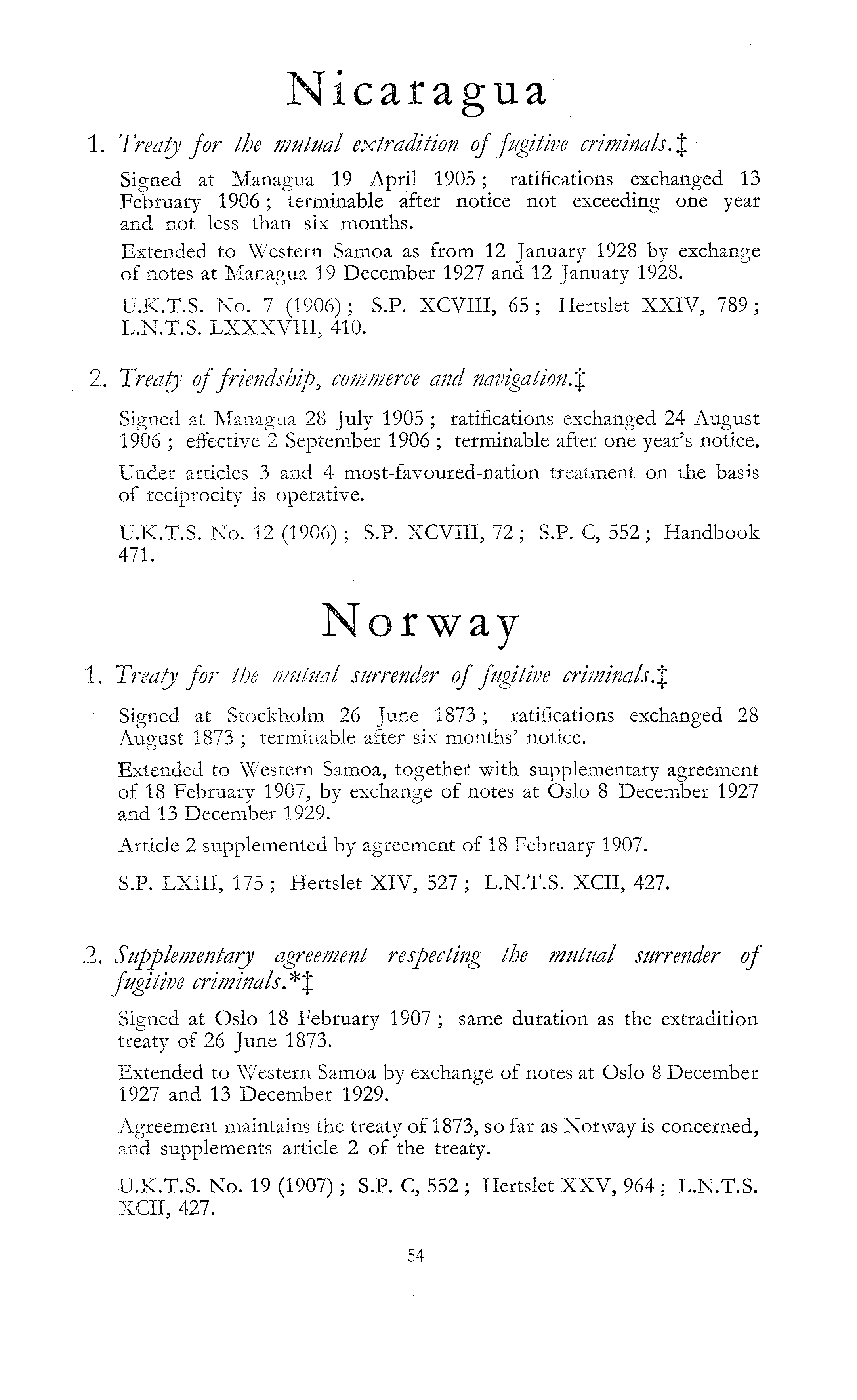 Nicaragua 1. Treaty for the mutual extradition of fugitive criminals. % Signed at Managua 19 April 1905 ; ratifications exchanged 13 February 1906; terminable after notice not exceeding one year and not less than six months. Extended to Western Samoa as from 12 January 1928 by exchange of notes at Managua 19 December 1927 and 12 January 1928. U.K.T.S. No. 7 (1906); S.P. XCVIII, 65 ; Hertslet XXIV, 789; L.N.T.S. LXXXVIII, 410. 2. Treaty of friendship, commerce and navigation.% Signed at Managua 28 July 1905 ; ratifications exchanged 24 August 1906 ; effective 2 September 1906 ; terminable after one year's notice. Under articles 3 and 4 most-favoured-nation treatment on the basis of reciprocity is operative. U.K.T.S. No. 12 (1906); S.P. XCVIII, 72 ; S.P. C, 552 ; Handbook 471. Norway 1. Treaty for the mutual surrender of fugitive criminals.% Signed at Stockholm 26 June 1873; ratifications exchanged 28 August 1873 ; terminable after six months' notice. Extended to Western Samoa, together with supplementary agreement of 18 February 1907, by exchange of notes at Oslo 8 December 1927 and 13 December 1929. Article 2 supplemented by agreement of 18 February 1907. S.P. LXIII, 175 ; Hertslet XIV, 527 ; L.N.T.S. XCII, 427. 2. Supplementary agreement respecting the mutual surrender, of fugitive criminals. * J Signed at Oslo 18 February 1907 ; same duration as the extradition treaty of 26 June 1873. Extended to Western Samoa by exchange of notes at Oslo 8 December 1927 and 13 December 1929. Agreement maintains the treaty of 1873, so far as Norway is concerned, and supplements article 2 of the treaty. U.K.T.S. No. 19 (1907); S.P. C, 552 ; Hertslet XXV, 964 ; L.N.T.S. XCII, 427.