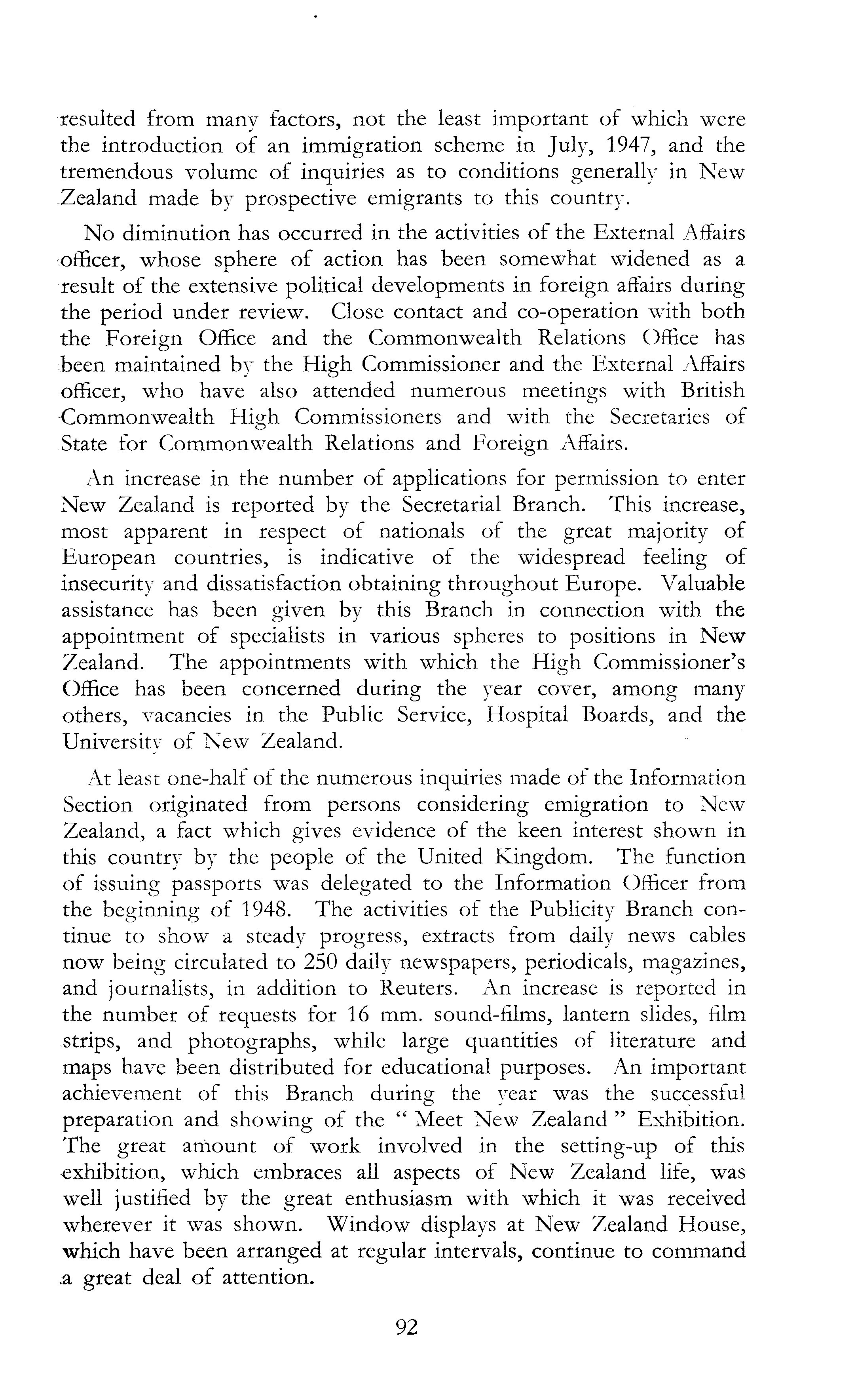 resulted from many factors, not the least important of which were the introduction of an immigration scheme in July, 1947, and the tremendous volume of inquiries as to conditions generally in New .Zealand made by prospective emigrants to this country. No diminution has occurred in the activities of the External Affairs officer, whose sphere of action has been somewhat widened as a result of the extensive political developments in foreign affairs during the period under review. Close contact and co-operation with both the Foreign Office and the Commonwealth Relations Office has ;been maintained by the High Commissioner and the External Affairs officer, who have also attended numerous meetings with British -Commonwealth High Commissioners and with the Secretaries of .State for Commonwealth Relations and Foreign Affairs. An increase in the number of applications for permission to enter New Zealand is reported by the Secretarial Branch. This increase, most apparent in respect of nationals of the great majority of European countries, is indicative of the widespread feeling of insecurity and dissatisfaction obtaining throughout Europe. Valuable assistance has been given by this Branch in connection with the appointment of specialists in various spheres to positions in New Zealand. The appointments with which the High Commissioner's Office has been concerned during the year cover, among many others, vacancies in the Public Service, Hospital Boards, and the University of New Zealand. At least one-half of the numerous inquiries made of the Information Section originated from persons considering emigration to New Zealand, a fact which gives evidence of the keen interest shown in this country by the people of the United Kingdom. The function of issuing passports was delegated to the Information Officer from the beginning of 1948. The activities of the Publicity Branch continue to show a steady progress, extracts from daily news cables now being circulated to 250 daily newspapers, periodicals, magazines, and journalists, in addition to Reuters. An increase is reported in the number of requests for 16 mm. sound-films, lantern slides, film strips, and photographs, while large quantities of literature and maps have been distributed for educational purposes. An important achievement of this Branch during the year was the successful preparation and showing of the " Meet New Zealand " Exhibition. The great amount of work involved in the setting-up of this -exhibition, which embraces all aspects of New Zealand life, was well justified by the great enthusiasm with which it was received wherever it was shown. Window displays at New Zealand House, which have been arranged at regular intervals, continue to command .a great deal of attention.