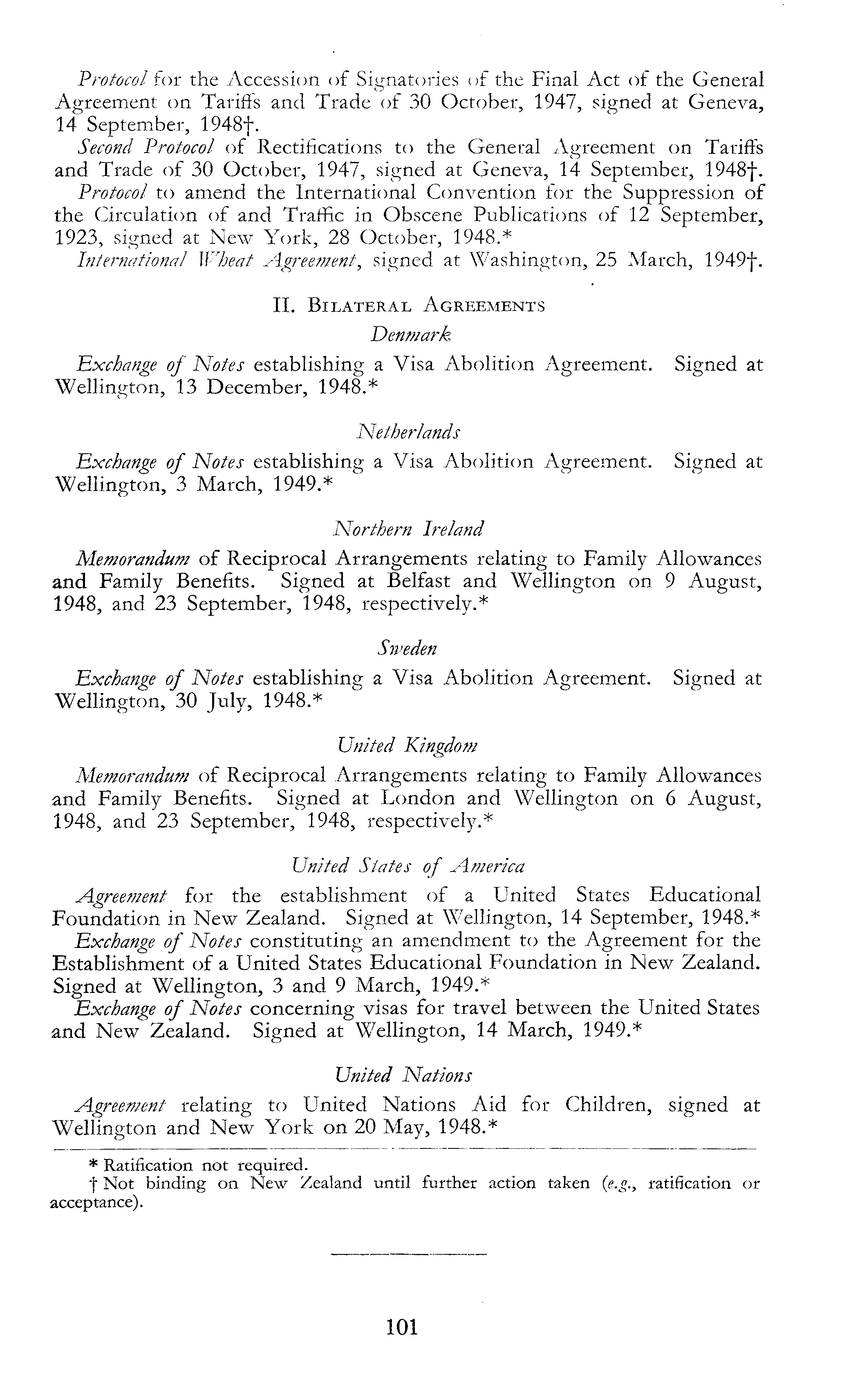 .Protocol for the Accession of Signatories of the Final Act of the General Agreement on Tariffs and Trade of 30 October, 1947, signed at Geneva, 14 September, 1948f. Second Protocol of Rectifications to the General Agreement on Tariffs and Trade of 30 October, 1947, signed at Geneva, 14 September, 1948f. Protocol to amend the International Convention for the Suppression of the Circulation of and Traffic in Obscene Publications of 12 September, 1923, signed at New York, 28 October, 1948.* International Wheat Agreement, signed at Washington, 25 March, 1949f. 11. Bilateral Agreements Denmark Exchange of Notes establishing a Visa Abolition Agreement. Signed at Wellington, 13 December, 1948.* Netherlands Exchange of Notes establishing a Visa Abolition Agreement. Signed at Wellington, 3 March, 1949.* Northern Ireland Memorandum of Reciprocal Arrangements relating to Family Allowances and Family Benefits. Signed at Belfast and Wellington on 9 August, 1948, and 23 September, 1948, respectively.* Sweden Exchange of Notes establishing a Visa Abolition Agreement. Signed at Wellington, 30 July, 1948.* United Kingdom Memorandum of Reciprocal Arrangements relating to Family Allowances •and Family Benefits. Signed at London and Wellington on 6 August, 1948, and 23 September, 1948, respectively.* United States of America Agreement for the establishment of a United States Educational Foundation in New Zealand. Signed at Wellington, 14 September, 1948.* Exchange of Notes constituting an amendment to the Agreement for the Establishment of a United States Educational Foundation in New Zealand. Signed at Wellington, 3 and 9 March, 1949.* Exchange of Notes concerning visas for travel between the United States and New Zealand. Signed at Wellington, 14 March, 1949.* United Nations Agreement relating to United Nations Aid for Children, signed at Wellington and New York on 20 May, 1948.*