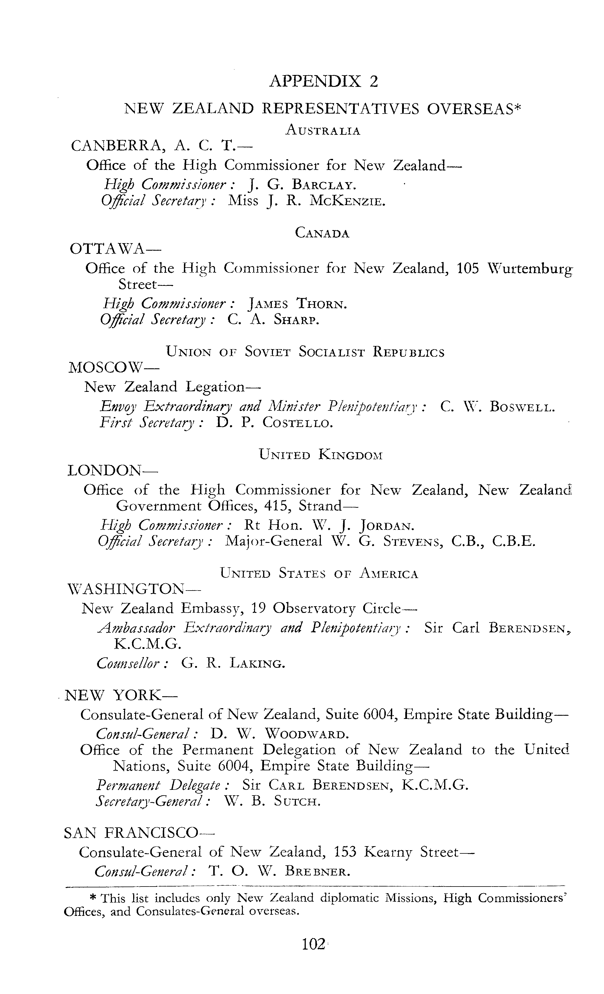 APPENDIX 2 NEW ZEALAND REPRESENTATIVES OVERSEAS* Australia CANBERRA, A. C. T.— Office of the High Commissioner for New Zealand— High Commissioner: J. G. Barclay. Official Secretary : Miss J. R. McKenzie. Canada OTTAWA— Office of the High Commissioner for New Zealand, 105 Wurtemburg Street — High Commissioner : James Thorn. Official Secretary : C. A. Sharp. Union of Soviet Socialist Republics MOSCOW— New Zealand Legation— Envoy Extraordinary and Minister Plenipotentiary : C. W. Boswell. First Secretary: D. P. Costello. United Kingdom LONDON— Office of the High Commissioner for New Zealand, New Zealand Government Offices, 415, Strand — High Commissioner: Rt Hon. W. J. Jordan. Official Secretary : Major-General W. G. Stevens, C.8., C.B.E. United States of America WASHINGTON— New Zealand Embassy, 19 Observatory Circle— Ambassador Extraordinary and Plenipotentiary : Sir Carl Berendsen, K.C.M.G. Counsellor: G. R. Laking. NEW YORK— Consulate-General of New Zealand, Suite 6004, Empire State Building— Consul-General: D. W. Woodward. Office of the Permanent Delegation of New Zealand to the United Nations, Suite 6004, Empire State Building— Permanent Delegate : Sir Carl Berendsen, K.C.M.G. Secretary-General: W. B. Sutch. SAN FRANCISCO— Consulate-General of New Zealand, 153 Kearny Street — Consul-General: T. O. W. Brebner.